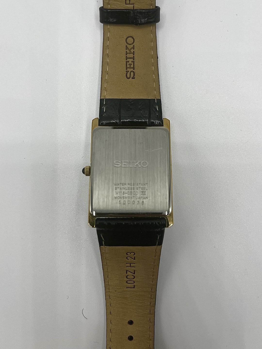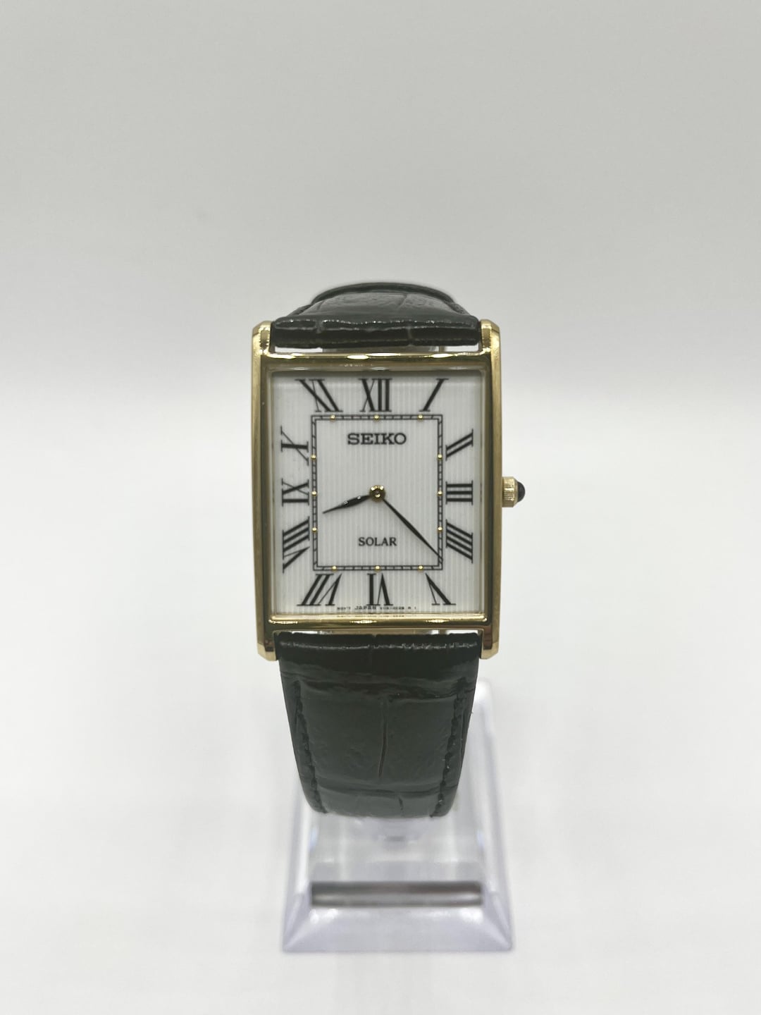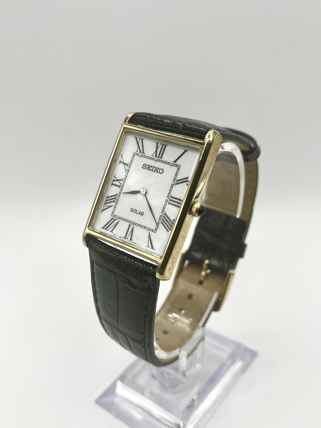 Seiko Solar Tank Watch SUP880. Watch only, no box or papers. Functions as intended with superb accuracy. • Black leather strap by Seiko • Rectangular gold-tone stainless steel case, 29mm • White dial with black Roman numerals, two hands and logo • Solar-powered quartz movement • Water resistant to 30 meters $222, plus preferred shipping No trades. Thank you. Item is located in Los Angeles for pickup. Shipping available. FaceTime on request. Electronic payments accepted. No returns; sold as is.
