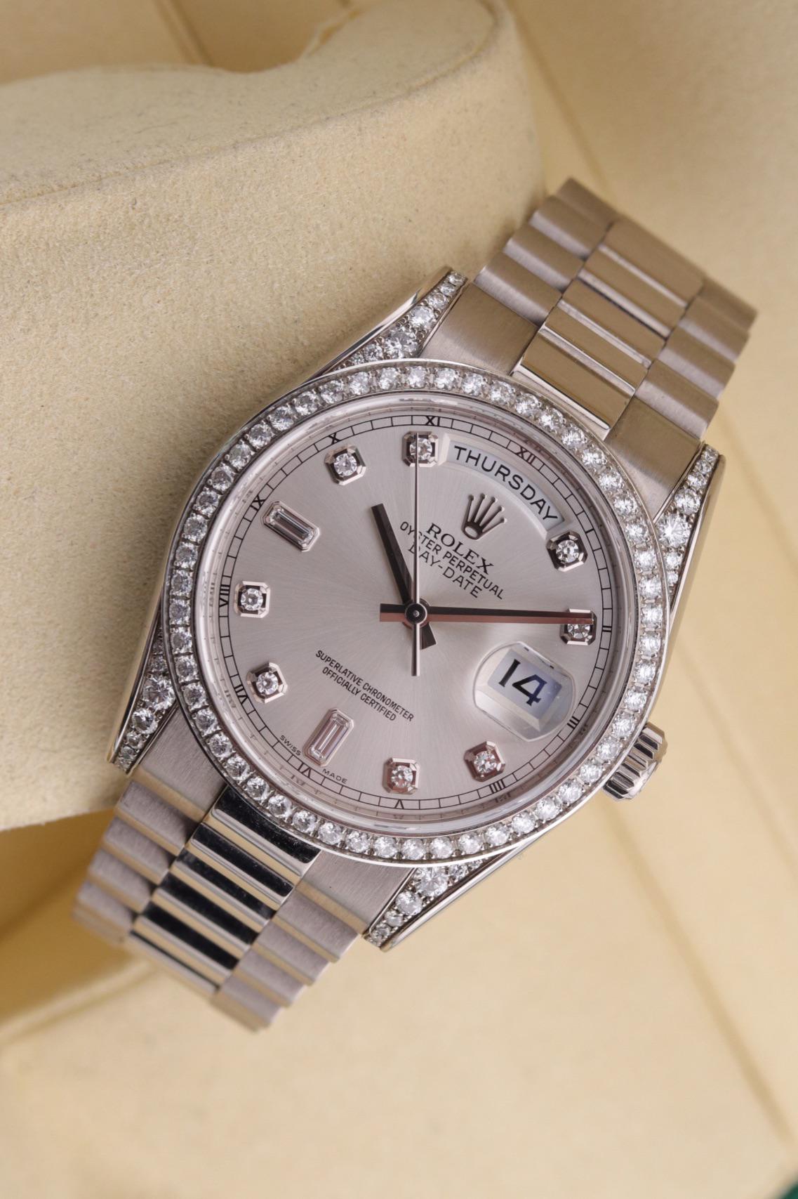 Up for sale is a **💎2014 Rolex Day-Date 118389 All Factory Diamonds** Size: 36mm Location: U.S. / Georgia Condition: Excellent condition overall. The sapphire crystal is clean with no scratches or chips. The case has factory diamonds. The bezel and dial are also factory. Bracelet is short one link and shows no stretch. Keeping perfect time. Comes with box and warranty card, dated 2014. [Pictures](https://www.dropbox.com/scl/fo/tea1pv09mvnzuygfy0em0/AB8EAsJ_7buxZe60BLosCiw?rlkey=8jyn4lzekn7al4za8l141uc8a&st=apzhjm8z&dl=0) [Timestamp](https://www.dropbox.com/scl/fi/tmfzihi9oq78oawjpxxkv/IMG_2060.HEIC?rlkey=u8ghj7asf633n5rvlbw35iz1o&st=xv0e2jva&dl=0) Price: $34,500 payment methods accepted are Zelle, Paypal G&S+3.5%(for qualified buyers), and Bank Wire. I will also accept cryptocurrency and silver/gold bullion. I ship within 24hrs of receiving payment. I’m willing to ship almost anywhere with buyer paying shipping Any watch offered can be polished and serviced prior to shipping for an additional cost. Lead time varies. READ BEFORE SENDING TRADE OFFERS: If you send me a trade offer and it has no price or “trade value” it will be ignored. No trades on or for watches under $1k. GA residents may be required to pay state sales tax IG: thewatchtradingpost Please feel free to reach out to me with any questions or concerns at [email protected] or message me privately on here and I’ll respond ASAP. I’m also open to phone calls and FaceTimes during the day. There has been ongoing issues with Reddit chat/messages recently. Email is the fastest way to get into contact with me.