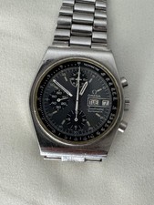 The Omega reference 176.0012 Mark IV was introduced in 1973 and ended production in 1974 - a short run to say the least comes on old school Omega bracelet which I understand is not common to find with these but then again I'm not an expert. I've had it on a few different options that work pretty well - pictures below the Mark IV is built around the Lemania 1340 (AKA Omega c.1040) automatic movement, which features a central minute counter hand (not to be confused with the later 4.5 which ditches the central minute counter for a traditional minute counter subdial) an hour totalizer at 6 and a very cool combination running seconds and AM/PM display at 9 Chrono is snappy to operate and zero's perfectly Tourneau case is 41.4 diameter and 45 hooded lug to hooded lug Case is lightly touched up - beautiful sunburst brushing on top and horizontal brushing on the sides and a crisp polished section to separate Baton markers have patinad to a wonderful light khaki and is a perfect compliment to the black dial and white hands service history unknown but I haven't had any problems what you should know: bracelet has a little stretch - not much - but hey, it's 50 yrs old. crystal, again, 50 years old, is not perfect - very small chips on the very outer edge of the crystal at 11 and 3 - 1) you're not taking this in the water anyway and 2) probably wouldn't notice unless you are looking for them watch and bracelet only Asking $3000 on the old school Omega bracelet Or Best Offer