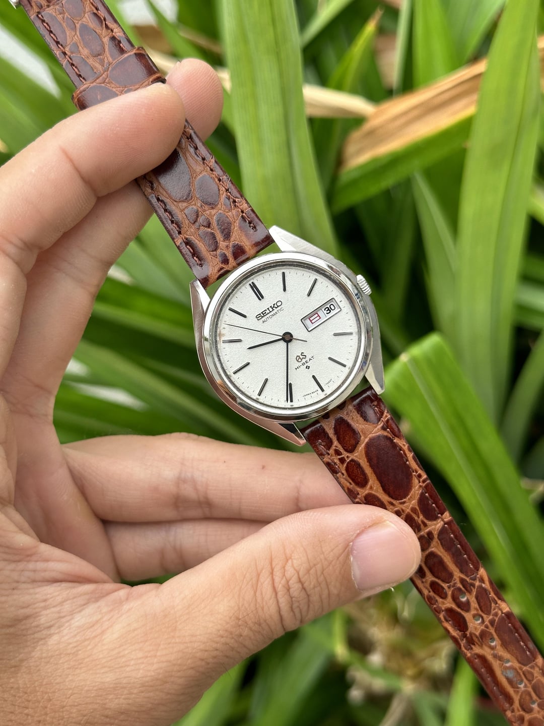 Up for sale, a rare snowflake / sand texture dial Grand Seiko Hi-beat 28800bph automatic. Produced in February 1974. • Movement: 5646-7030 • Quickset working properly, with Japanese kanji or English day wheel when selected • Case: 36mm • Lug to lug: 41mm • Thickness: 9.5mm • Lug width: 17mm • Original GS crown, original crystal free from scratch • Original snowflake / sand dial • Serviced: December 2024 • Performance: +/-5spd • Come with original Seiko exotic calfskin leather strap Timestamp: https://photos.google.com/share/AF1QipMN8yMCWDRMokxt2iC4o3y27YE6v03WK57wY9cqNjTyHc7DXI-0nnbvJQ789sQnlg?key=QW81bHJaYUIzQmZOQnppWnJuemwzSGVOaTN5eG5n Album: https://photos.google.com/share/AF1QipMXCVgYFdCsU-3JuYsrBtmrcQh2-sH21pzE9qzVJLzD9rwzpn34Vo1sNOGaa7wRMQ?key=M0tpX05kLWlTdXpFc2ZLelFKYTdRekZFcDVTdzd3 I’ve been selling watches in this sub years now, please check my transaction flair. I’m asking for USD 1100 net plus shipping, via PayPal F&F or direct wire. Thanks! DHL Express -> US conus, North America, Europe, Australia: 3-5 days DHL Express -> UAE Dubai: 1-2 days