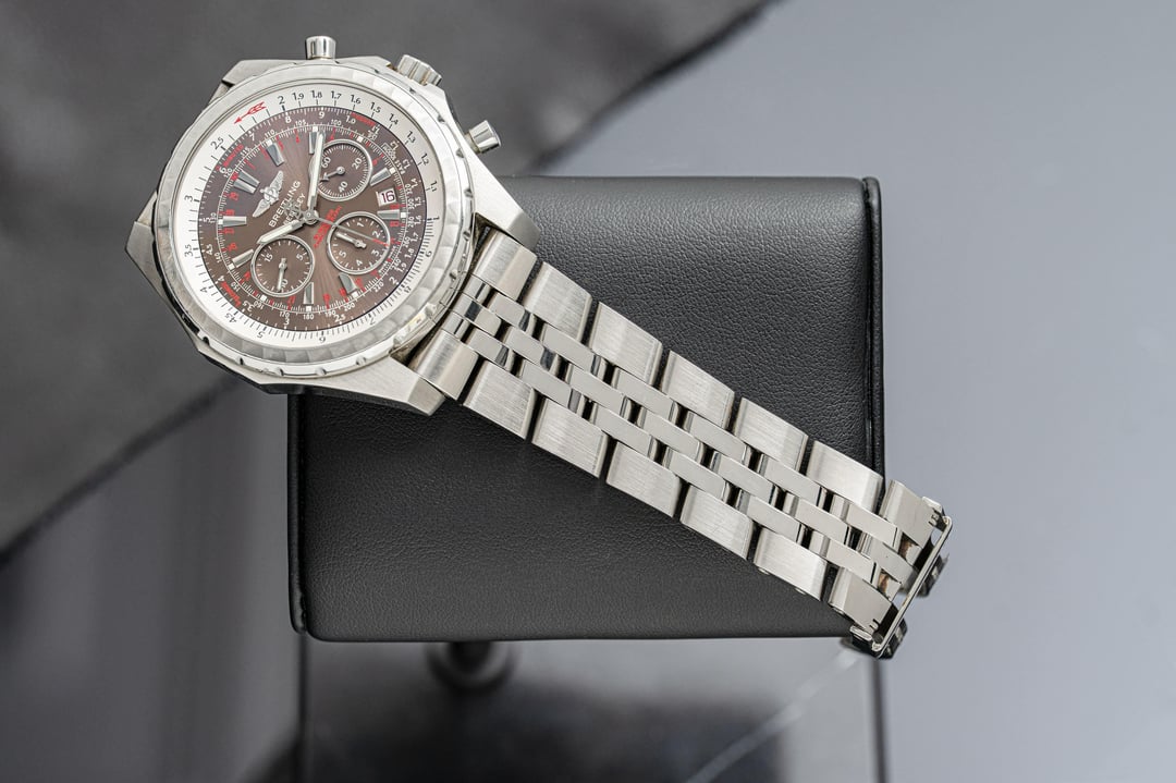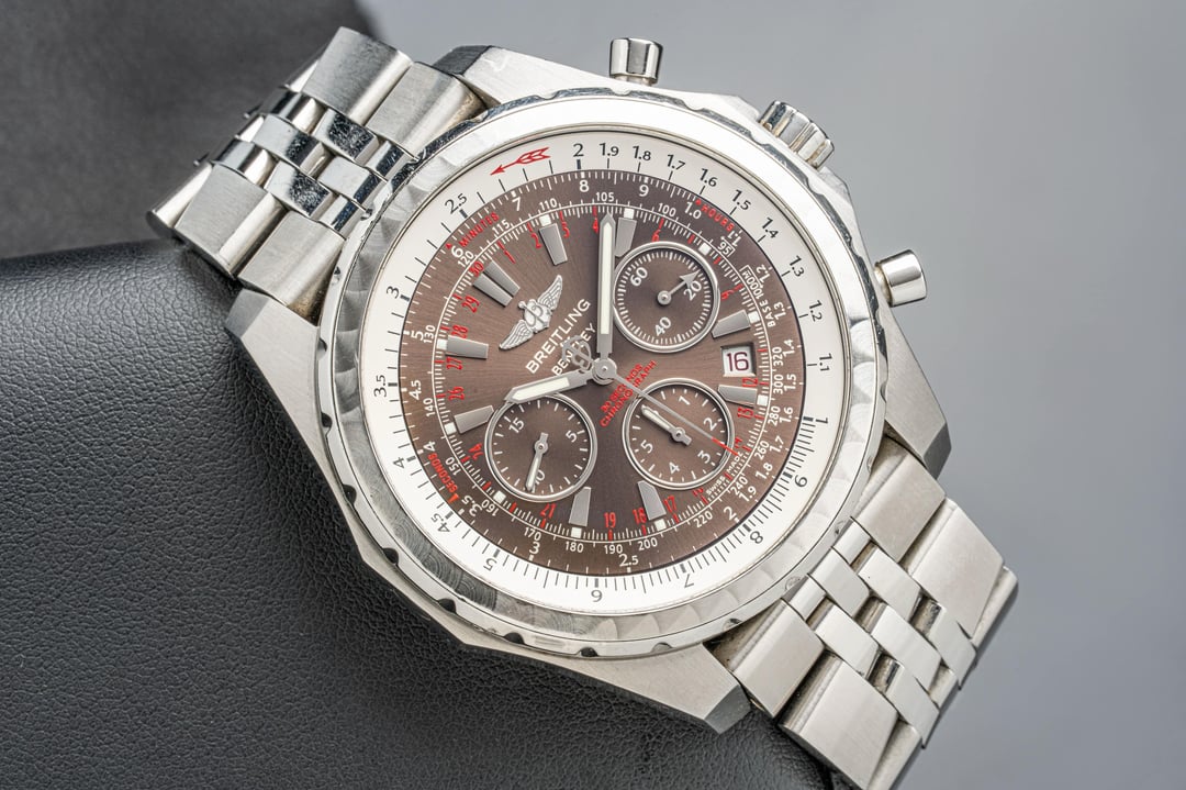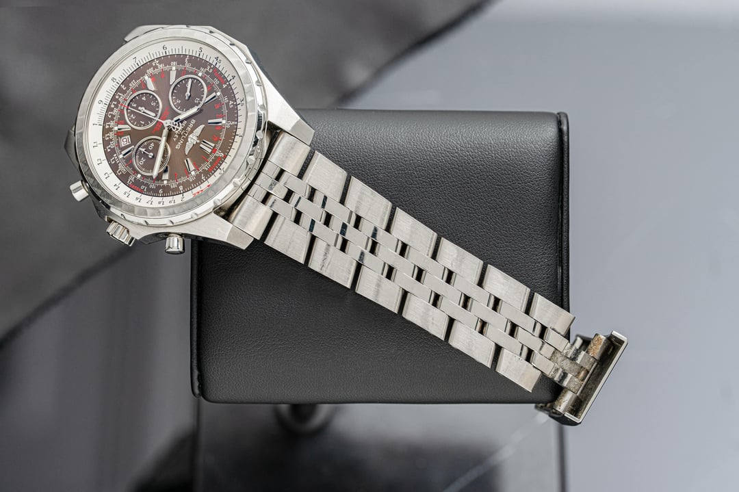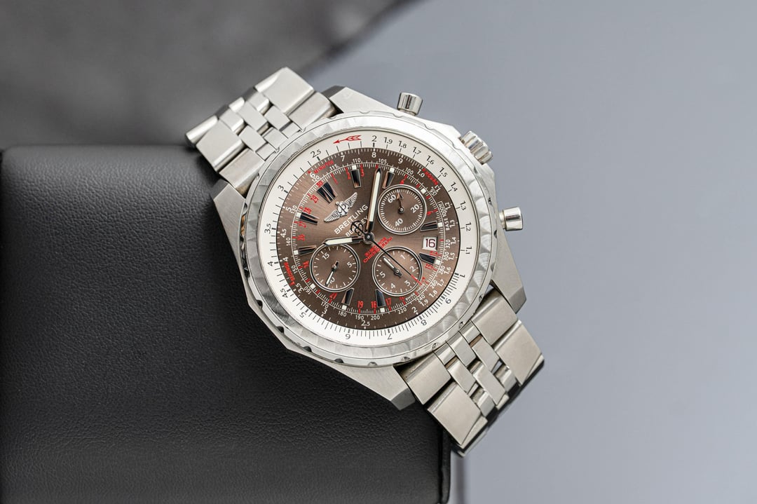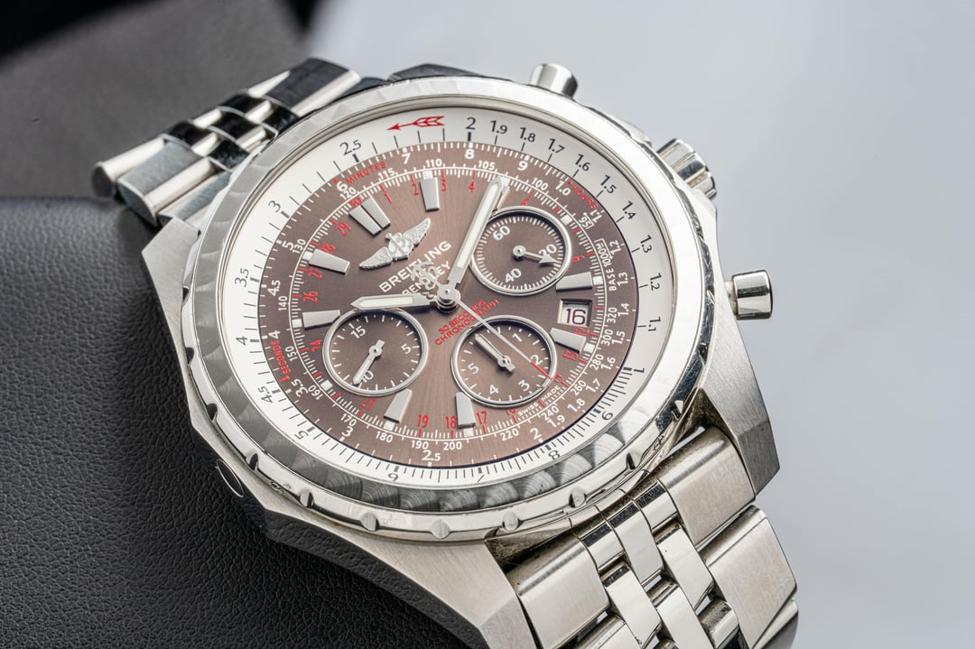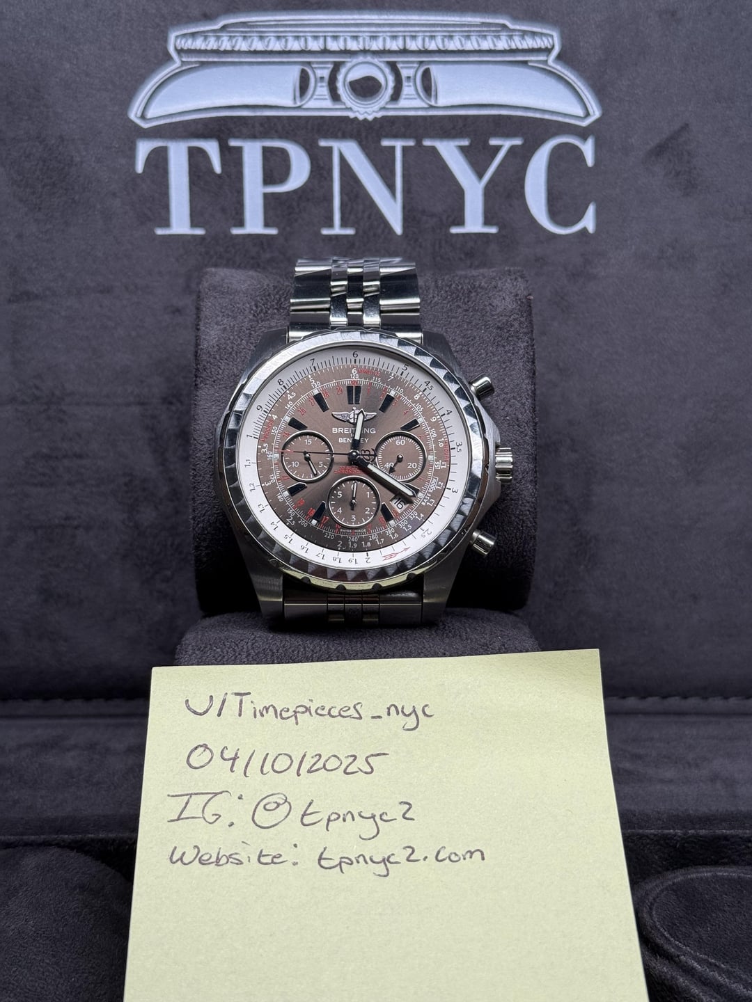 Hey r/Watchexchange! The Breitling for Bentley A25363 is a bold fusion of high-performance watchmaking and luxury automotive design. Crafted in a 48.7mm stainless steel case, it features a rich sunburst brown dial with contrasting silver subdials, applied indices, and red accents that enhance its sporty sophistication. The watch is equipped with a bidirectional rotating “variable tachometer” bezel—unique to this collection—designed for calculating average speeds based on time, distance, or speed. Powered by the COSC-certified Breitling Caliber 25B automatic chronograph movement, it offers a 42-hour power reserve and precise timing capabilities. The date aperture at 3 o’clock and knurled bezel pay homage to Bentley’s iconic dashboard styling. Finished with a robust five-link stainless steel bracelet, the A25363 is as much a statement of refinement as it is of functionality—built for those who appreciate both horsepower and horology. — **Year:** N/A **Physical condition:** Preowned, please refer to the photos for the most accurate account of condition **Mechanical Condition:** Running well **Box and Papers:** Box and manuals **Price: $3,200**. **Payment methods:** Zelle, Bank Wire, Crypto (USDT + 3%). We ship within 24 hours after payment clears. Willing to ship anywhere internationally if buyer covers shipping. Additional ways to contact us: Corresponding on Reddit can be a pain sometimes. If you have further questions and need another way to connect, you can visit our website tpnyc2.com or Instagram @tpnyc2!