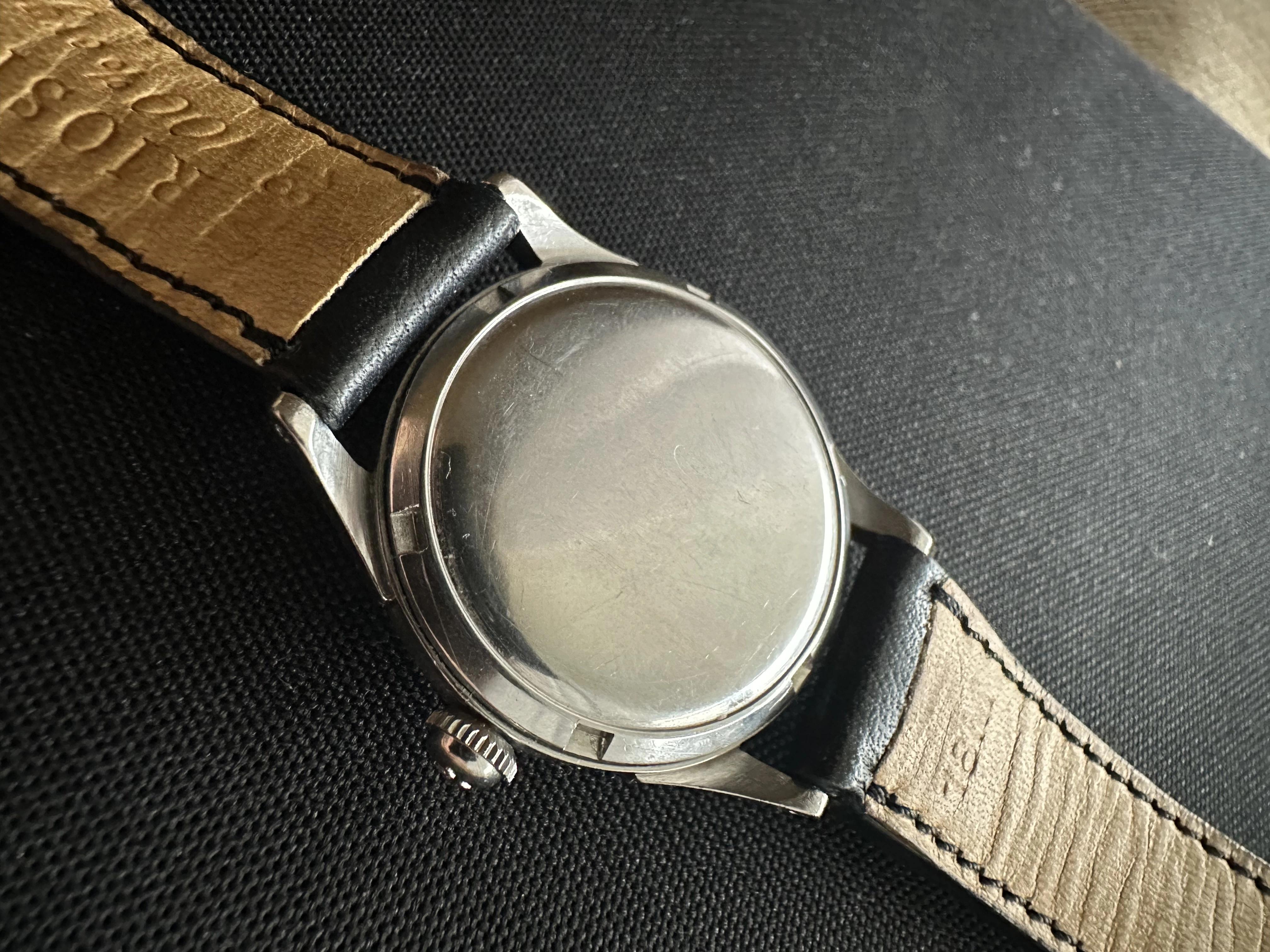 Good day all. Up for sale is something special - a 1952 Seamaster with a flawless honeycomb dial, perfect railroad track, silver Breguet numerals at 3, 6, 9 and 12, silver shark markers, Dauphine hands, and gorgeous radium lume. The case appears to be unpolished, with drilled lugs, and the correct Omega crown. You want more? Ok, how about this: the 1952 caliber 354 bumper was completely serviced from my watchmaker on 9/25/2023. All worn parts were replaced, the service paperwork will be included, and the watch is presently running at +6 SPD.