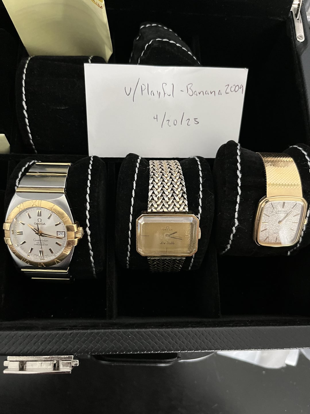 Hi everyone, Today I have a small watch collection up for grabs and hoping for my first transaction on here! 1. Omega Constellation “Double Eagle” 18k gold & stainless steel - Comes with full set, including original receipt, box, cards, and links - Reference: 1201.30.00 - Automatic self-winding co-axial movement. 2500 caliber. 27 jewels - 35mm case - $2250 shipped 2. Omega De Ville x Andrew Grima designed dress watch - Comes with original bracelet with added security link - Manual wind, 17 jewels - 32mm case - $400 shipped 3. Seiko Lassale with Textured dial and integrated gold mesh bracelet - Reference: 5930-5527 - Quartz, 6 jewels - 30mm case - $225 shipped I accept PayPal or Zelle. Shipping with USPS priority. Please send me a dm with any questions! Thank you