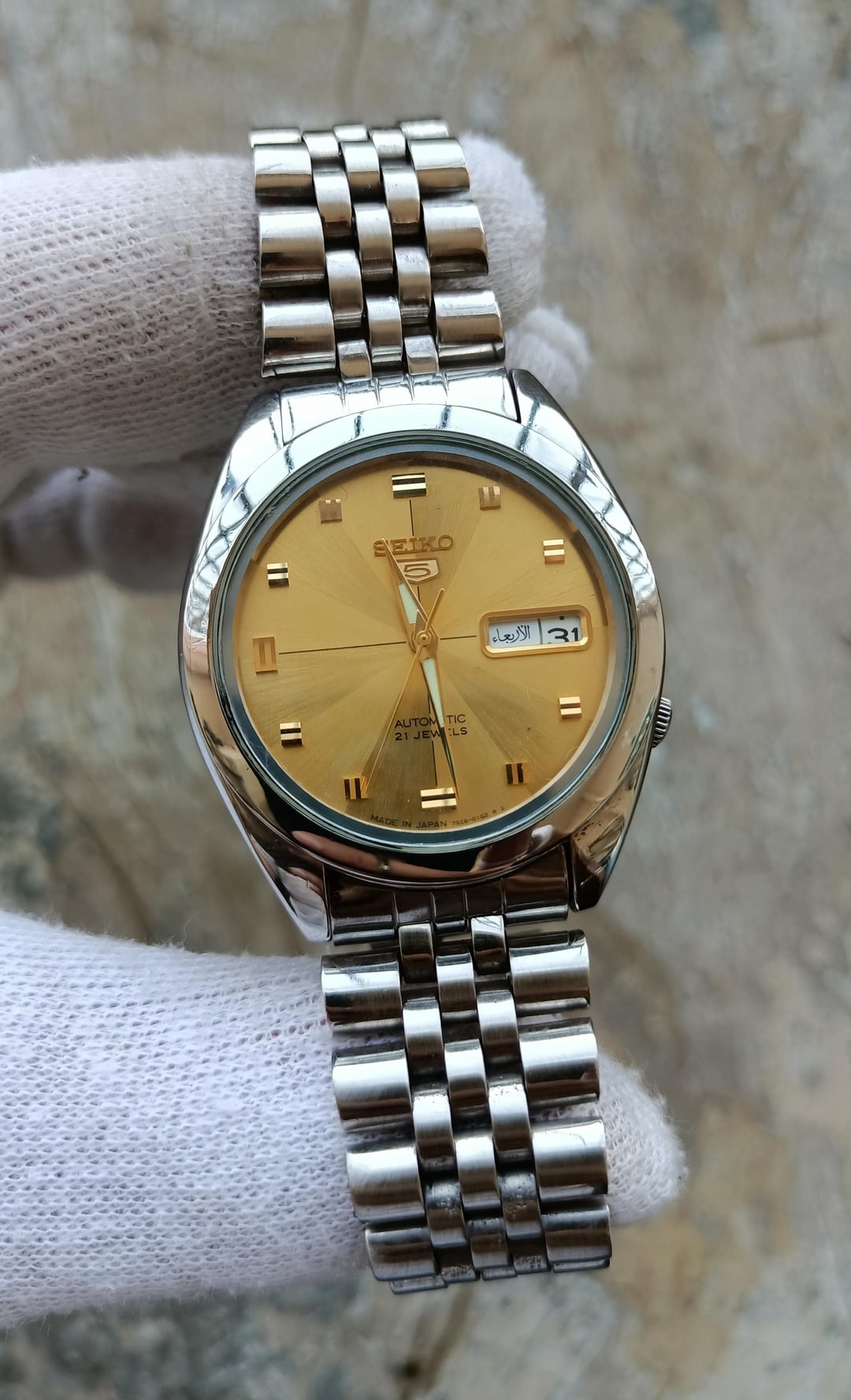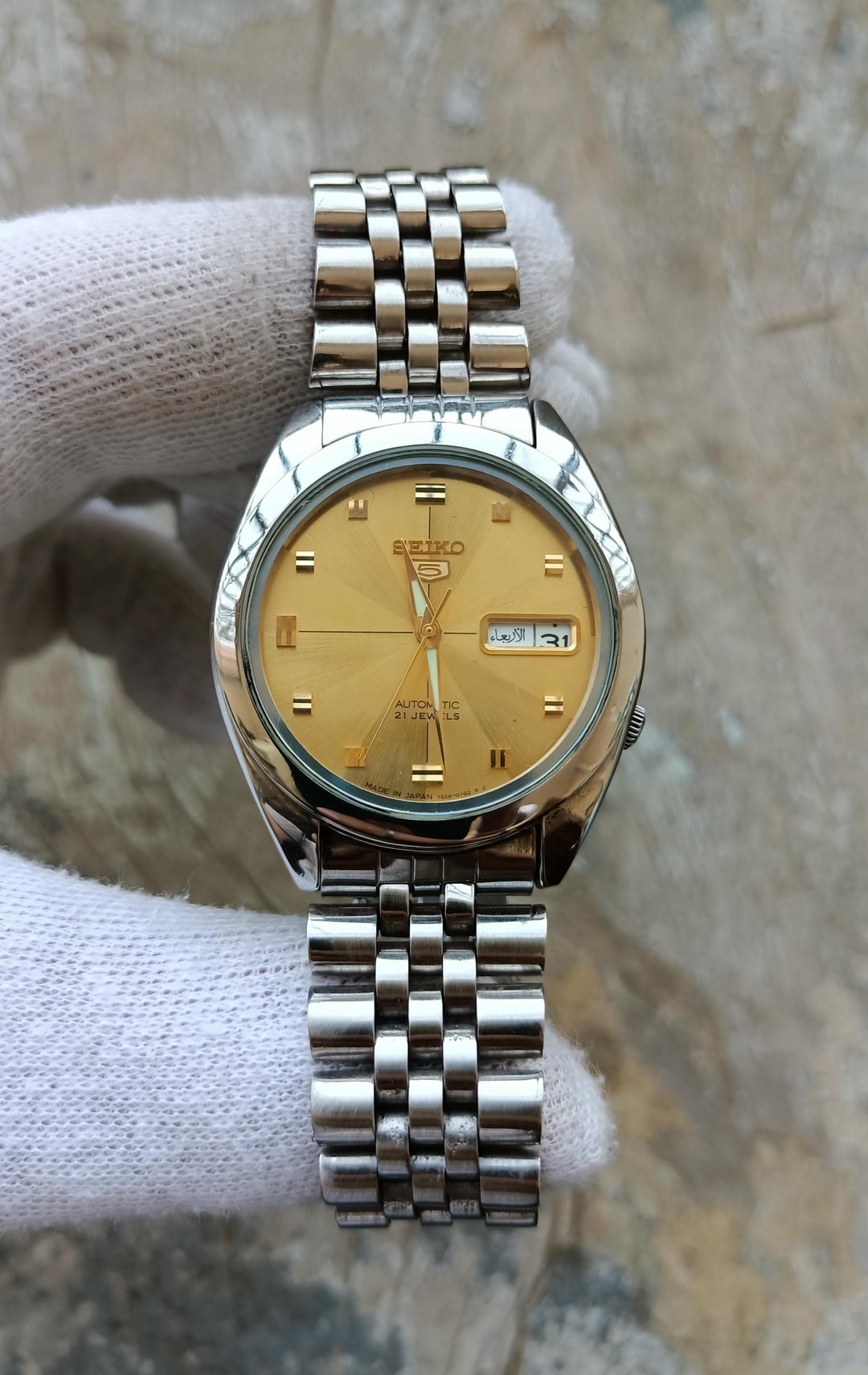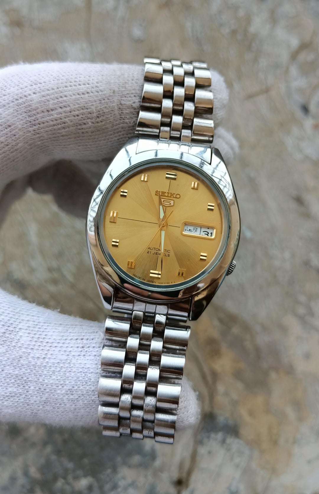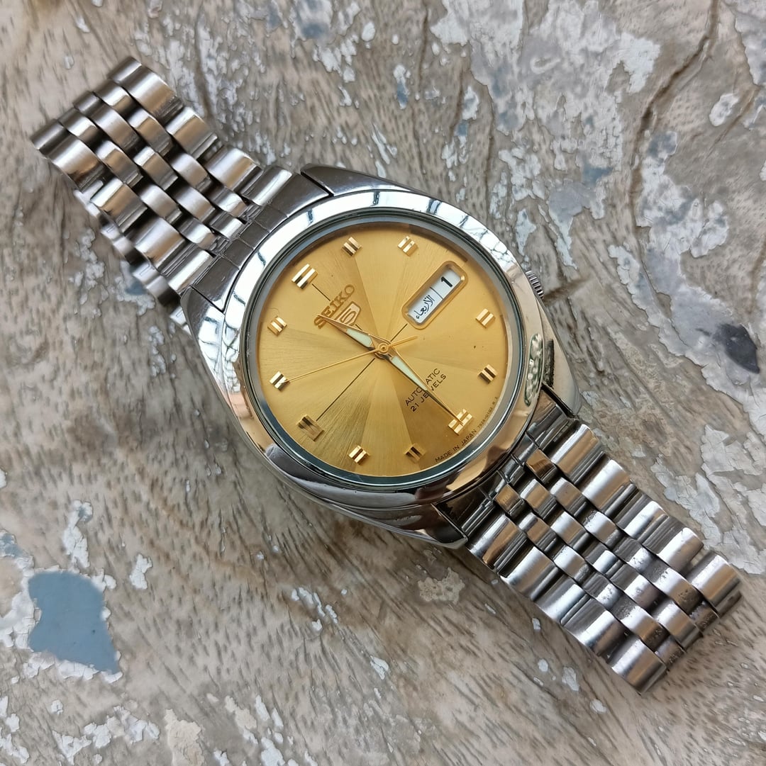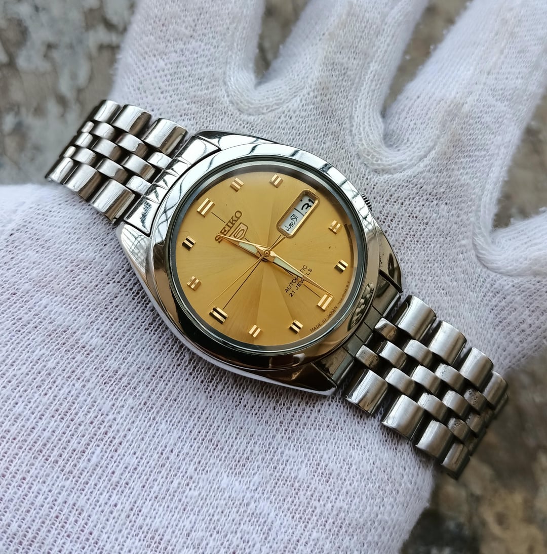 Seiko Golden Dial. Ref-7S26. Description and Features: Overall this is in good Working condition. A rare exquisite Seiko watch in great condition. Stunning Golden spiral sunburst dial raised unique faceted indexes. It has 7S26 Automatic workhouse movement inside, Exhibition clear case back. Sunlight brings out most of its beauty. The polish is great with sharp brushed lines and mirror finishing. Case back Reference: 7S26-00X0. Seiko 5 Japan signed solid original Jubilee bracelet. Please see the pictures carefully. SPECIFICATIONS: Movement: Automatic, Case Diameter, 38 mm, Thickness 11 mm, Lug Width 20 mm, Lug to Lug 43 mm, Watch only. Please comment before messaging. Payment Method: PayPal friends & family, Crypto, Payoneer & Binance Only. Shipping From FedEx Express Shipping. Price $139 Shipped. After payment confirmation the scheduled shipping time will be 2-3 working days.