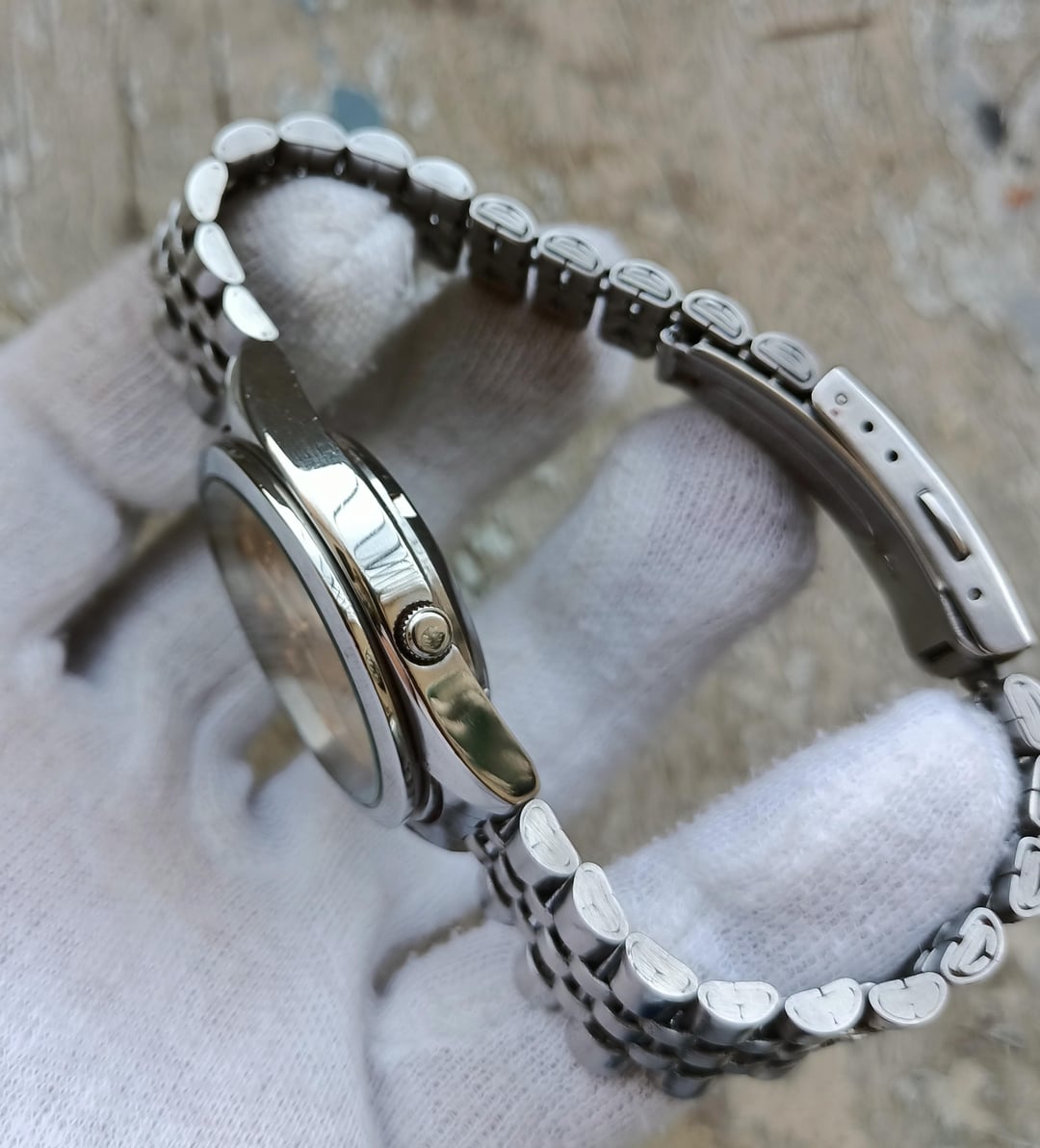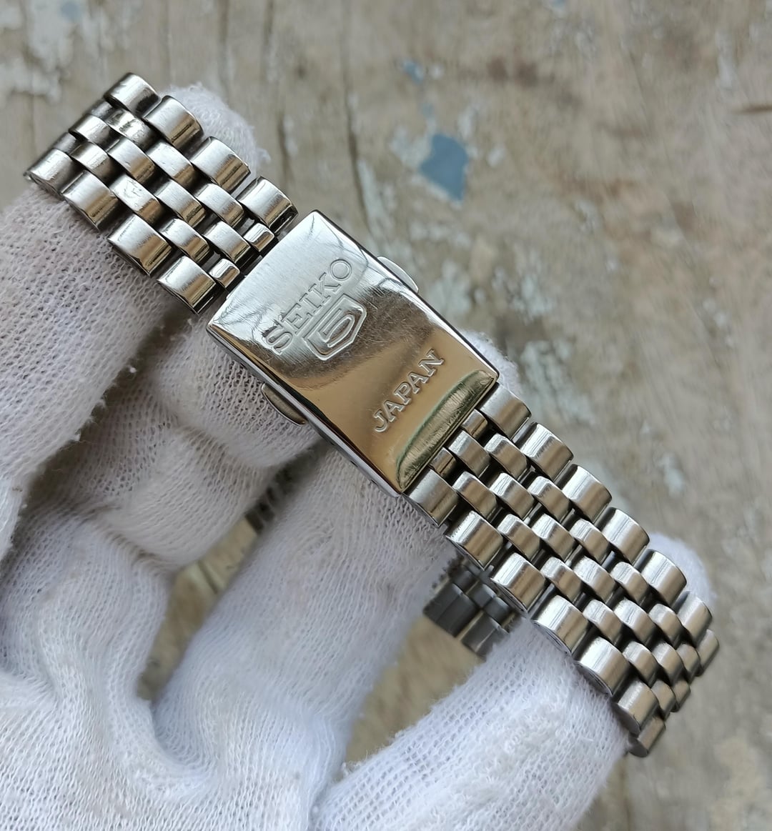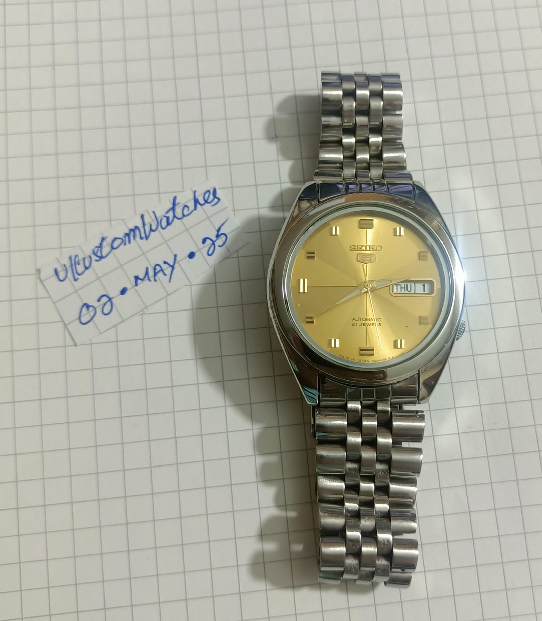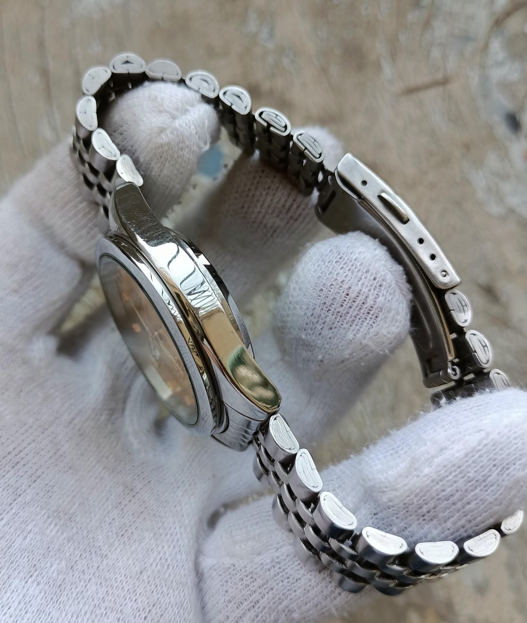 Seiko Golden Dial. Ref-7S26. Description and Features: Overall this is in good Working condition. A rare exquisite Seiko watch in great condition. Stunning Golden spiral sunburst dial raised unique faceted indexes. It has 7S26 Automatic workhouse movement inside, Exhibition clear case back. Sunlight brings out most of its beauty. The polish is great with sharp brushed lines and mirror finishing. Case back Reference: 7S26-00X0. Seiko 5 Japan signed solid original Jubilee bracelet. Please see the pictures carefully. SPECIFICATIONS: Movement: Automatic, Case Diameter, 38 mm, Thickness 11 mm, Lug Width 20 mm, Lug to Lug 43 mm, Watch only. Please comment before messaging. Payment Method: PayPal friends & family, Crypto, Payoneer & Binance Only. Shipping From FedEx Express Shipping. Price $139 Shipped. After payment confirmation the scheduled shipping time will be 2-3 working days.
