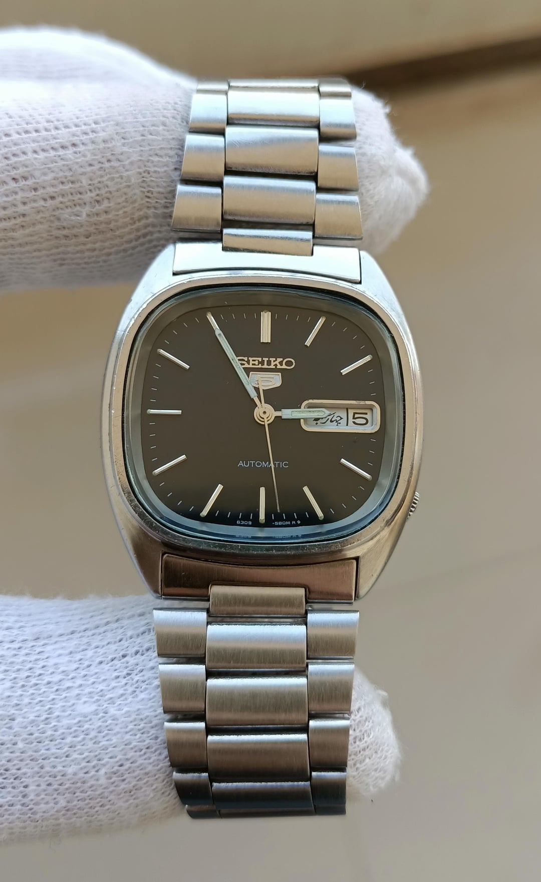 Seiko 5 Automatic Watch. Ref -6309-5800. Description and Features: Overall this is in good Working condition. This watch is used and shows signs of wear. There are some scratches on the case. Features: 12-Hour Dial, Day/Date. Movement: Mechanical (Automatic) Glass: Mineral. Case Material: Stainless Steel. 17 Jewels. Please see the pictures carefully. It will fit wrists of up to 20 cm. SPECIFICATIONS: Movement: Automatic, Case Diameter, 35 mm, Thickness 11 mm, Lug Width 20 mm, Lug to Lug 37 mm, Watch only. Please comment before messaging.          Payment Method: PayPal friends & family, Crypto, Payoneer & Binance Only.                                Shipping From FedEx Express Shipping. Price $130 Shipped. After payment confirmation the scheduled shipping time will be 2-3 working days.