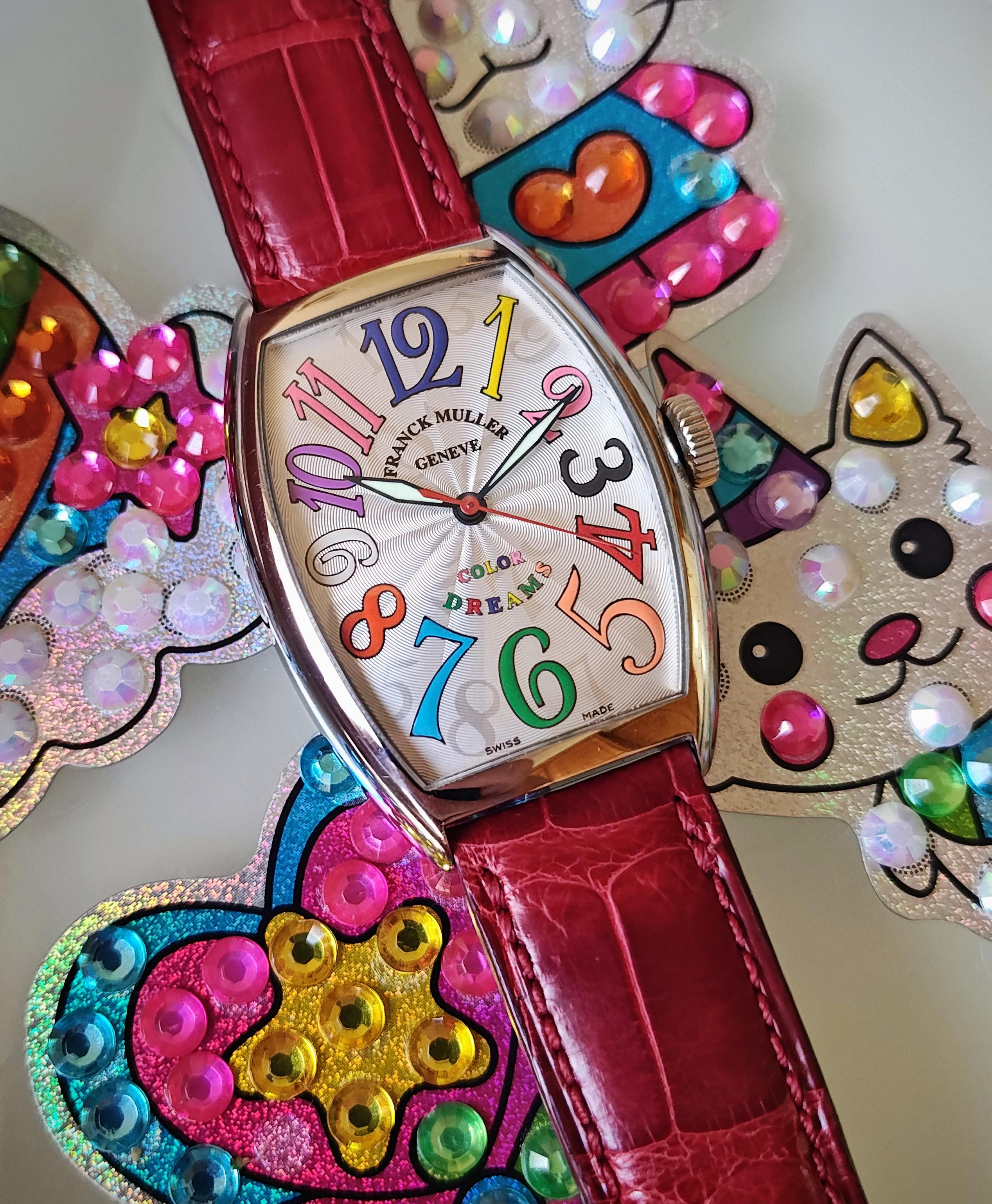 **Franck Muller Color Dreams** The fun continues with **WatchScene Weekend Watch #8**: when your watch collection gets a bit stale and you're looking for something different and more fun, look no further than Color Dreams. 31mm x 45mm stainless steel case on factory red leather strap on a buckle. Star of the show is the dial with a whimsical numeral display. Automatic movement. Watch only sale. Reference 5850 SC COLOR DREAMS More pics: [https://imgur.com/a/hd4i7iZ](https://imgur.com/a/hd4i7iZ) $3,333 plus shipping Watches are shipped fully insured with FedEx Express. Local pickup is available in Los Angeles area. Zelle, Venmo and wire accepted. Watch dealer with positive feedback on hundreds of successful transactions throughout watch community, including WUS, C24, eBay, FB. Thanks for looking. Check my 100+ 5-star reviews on Chrono24! Please see my other listings. I have a lot of cool watches listed and update inventory weekly.