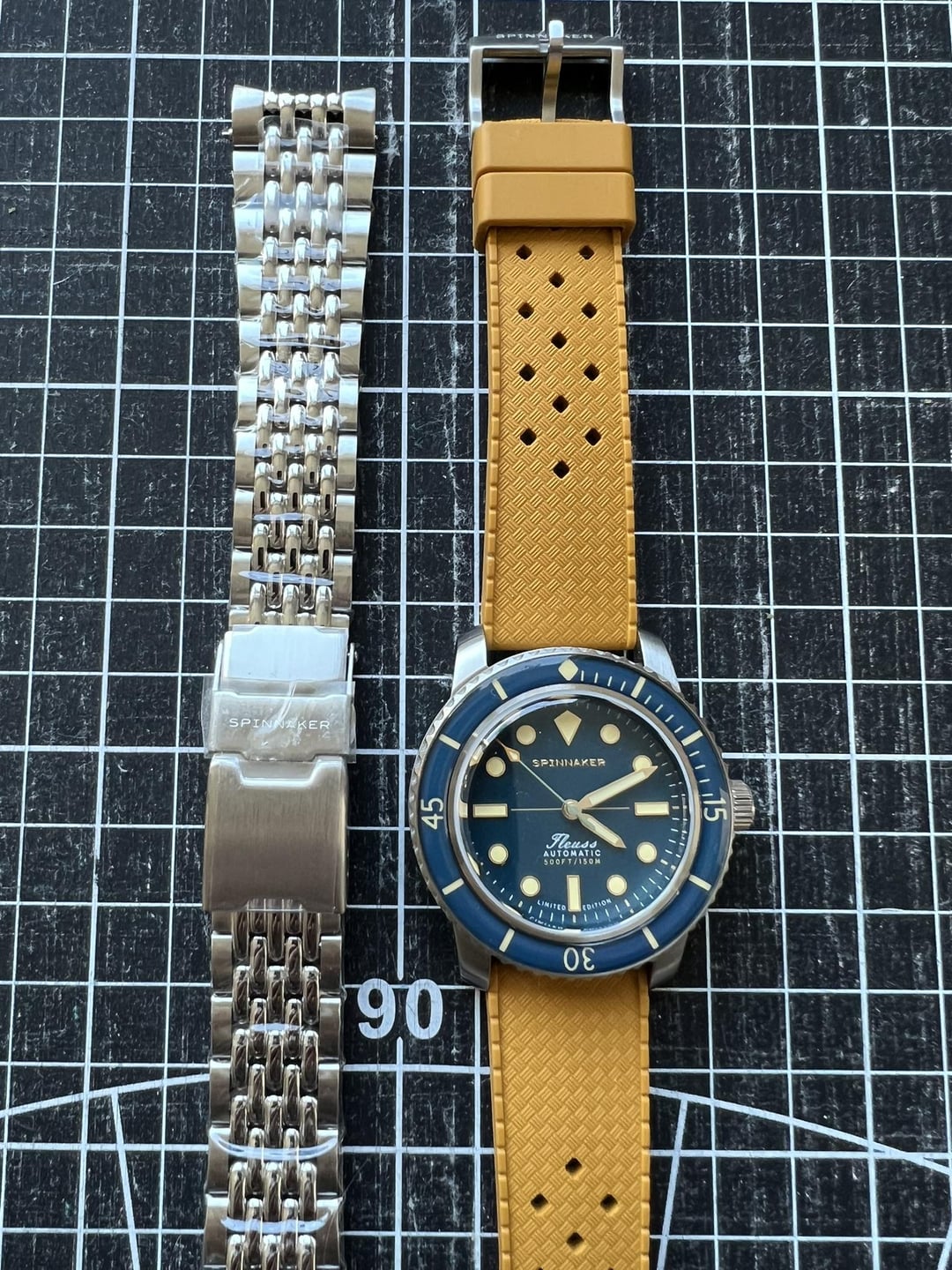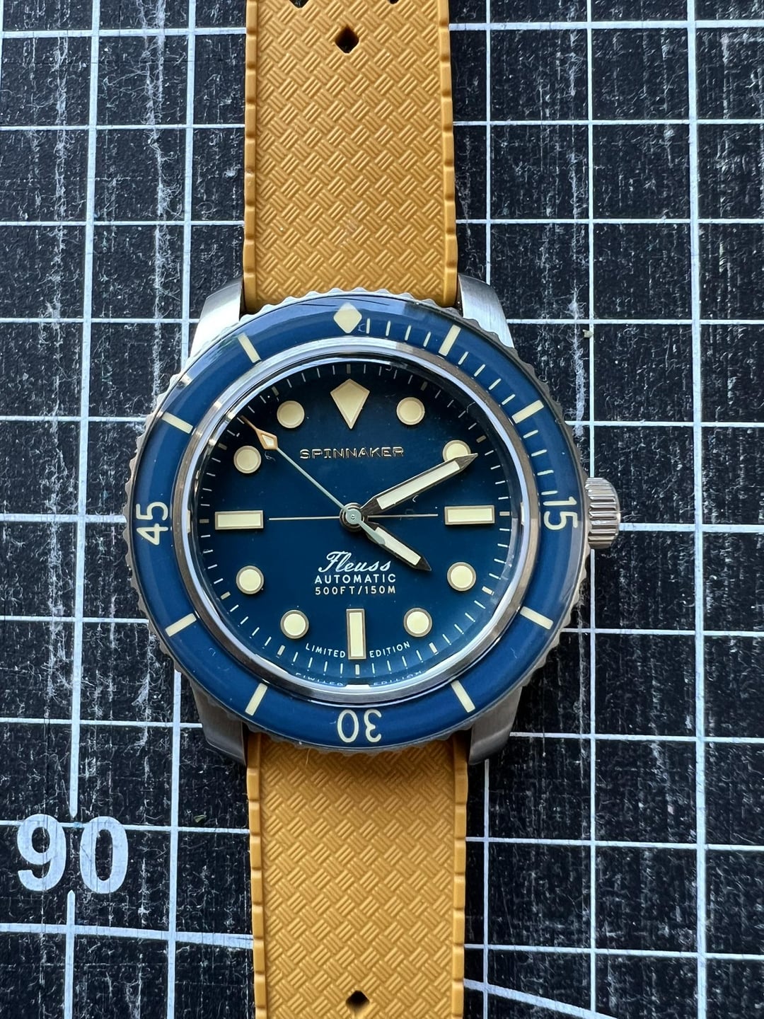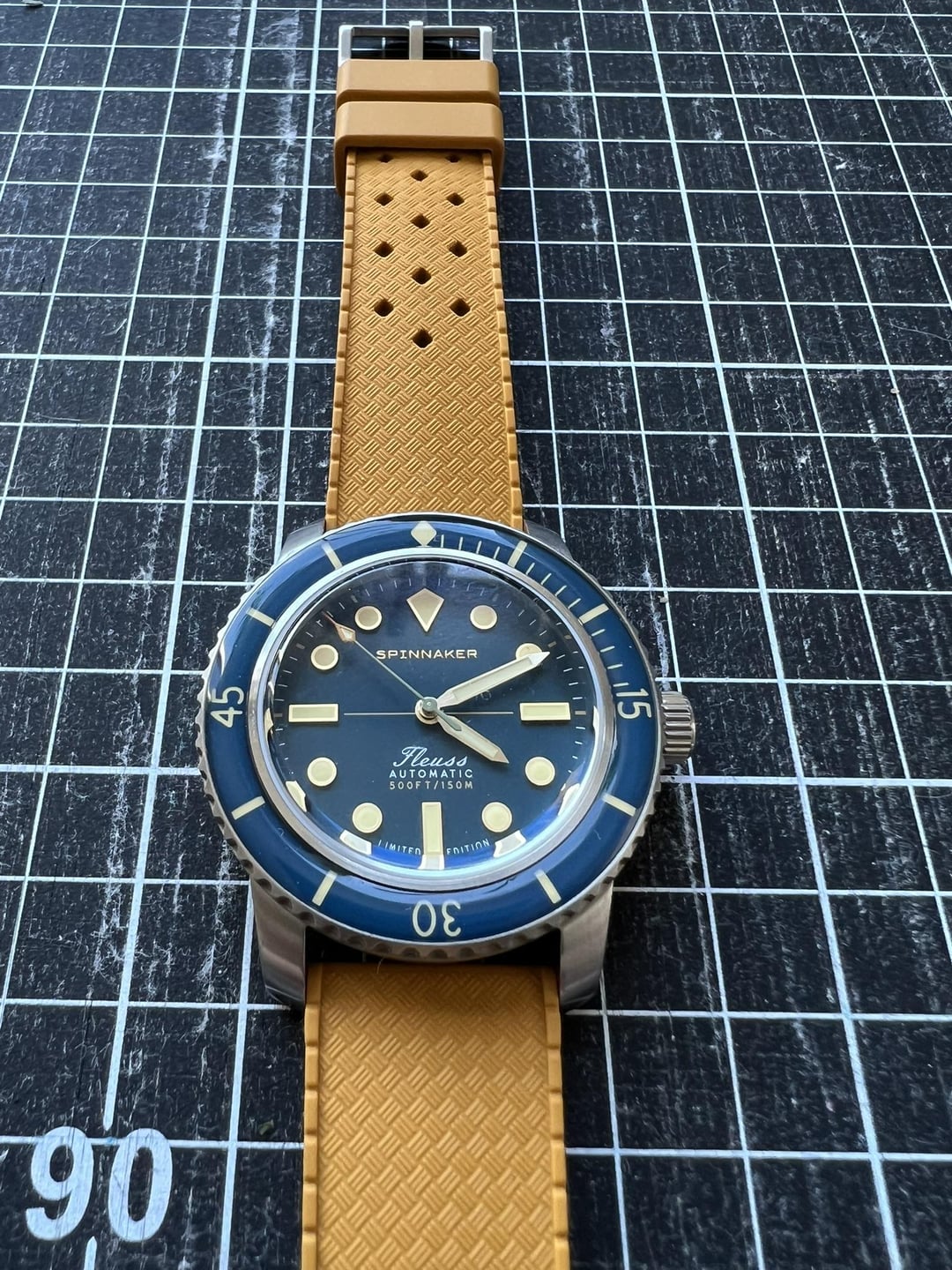 Up for sale is the Spinnaker Fleuss Limited Edition in the Ocean Blue colorway. Only 150 pieces made. Bought new, only tried on a couple times around the house. Beautiful beads of rice bracelet and durable mustard rubber strap included. Full kit includes box, papers and accompanying product materials. This watch punches way above its weight class featuring a screw down crown, sapphire crystal and a Miyota 9 Series movement. Sells new online for $450 Selling here for $299 + shipping From Spinnaker: *In honour of the 145th anniversary of Henry Fleuss's pioneering rebreather test, this new iteration of Fleuss Automatic marks a significant milestone with a refined 40mm case size. With a palette of muted, vintage colours, these watches pay homage to the heritage of dive watch design while maintaining a modern aesthetic and watchmaking standard.* *Movement: Miyota 9039* *Case Material: Stainless Steel* *Case Size (mm): 40.0* *Case Thickness (mm): 11.0* *Lug to Lug (mm): 47.0* *Dial Colour: Blue* *Index & Luminous: Applied Index With Swiss Super Luminova* *Lens: Sapphire Lens* *Crown Type: Screw Down* *Band: 20mm Stainless Steel With Fold Over Buckle With Safety Lock And Push Button* *Extra Band: Tan Rubber Strap* *Water Resistance: 15 ATM* *Weight (g): 190*