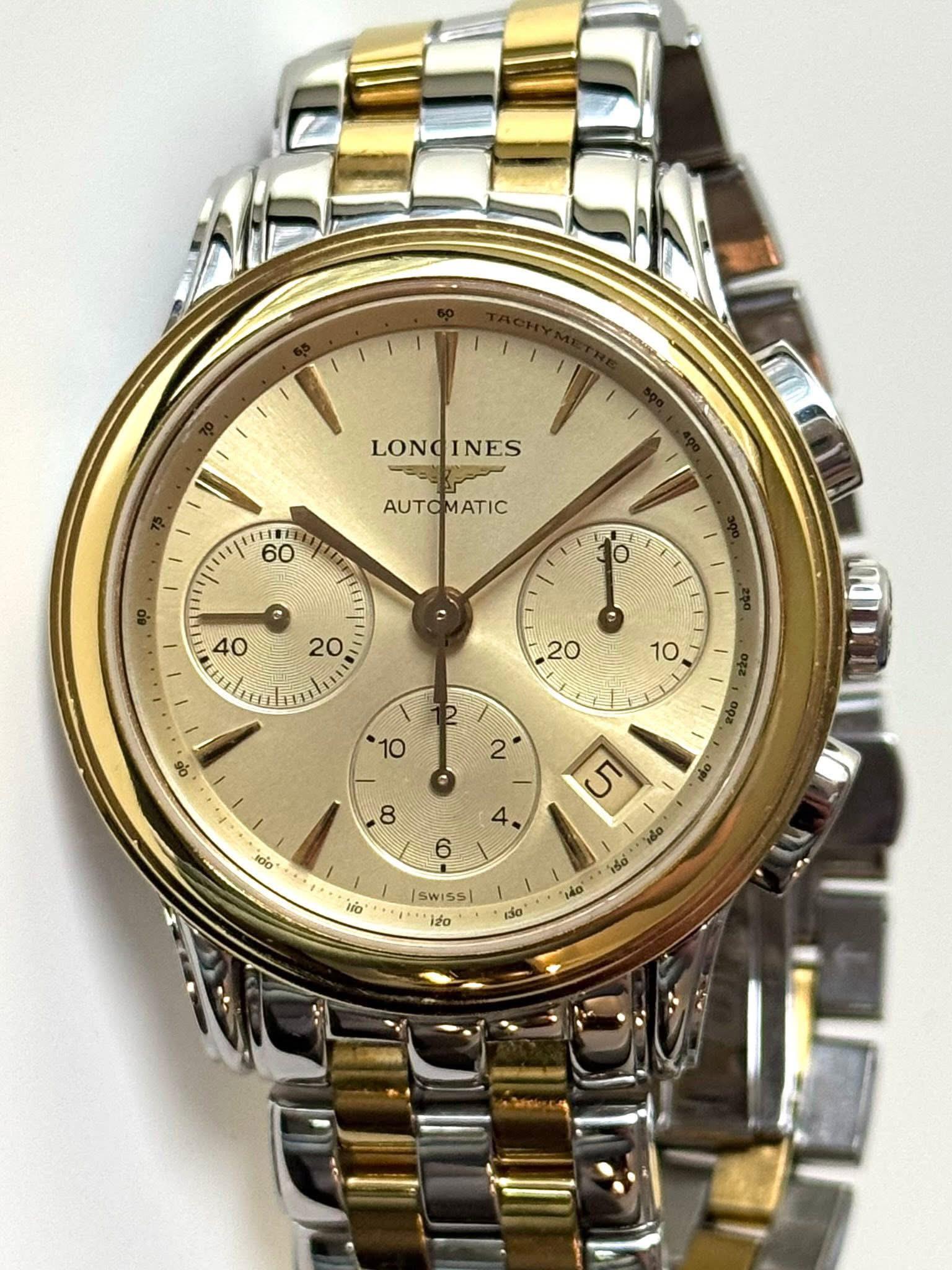 Longines Flagship Two-Tone Chronograph Automatic. 39mm. 7” bracelet. **$1250** / Zelle, Venmo, or WU accepted. Image gallery: https://imgur.com/a/im8CPKI Timestamp: https://imgur.com/a/bV0j4wn I have **tons** of references on multiple platforms including WatchExchange. I am more than happy to show these.