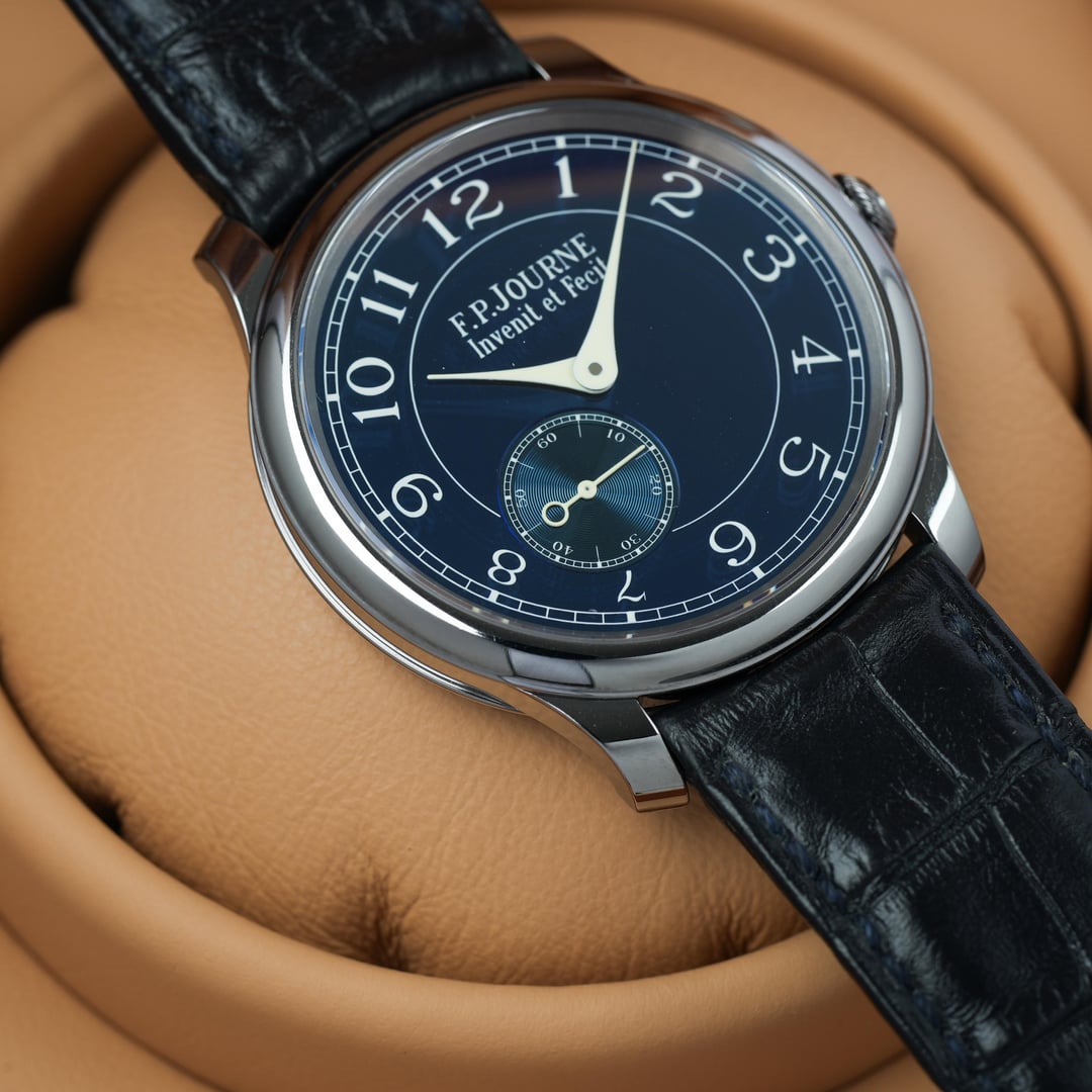 **2018 F.P. Journe Souveraine Chronometre Bleu** **Timestamp:** [https://imgur.com/elNodFy](https://imgur.com/elNodFy) Indulge in the allure of haute horology with the F.P. Journe Chronomètre Bleu, a watch that epitomizes precision, sophistication, and timeless beauty. Crafted by the legendary François-Paul Journe, this exquisite timepiece is a testament to the artistry and innovation that define the world of fine watchmaking. The Chronomètre Bleu features a stunning 39mm tantalum case, renowned for its unique blue-grey hue and remarkable resistance to corrosion. This rare material not only enhances the watch's durability but also gives it a distinctive and luxurious appearance. The captivating blue dial, achieved through a meticulous lacquer process, is adorned with elegant white gold hands and applied hour markers. At the heart of this timepiece lies the manually wound F.P. Journe caliber 1304. This exceptional movement boasts a double barrel configuration, ensuring stable power delivery and a remarkable 56-hour power reserve. The intricate finishing and precision engineering of the 18K movement are visible through the sapphire crystal case back. Comes with Box and Signed FP Journe COA. This watch is overall in excellent condition. Please look over my pictures closely as I like to properly represent the watch you will be receiving. **Offered at $92999 shipped in US or OBO.** Payments accepted: Wire or Direct Bank Transfer (Bank of America) Shipping is always FedEx/UPS overnight, fully insured. I am an avid enthusiast and collector and am not affiliated with any watch brand I post. Always open to trades. Please message with offers. I guarantee every watch I sell to be 100% authentic. Follow me on IG: JJ\_Timepiece\_Co