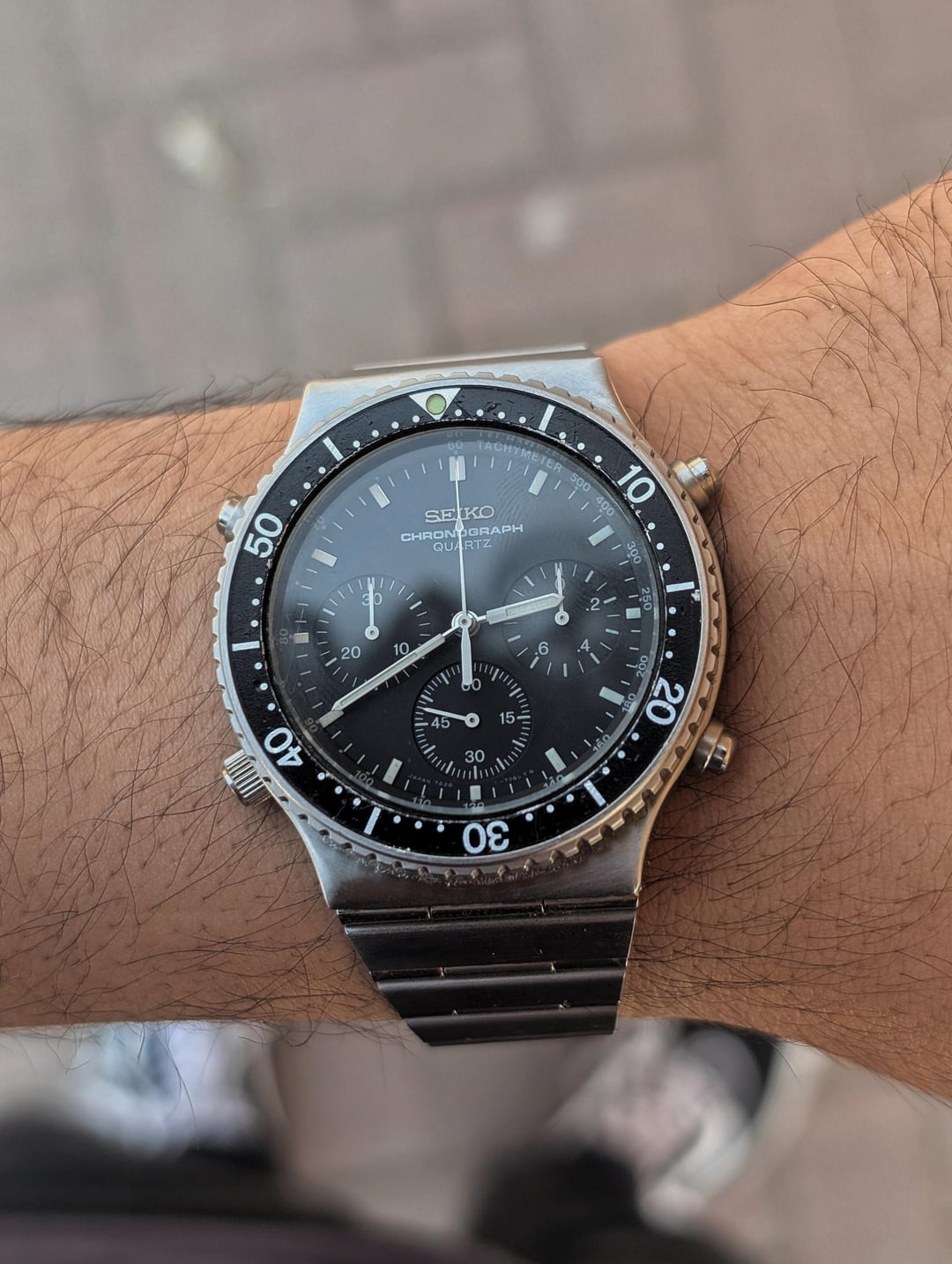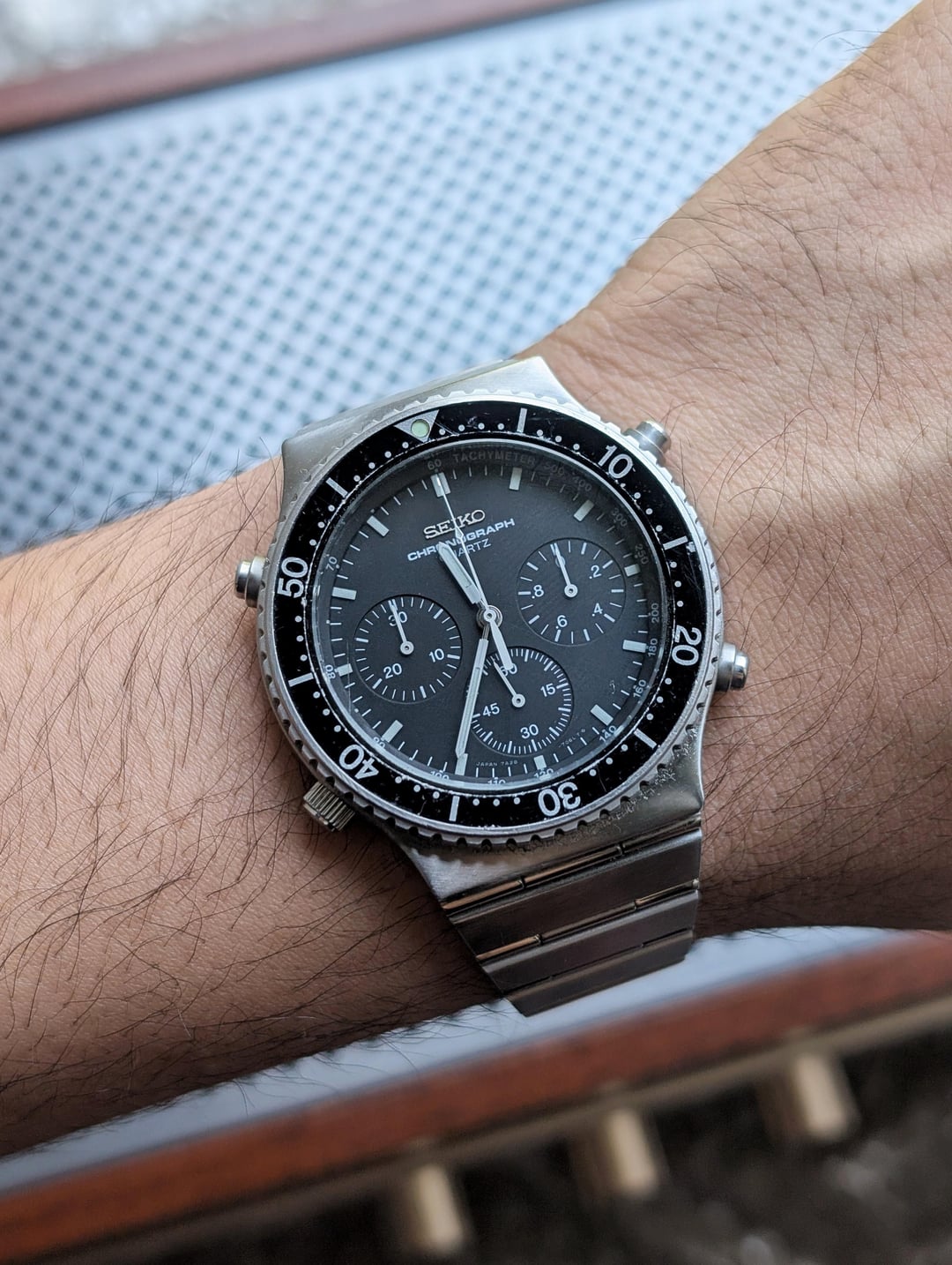Greetings watchexchange! Up for sale is a stunning Seiko 7A28-7040, the 7Axx were the first quartz analogue chronograph movements, and they are truly a sight to behold. The 7A Seiko movements are fully jewelled, made of metal, serviceable and provide a regulator switch. The watch is in beautiful condition as pictured, and comes on its original Seiko bracelet with the "Speedmaster" clasp. The bracelet will fit a wrist up to 6.5", which could be extended with a clasp extender. The watch has a 40mm case diameter, and a 43mm l2l. The watch is serviced, and has a fresh battery installed. The bidirectional rotating bezel is functioning, though the resistance is a tad nonlinear. [Timestamp ](https://drive.google.com/file/d/1PxHBFx3fexZSLDkBBooCMMzlhJWbj-Pa/view?usp=drivesdk) The watch is priced to sell at $499 paid via Zelle or Wise and shipped via UPS, please allow 3 to 5 business days of your payment for the watch to be shipped out. Be sure to reach out to me if you have any questions or require additional photographs or information, I entertain requests for custom timestamps. Thanks for looking!