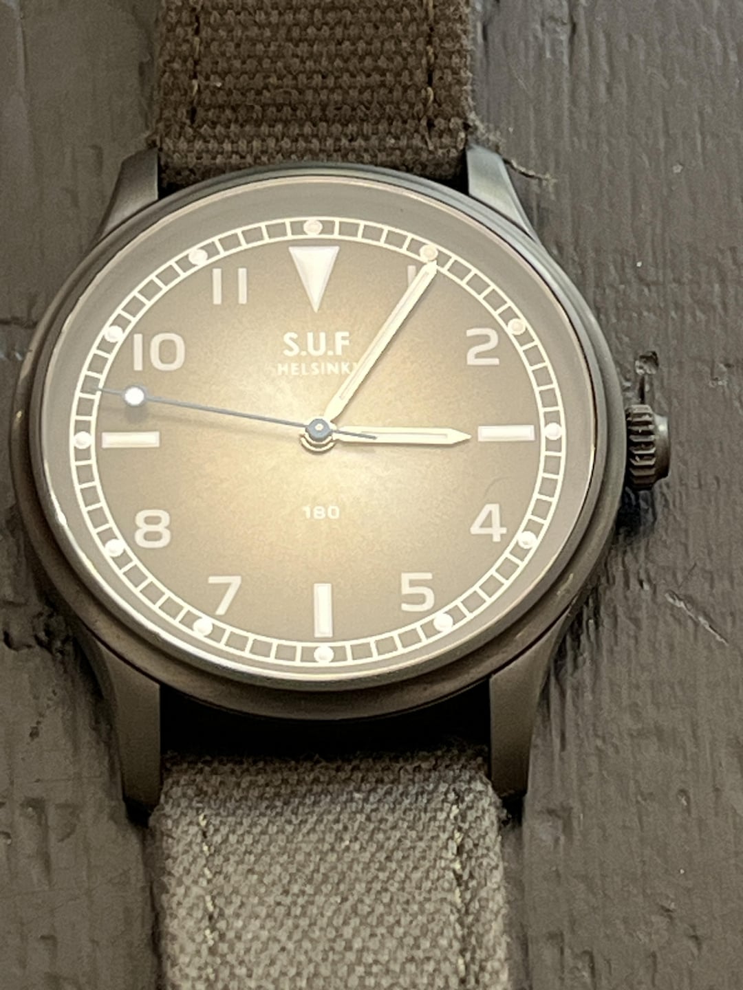 For sale is one of the great minimalist field watches available today. The SUF 180 Noki Nero (NN) is manufactured in Finland in Stepan Sarpaneva watchmaking facility. It is a light, thin, and playful field watch with enough ruggedness to become your GADA timepiece. There are a lot of wonderful touches to the 180NN. The gray sunburst dial changes colors in different lighting. The lume on the hour pips is outstanding, and the indices are remarkably legible. The polished hands glisten in the sunlight. The DLC is cleverly executed to complement the dial - it is more gray/anthracite than black. The leather/canvas strap adds a rugged/tactical feel. Sarpaneva's team has really thought of everything with the 180. You also get an amazing number of goodies as part of the full set (including a personalized thank you!) The SUF team is really outstanding. The watch is in like new condition. With the exception of creasing in the strap and one stray thread, I cannot see any marks on this piece. I HAVE worn it, but I have been very careful. AND the DLC is very durable. Price: $2550, including shipping. I accept PayPal, Venmo, or Zelle (F&F preferred but G&S is fine if you pay). I will ship in the US only. NO TRADES!!! I know that I have no transactions here. I recently had to delete my Reddit account and start over. I have reviews on eBay (MusilFan) and WUS (histrijanek). I am also happy to hop on a WhatsApp or FaceTime to give you piece of mind. Thanks for looking!