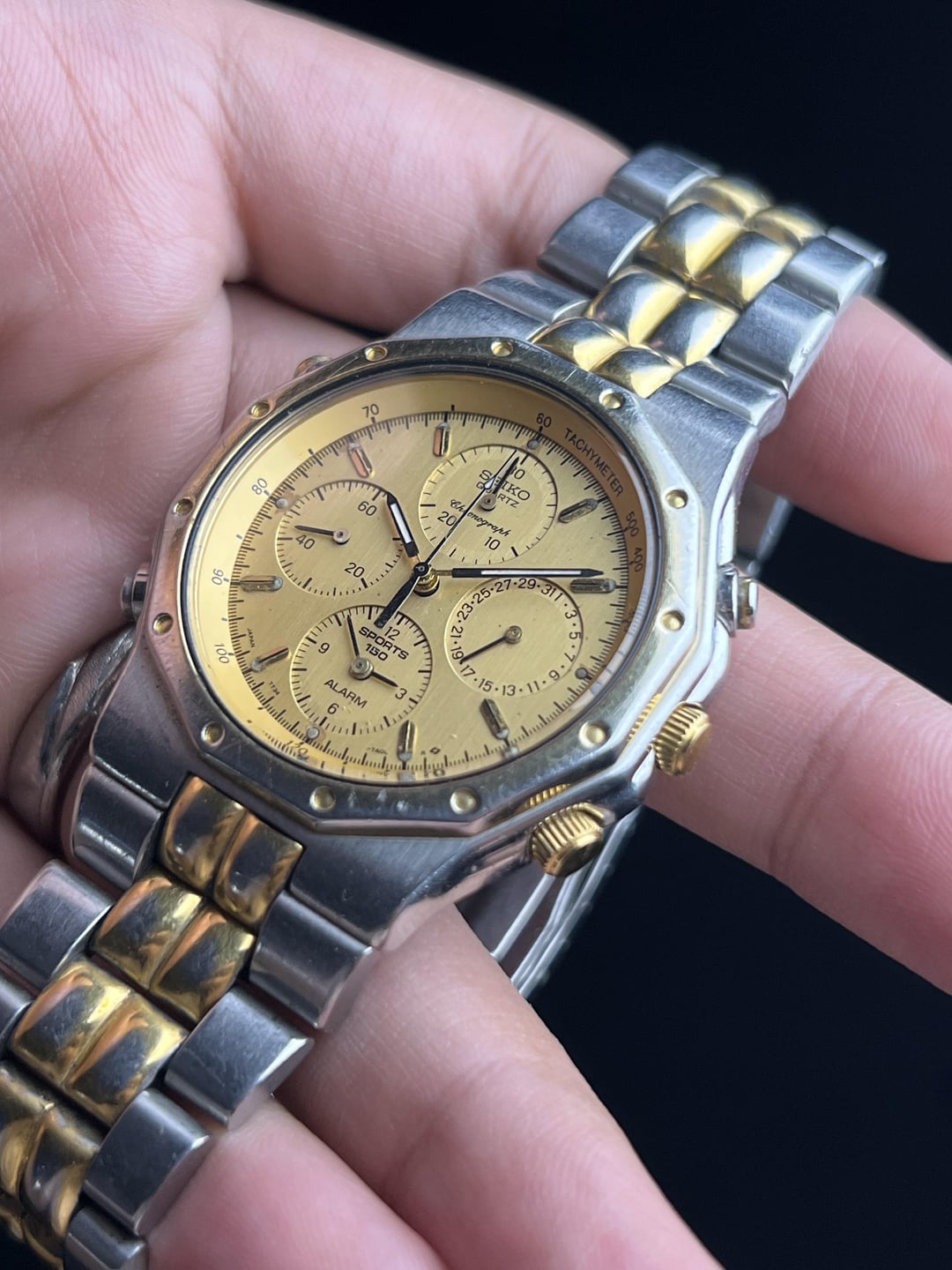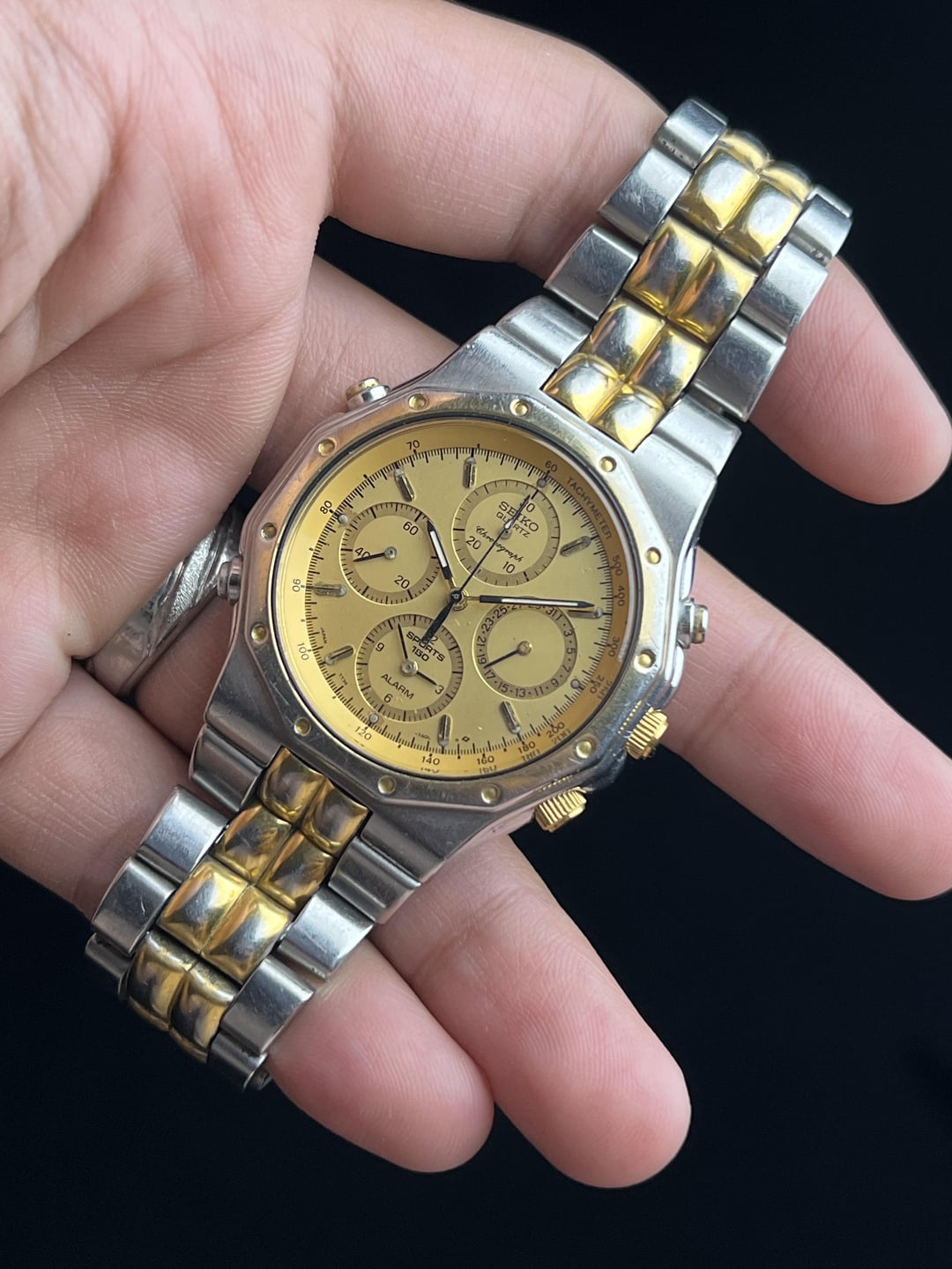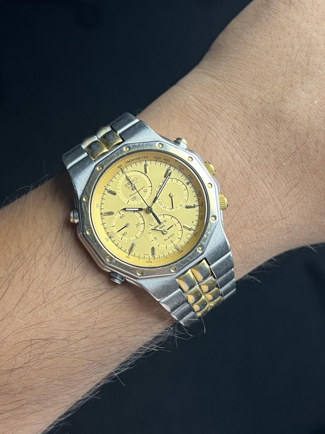Timestamp attached at the end. More custom timestamps available upon request. For Sale here is a Seiko Sports 150 Alarm Chronograph with a Champagne Dial. Case shaped like a Royal Oak, with a Case Diameter of 39mm without crown and 41mm with crown. Bracelet has full links. Priced aggressively low due to the visible fades on the bracelet and the bezel. Mint these go for double or more. Comes as watch only. USD $225 Shipped Worldwide via FedEx. Payment via Zelle, PayPal G&S (+5% at your end), and Crypto. Preference in that order. Thank you!