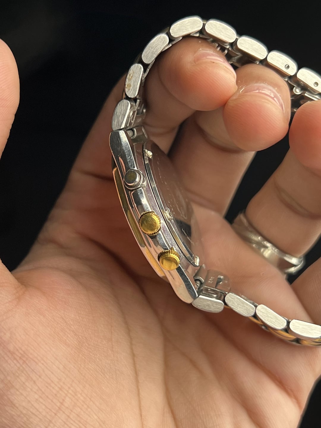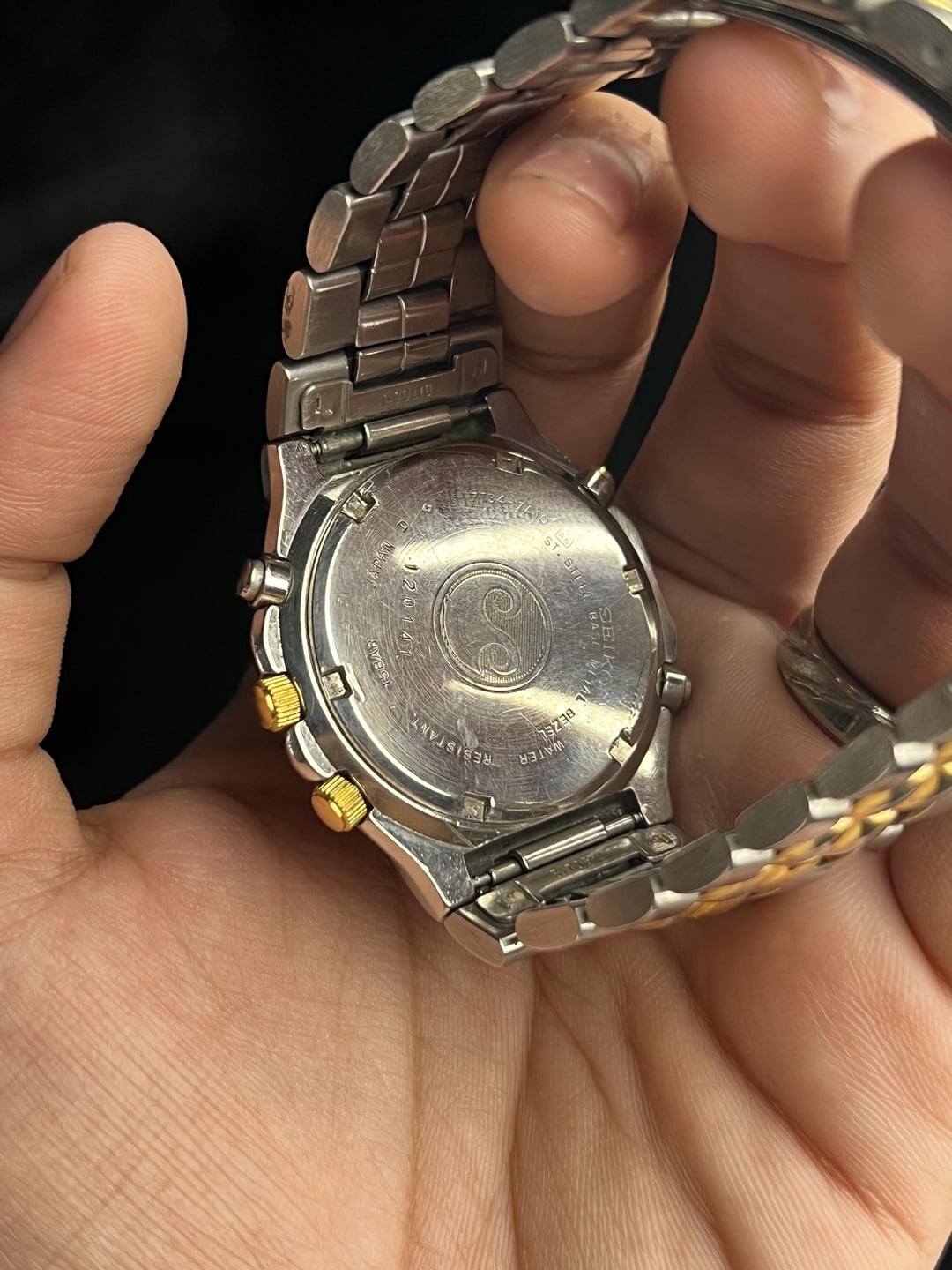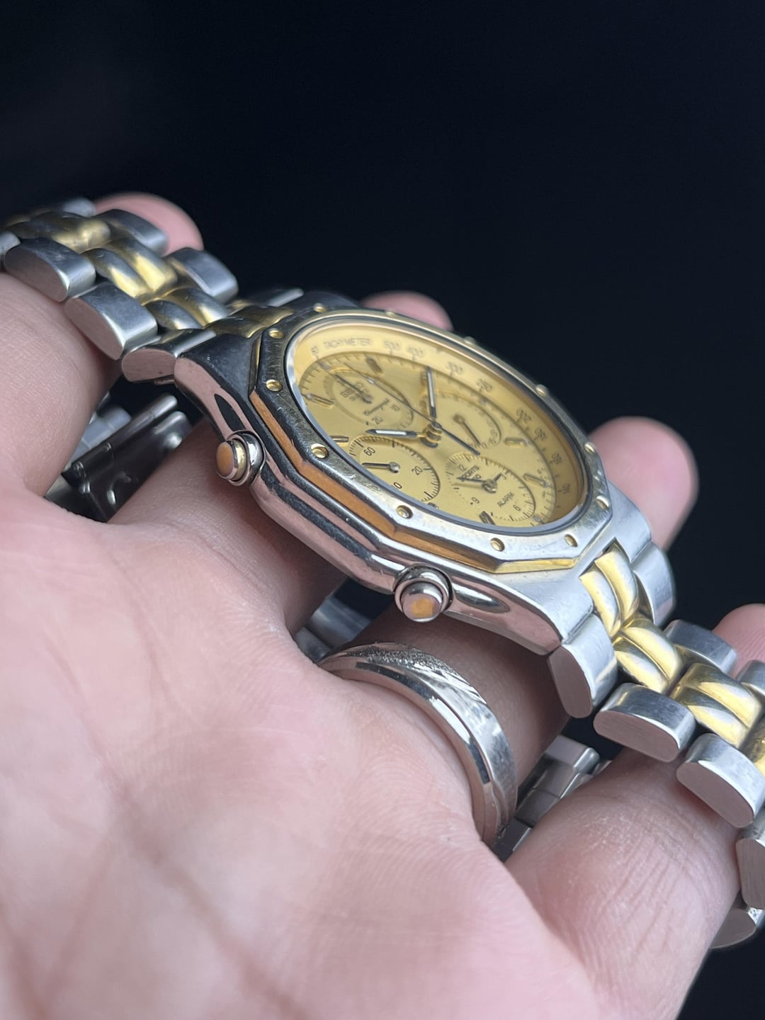 Timestamp attached at the end. More custom timestamps available upon request. For Sale here is a Seiko Sports 150 Alarm Chronograph with a Champagne Dial. Case shaped like a Royal Oak, with a Case Diameter of 39mm without crown and 41mm with crown. Bracelet has full links. Priced aggressively low due to the visible fades on the bracelet and the bezel. Mint these go for double or more. Comes as watch only. USD $225 Shipped Worldwide via FedEx. Payment via Zelle, PayPal G&S (+5% at your end), and Crypto. Preference in that order. Thank you!
