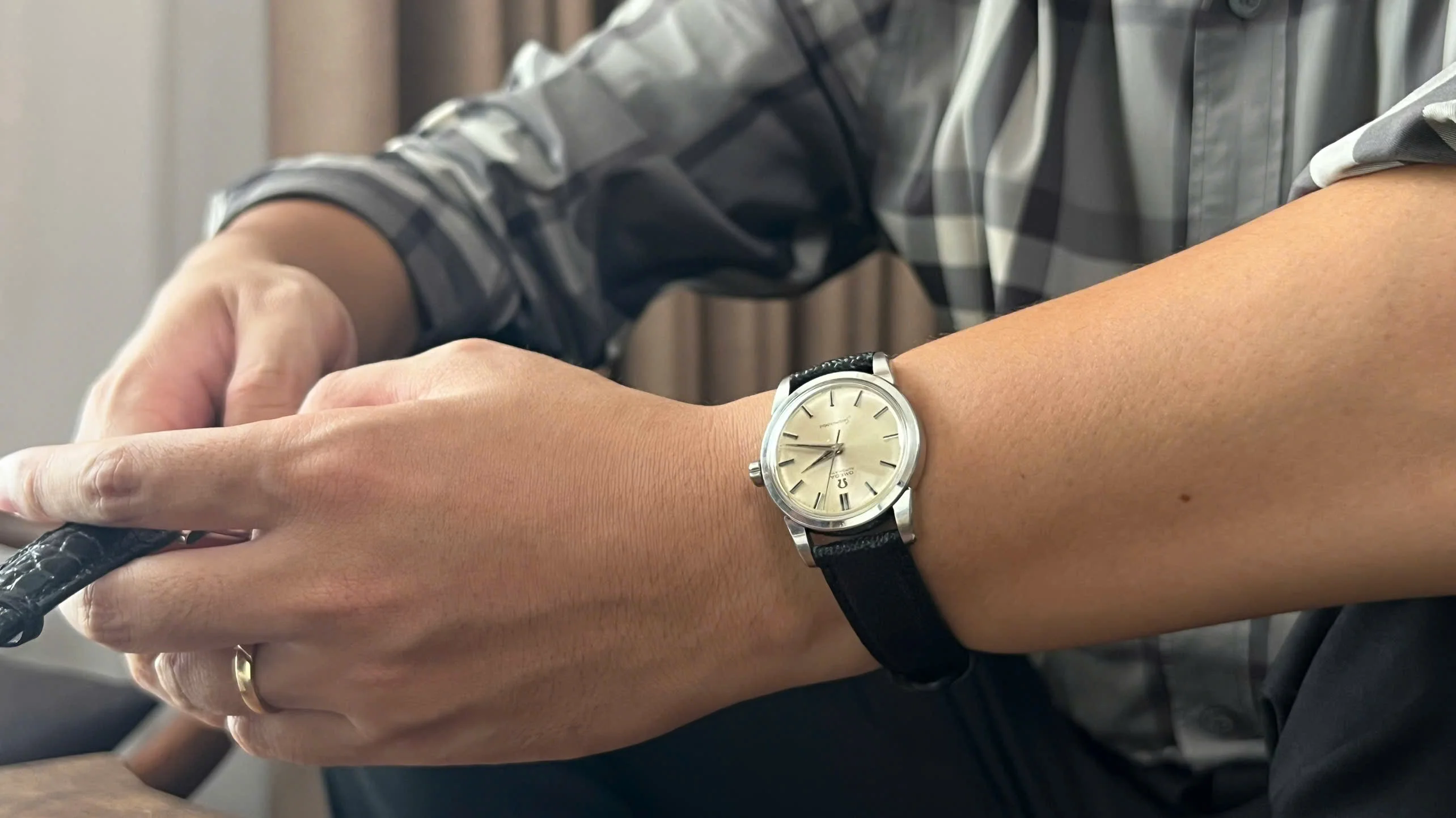The watch is paired with an aftermarket strap and buckle, comfortable and ready to wear. Everything else is original.