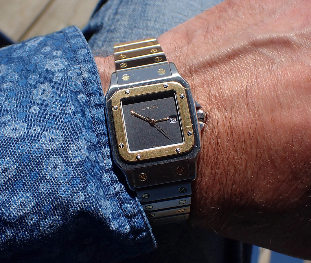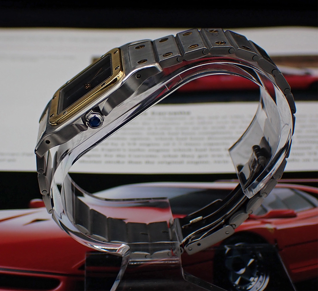 BRACELET: This great Carrée comes on its original semi-integrated first generation bracelet with trademark gold screws set into rectangular satined steel links and Cartier-signed logo clasp. This bracelet is both super tight, as is the snap-in clasp, and super long, presently fitting a 7.5” wrist at what I feel must be its full original length. You can tell it’s first generation by the wide clasp closure and the push pin released, slide-in links. Cosmetically, this beautifully crafted bracelet is in Excellent+ unpolished condition with only minor marks from wear.