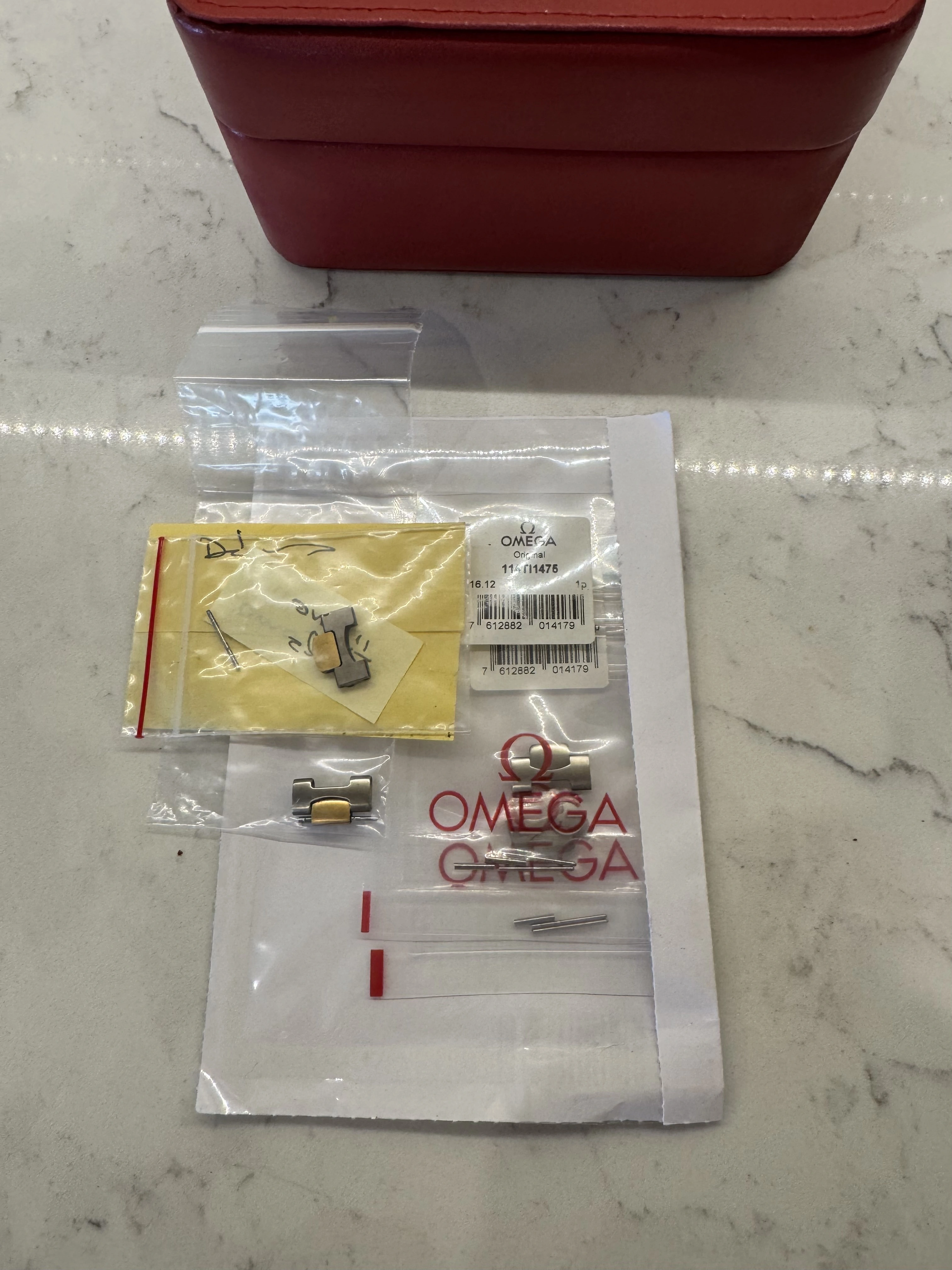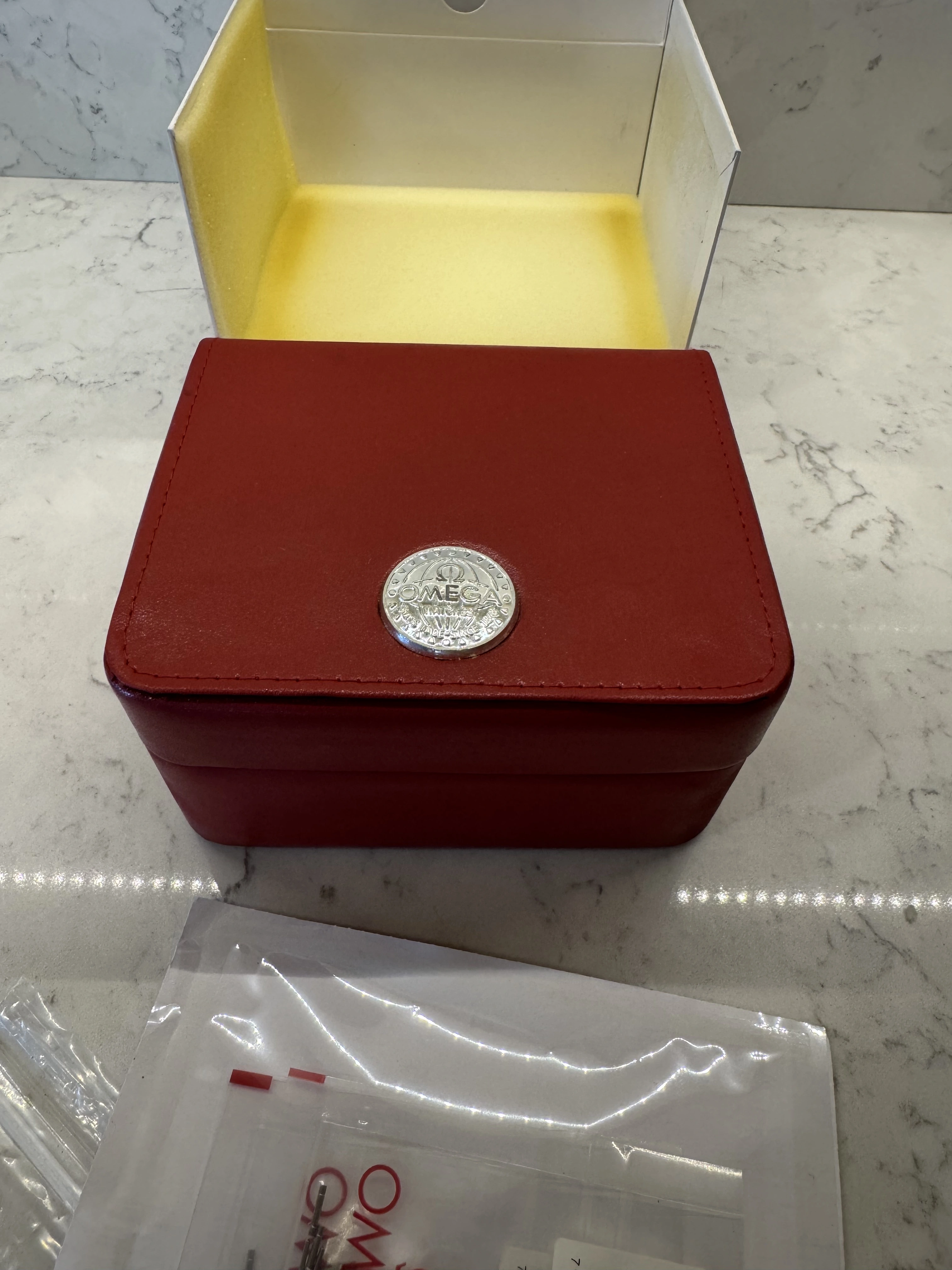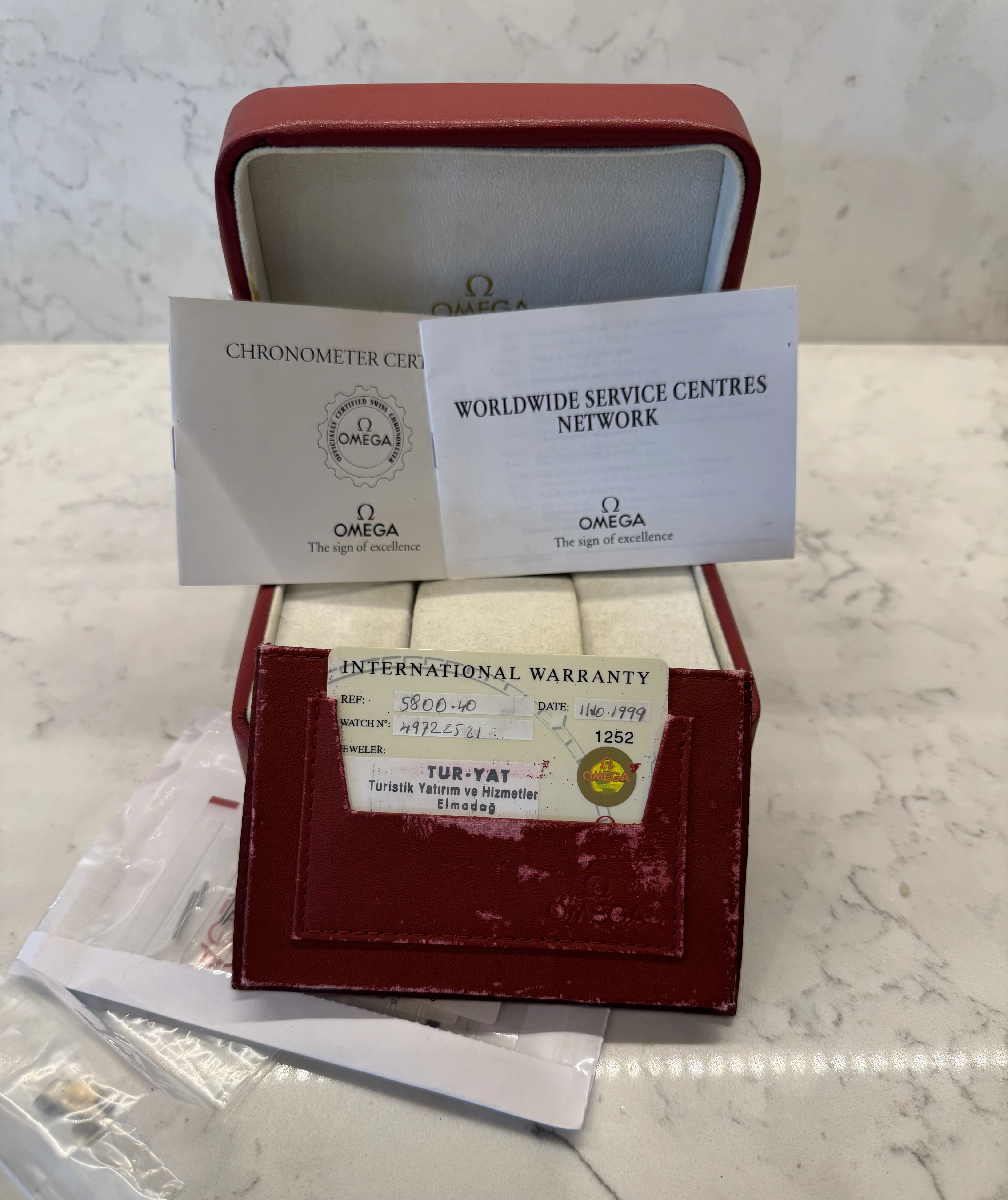 Package includes outer box, red pleather box in remarkably good condition, red wallet in poor condition, warranty card and chronometer certificate, two titanium and gold links, two titanium links.