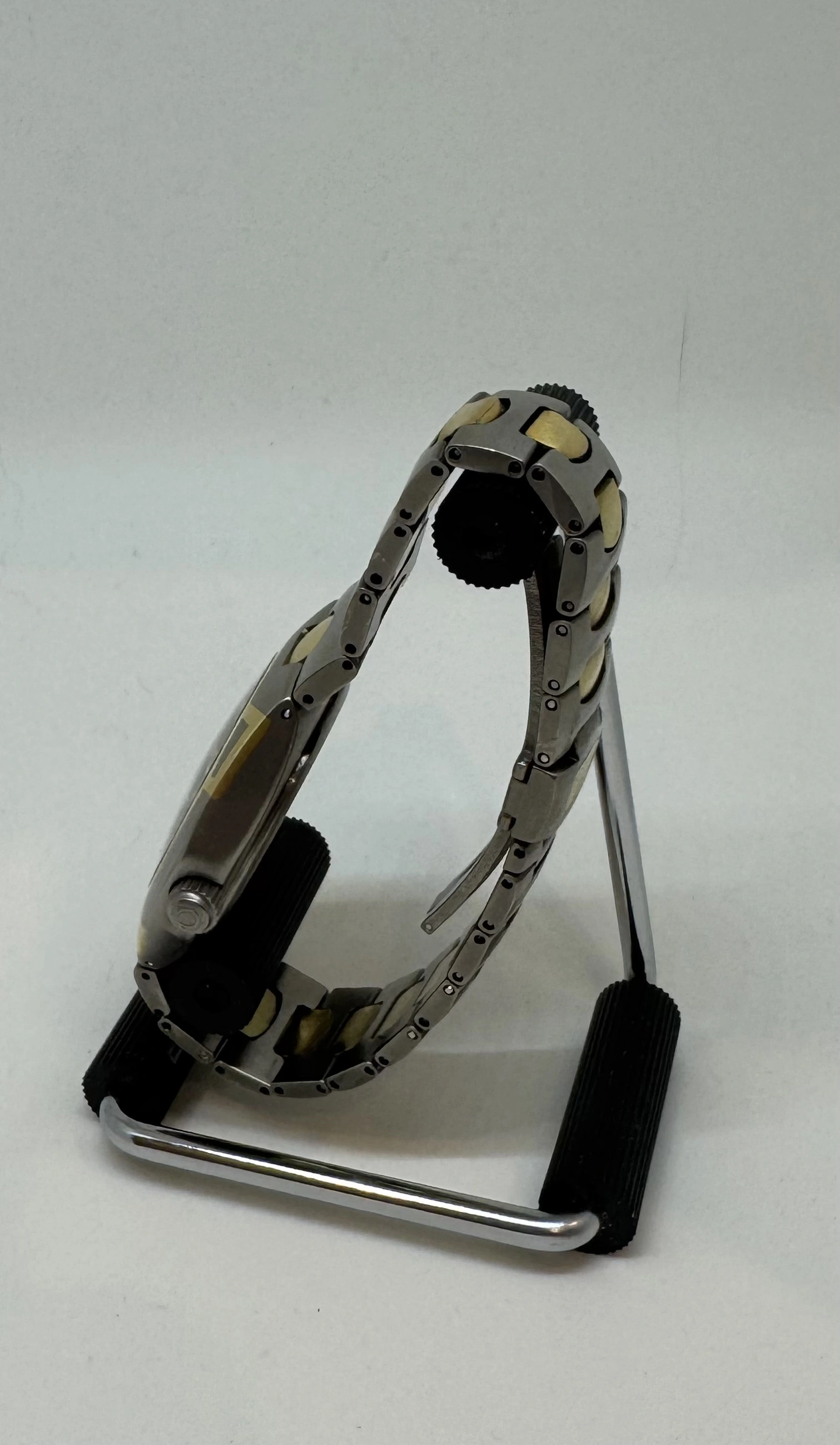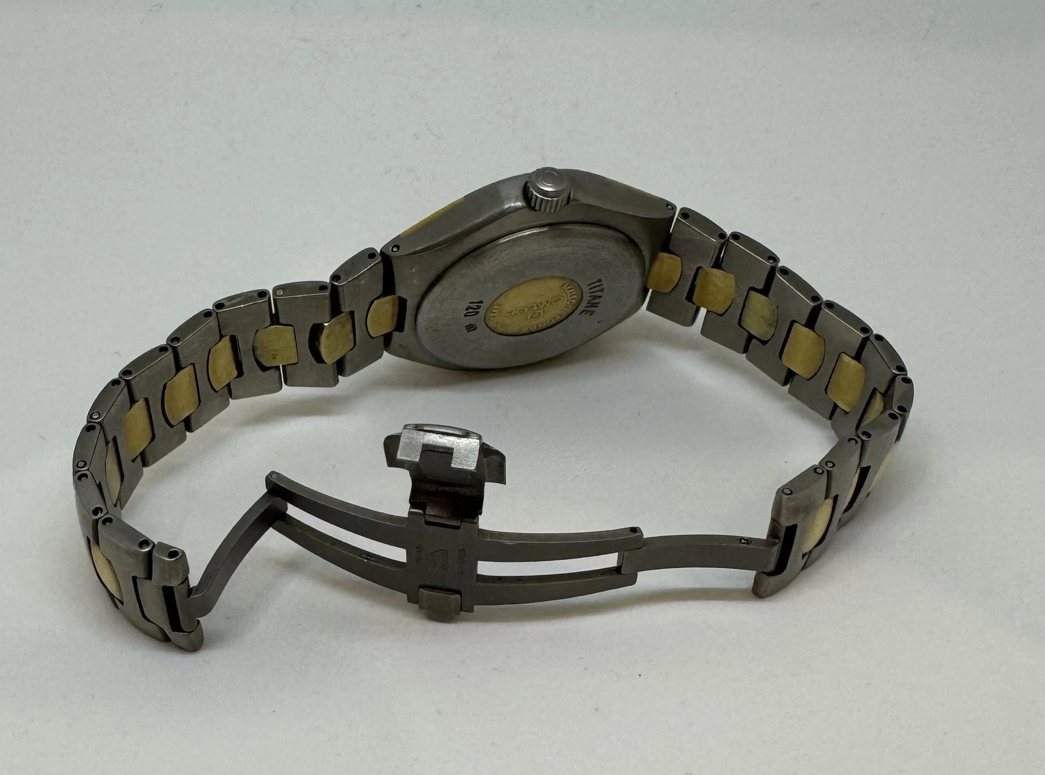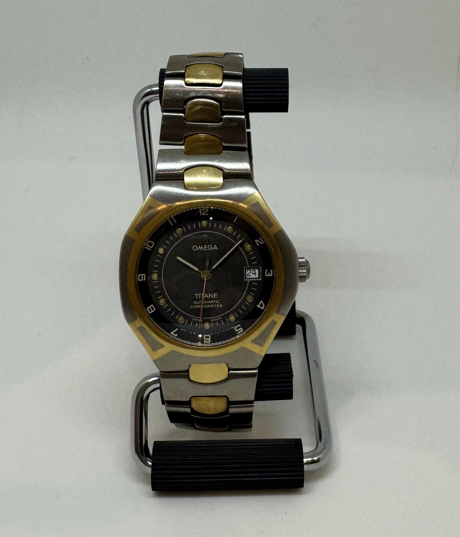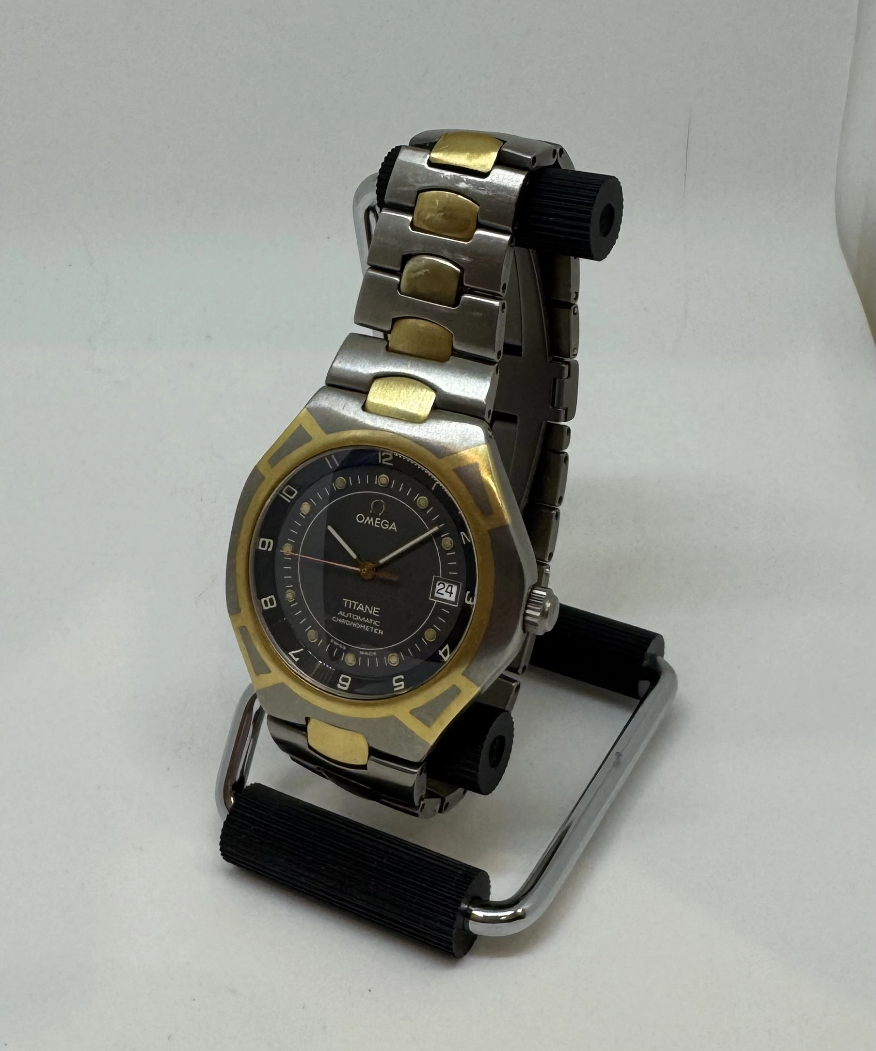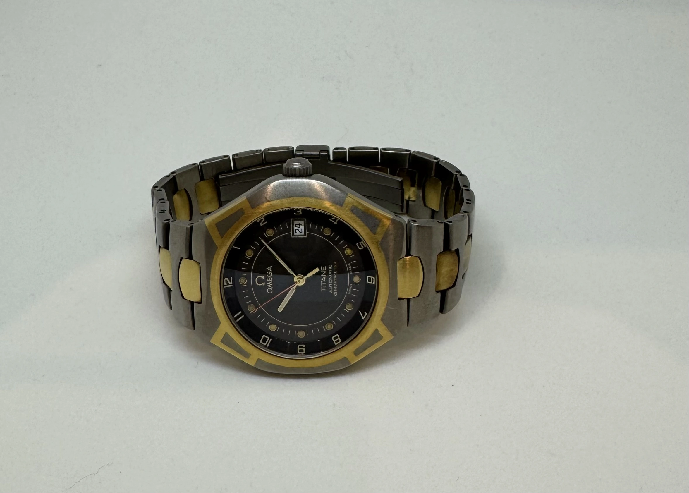 I will probably regret this but downsizing the watch box. This is an incredibly unusual version of the Polaris Titane in Omega's international collection from the 1990s. There are plenty of the small quartz versions around, but this is the automatic Chronometer with quickset date. This is apparently a Genta design with two tone Titanium and Gold case achieved with an Omega proprietary process, and an incredibly comfortable titanium bracelet with gold centre links and locking butterfly clasp.