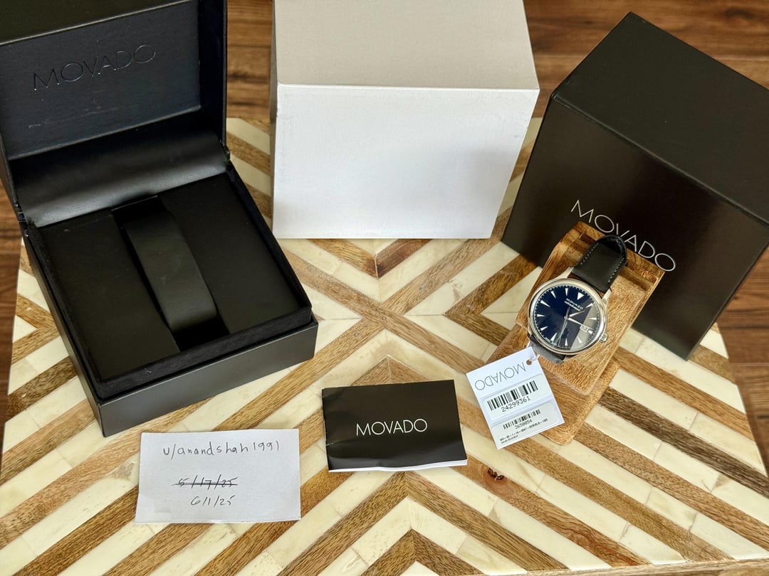 Up for sale is brand new Movado Calendomatic 40mm dress watch with automatic Swiss ETA 2824-2 movement. This is your opportunity to get an automatic movado for price of quartz. It is in brand new condition and comes with full factory kit. There are no signs of use. There may be some creasing of leather strap from watch storage. Quick Specs: MSRP: $995 Case Material : Stainless steel Diameter : 40mm Thickness: 10mm Glass : Sapphire Crystal Dial: black dial with silver indices and silver hands Movement: ETA 2824-2 Water Resistance: 30mm Power Reserve: 42 hours I’m asking for a reduced $400 shipped from NJ USA. Zelle preferred, wise, PP F&F/Venmo also accepted. References: please check out my feedback https://watchcharts.com/repcheck/watchuseek/anand.shah1991/feedback AND https://watchcharts.com/repcheck/reddit/anandshah1991/feedback I am comfortable with FaceTime calls and in person transaction