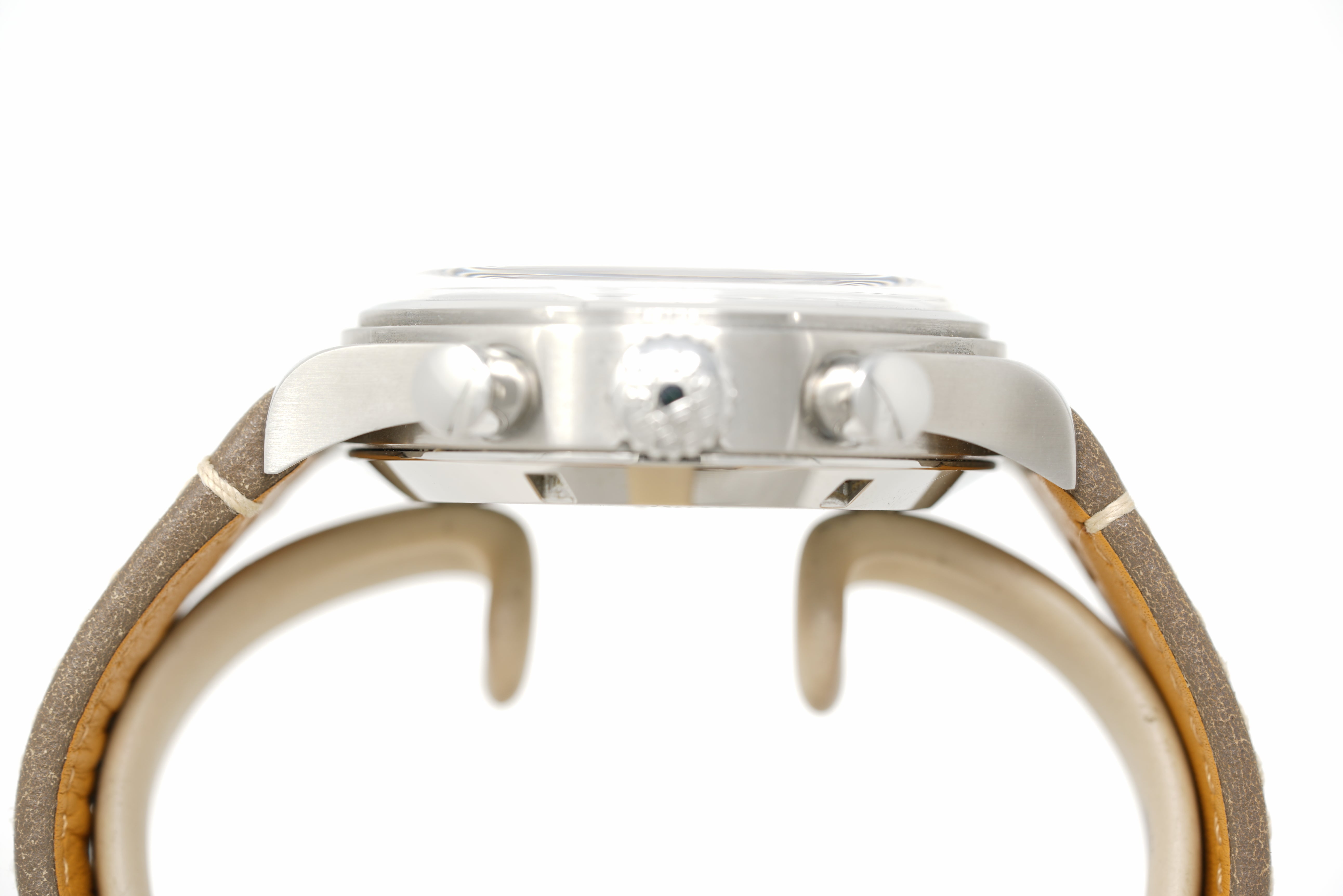 This pre-owned watch is in 93% condition due to slight marks on the sides and back of the case. The strap is in 94% condition due to minor wear and creasing. Also included is an aftermarket strap in 94% condition due to minor wear and creasing. Originally purchased in May 2021, this watch comes with its inner and outer box, instruction manual, warranty card, original purchase receipt, hangtag, and the one-year Topper Pre-Owned Select warranty.