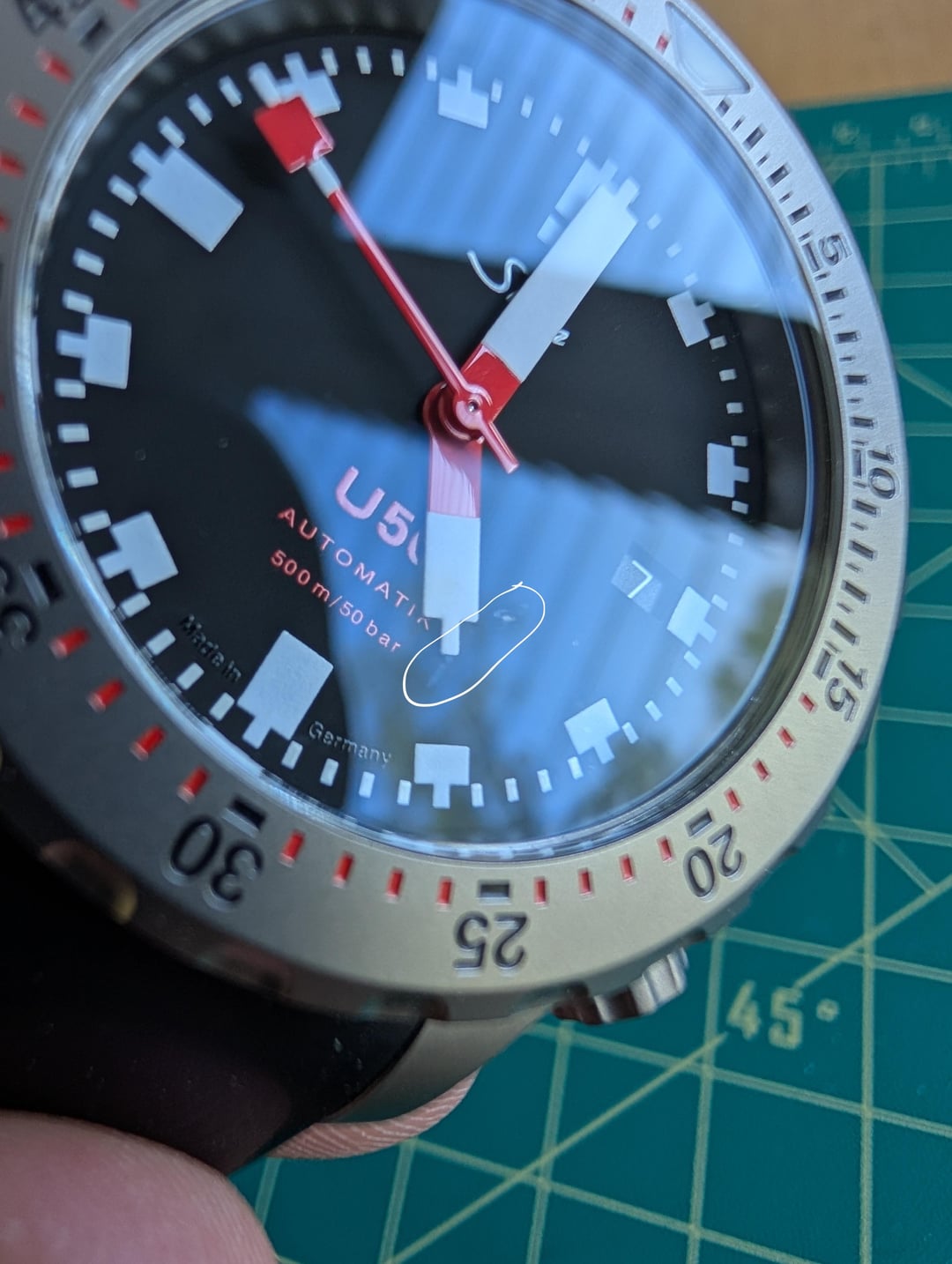 Hi everyone, Selling my Sinn U50 T Fully Tegimented on the silicone strap. It's an awesome watch, but I'm downsizing my collection. Please see my other posts for more. Excellent working condition with a few cosmetic issues (please see pictures): - Small scuff on the bezel by 12 o’clock (see images). The tegimented case is strong, but I somehow managed to ding it on a rocky scramble when kiting. - The crystal is clean except for a tiny mark, which only affects the AR coating. It's barely visible, but I tried to capture it in the photos (see the circled part). - Silicone strap is sized for a 6.5" wrist. Light swirls on the finish in places. What's included: Watch + box, papers, and original strap. Price: $2300 shipped CONUS. Payment by PayPal F&F or Venmo. No trades. I’ve got some history on this sub from a few years back and can share my eBay feedback if you’d like extra peace of mind. Happy to answer any questions!