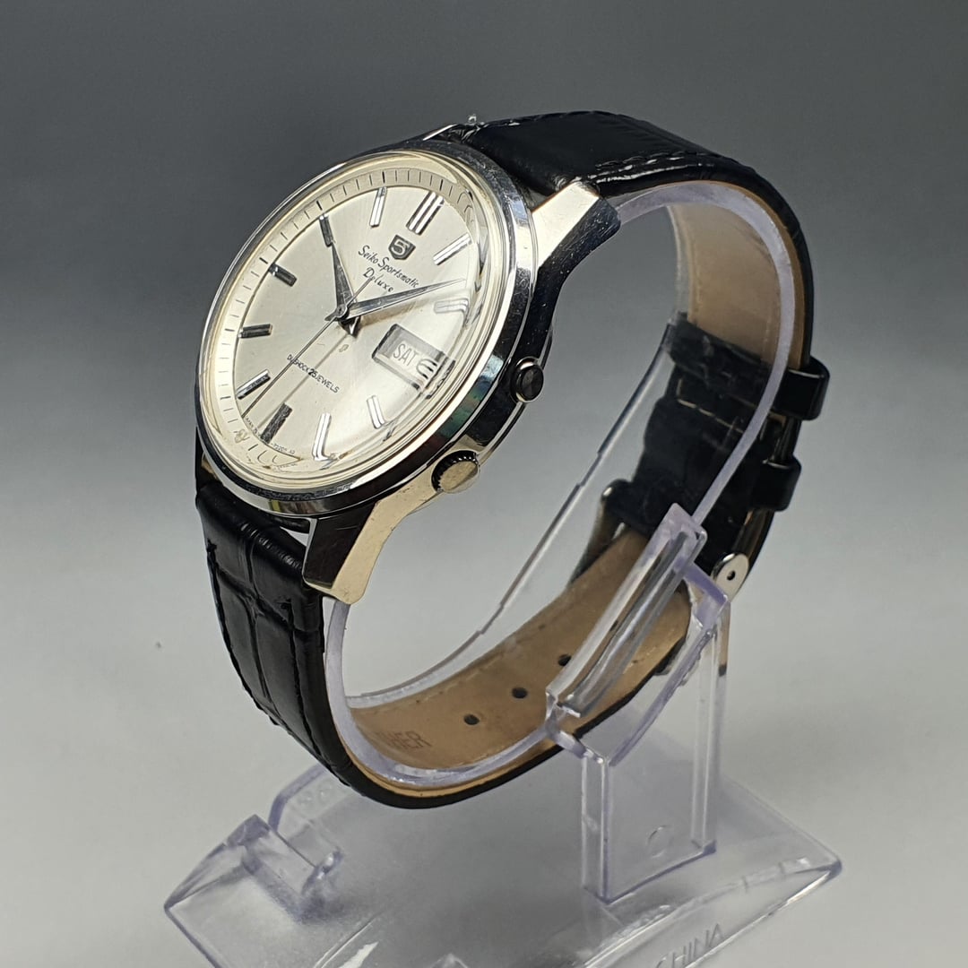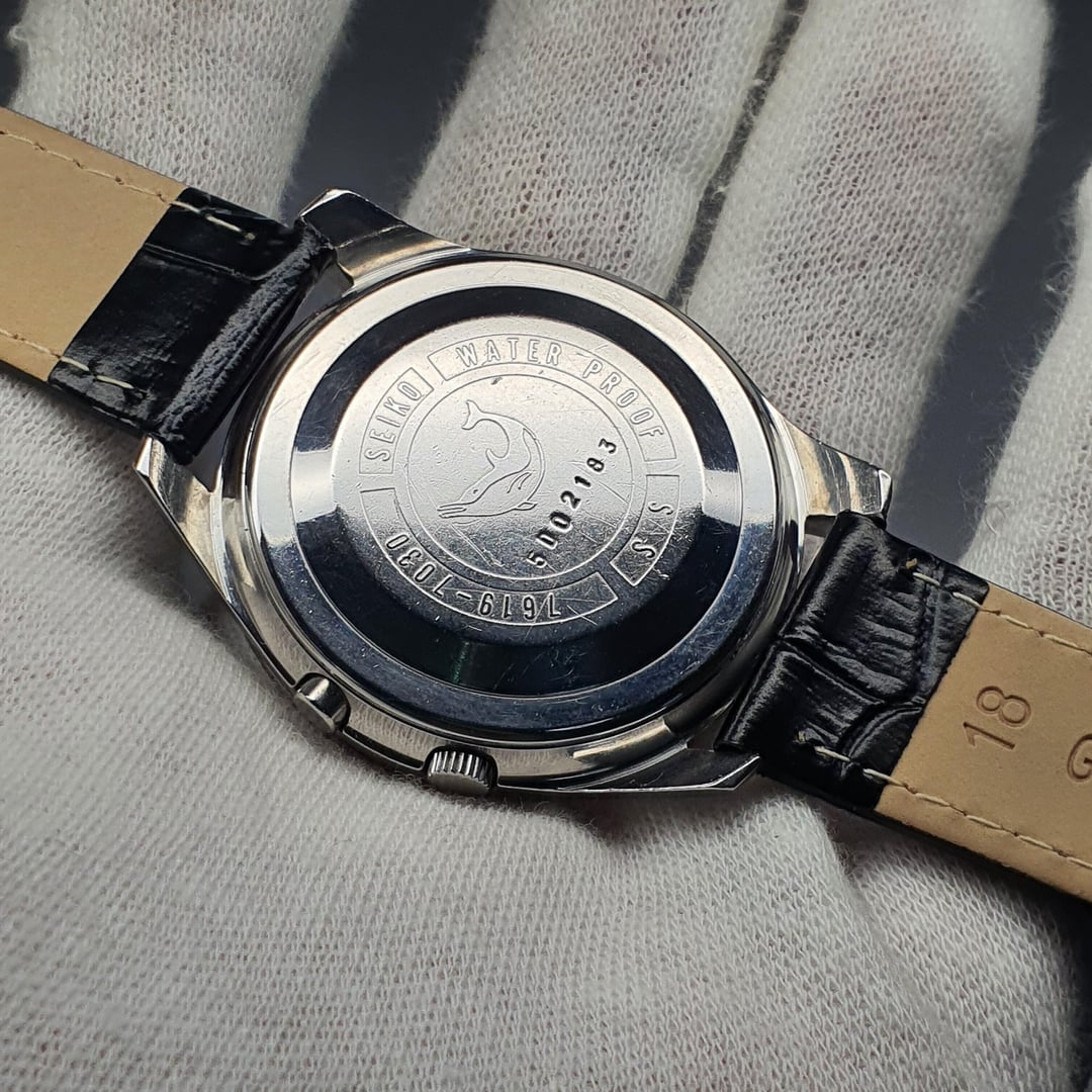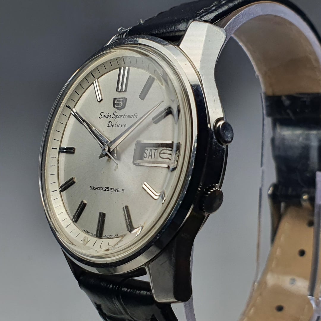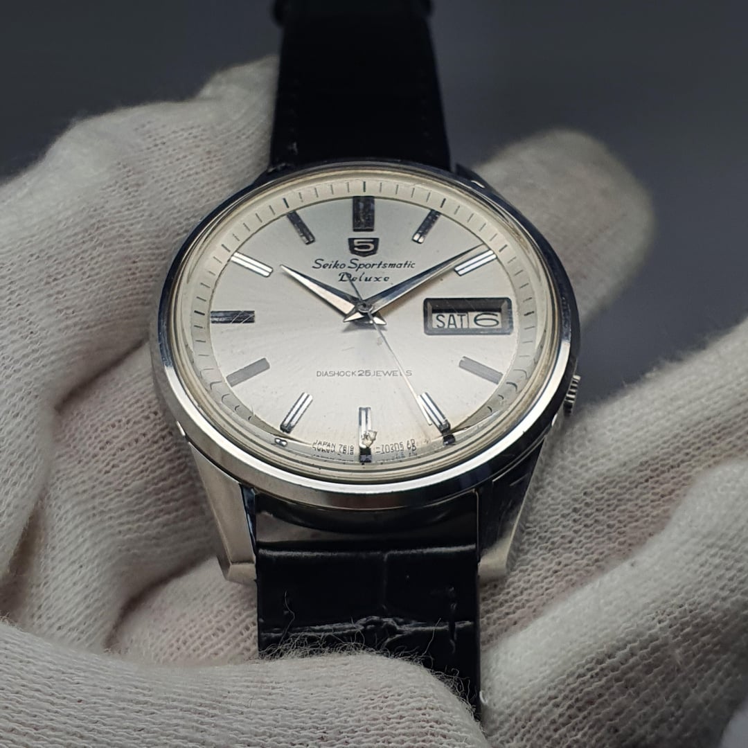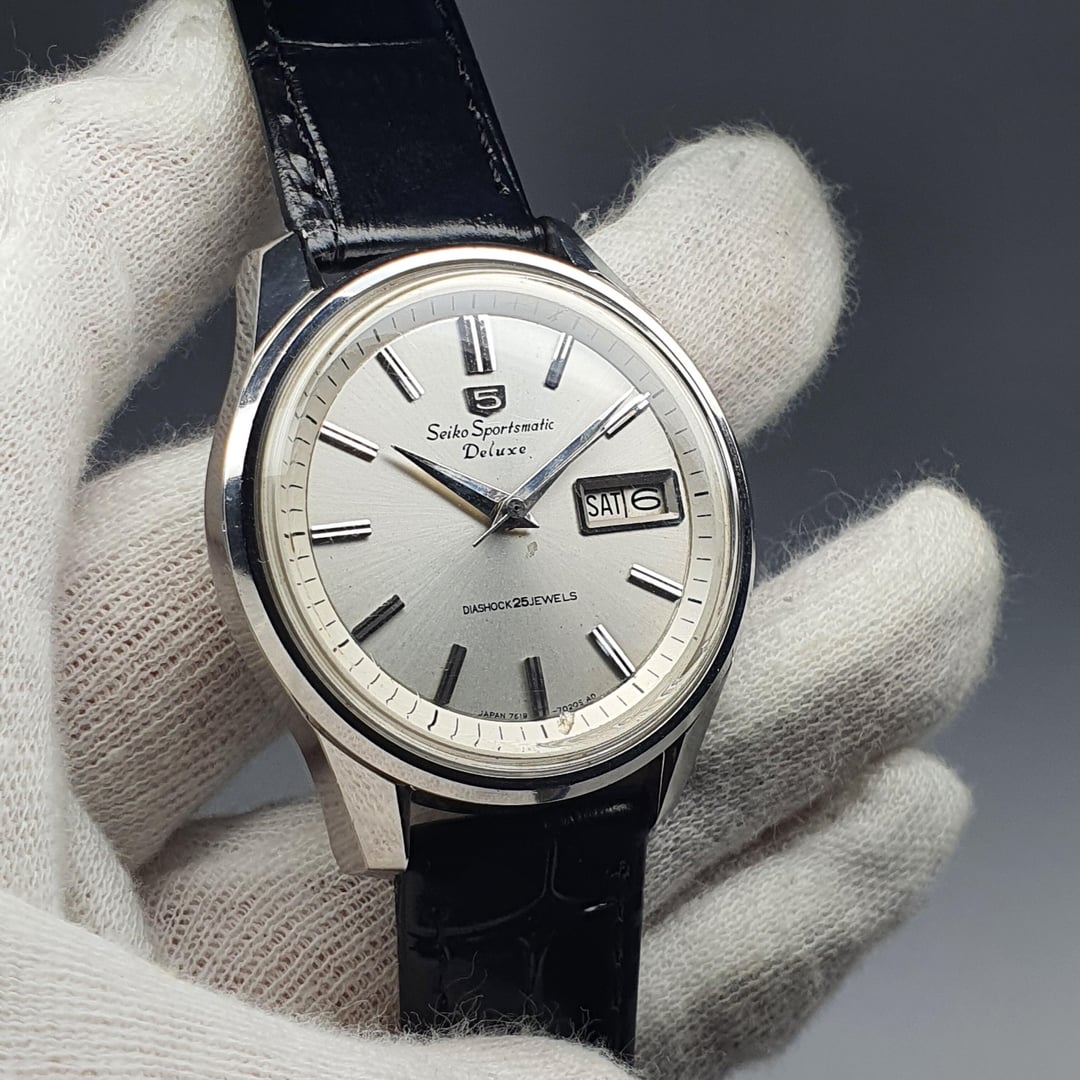 For sale is this vintage Seiko 5 "Sportsmatic Deluxe" (7619-7030), made in Japan in December 1965. The condition is fantastic for a 60 year-old watch. The famous Seiko 5 series was introduced just 2 years prior to the release of this watch in 1963 with the core principles of every Seiko 5 watch to be automatic, have a day/date function, have water resistance, a recessed crown at 4 o'clock and to be durable for everyday wear, all of which still carry on to this day. This model is a classic example of Seiko's design, balancing presence with elegance. This design was released prior to when Seiko started homogenising their now-ubiquitous Seiko logo, that adorns all Seiko watches, making this quite a rarity. The sunburst dial is a silvery white and pairs nicely to the high-polish stick baton indexes, which have subtle but detailed facets. The sharp dauphine hands are classic Seiko style. The minute track is on the rehaut, which prevents the dial from feeling too flat and gives it a more sporty look (sporty for the '60s, this would be considered more of a dress watch nowadays). The "5" symbol is applied. The case has great proportions and carries on with the Seiko DNA, but with a slightly more "jumbo" size at 38mm as was the style in the '60s. Might be a good dress watch option for those who have average to slightly larger wrists, if you prefer a watch with some presence. The case back has the dolphin symbol signifying its water resistance. Note that it became illegal to write "waterproof" on watches around the late '60s/early '70s because past a certain depth, all watches eventually give in to the water pressure and therefore no watch could be completely called "waterproof" so from then on watch companies could only write "water resistant" to a certain depth. However, this watch was released prior to that. The calibre 7619 movement is a work-horse movement, very robust in its design. Keeps good time. I would assume the reason why this model was a "deluxe" is due to a special function where there is a button above the crown that quick-sets the date forwards with each push - a very handy feature that I don't understand why they don't do anymore! The day change is the slow-set type. The watch is in great condition for its age and only has minor wear on the case, dial and crystal. There is a small chip in the crystal at the 6 o'clock. General wear is expected. Comes on a brand new strap. Dimensions are: 38mm x 43mm x 12.6mm Lug Width 18mm Bought in Japan. Looking for $260 net (buyer pays Paypal fee) International Tracked Shipping $10 More pics: [https://flic.kr/s/aHBqjCmH3H](https://flic.kr/s/aHBqjCmH3H) \*Returns accepted but all return postage costs are the buyer's responsibility in all circumstances.