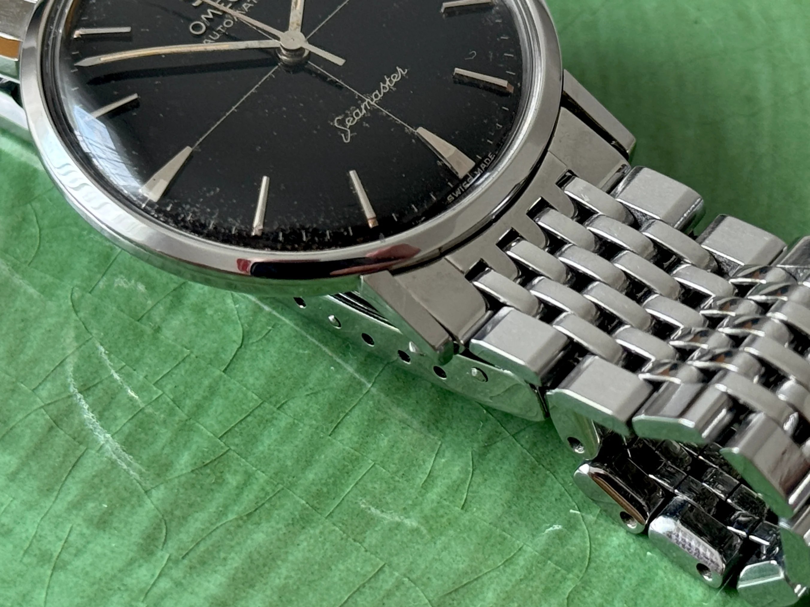 Bracelet: Original Omega Beads of Rice bracelet, ref. 8270 with #70 endlinks. Those 7-row BoRs are the correct style for Seamaster DeVilles and are a great fit. It shows some scratches on the clasp, of course, but is in good shape overall, with a stretch level I would consider very low for BoRs. Length is great, I have a 18.5cm wrist and use the middle oft he 7 holes on the clasp. 20cm wrists will definitely work, if you need me to measure more precisely let me know.