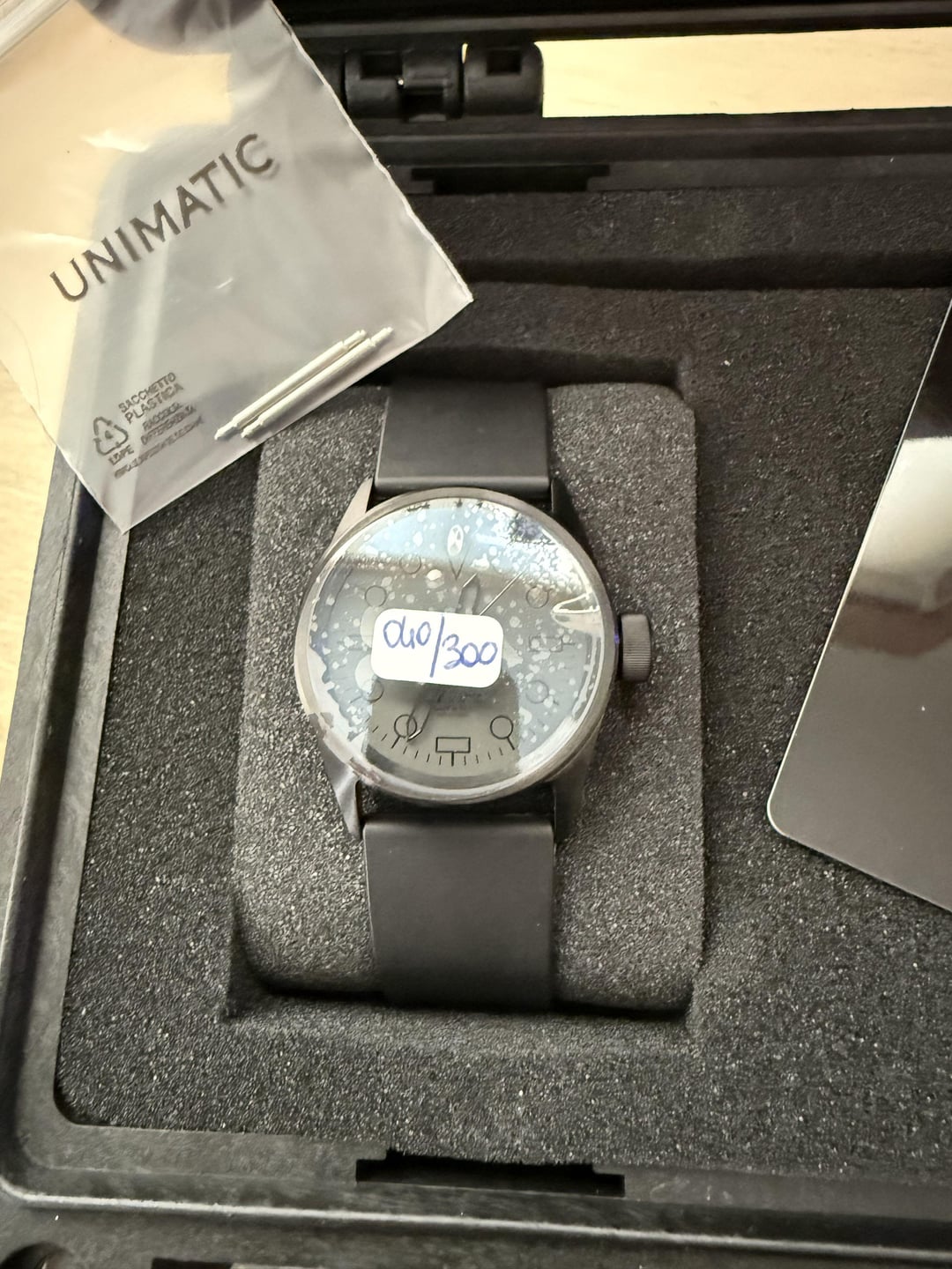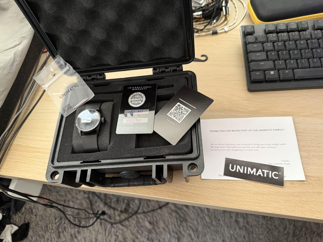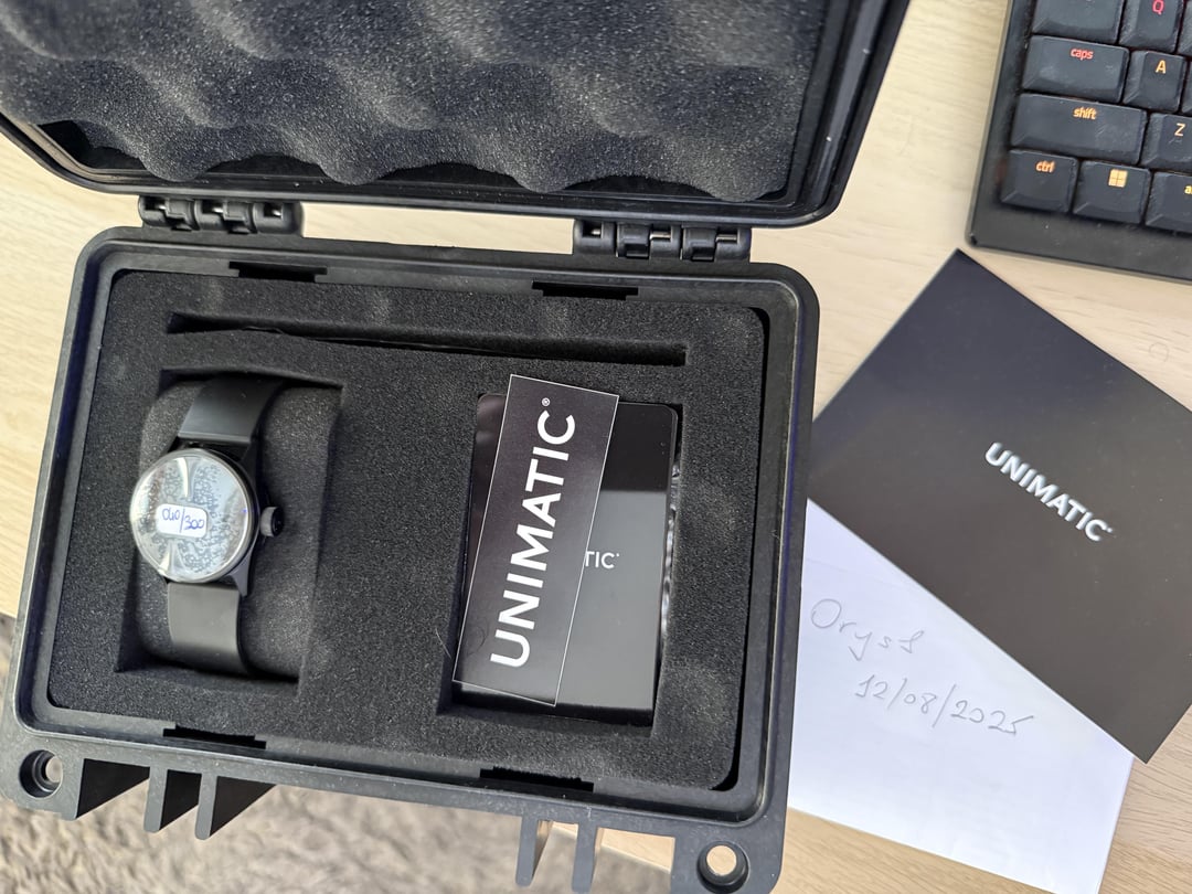 Purchased the watch new with Unimatic seal on 21st of July 2025 and received it on the 25th of July 2025. I tried it and found it small for my thick wrist. The watch is literally brand new, I just had to break the seal to try it. I can provide proof of purchase if anyone needs it. Just don't want to go through the hassle of sending it back because I am not getting the tax money back anyway and don't want to spend more on the shipping. Asking 750 euro shipped by standard shipping. If bu8yer wants faster shipping then we will need to discuss that because it will be extra. Payment: Paypal (fees on the buyer)