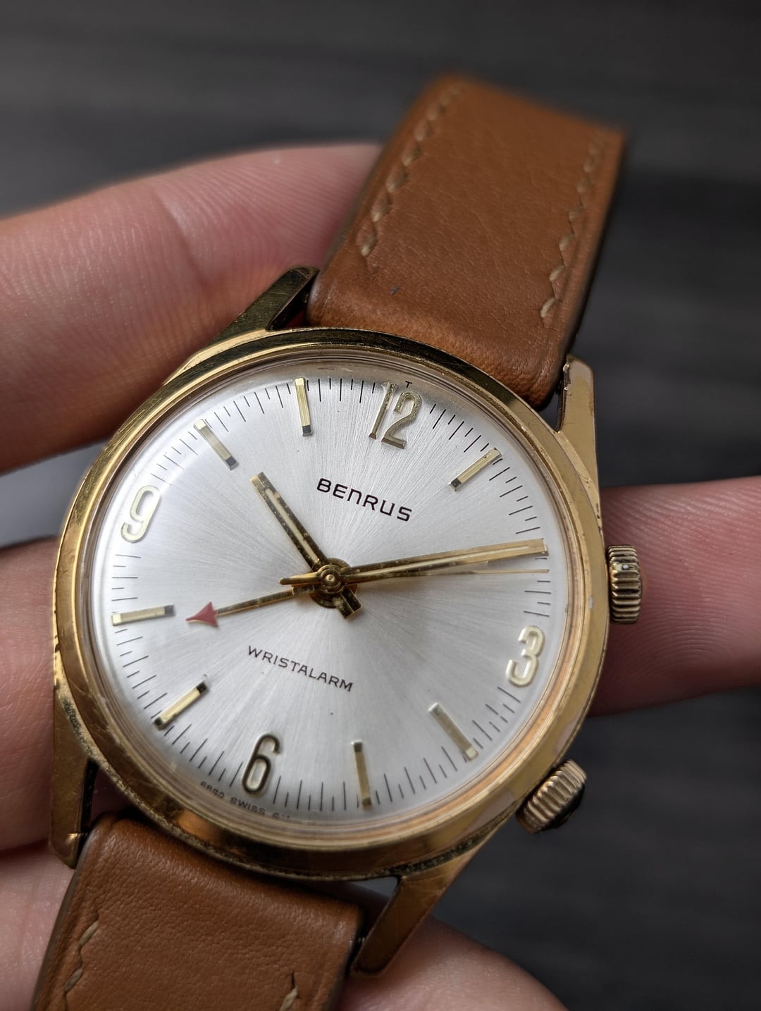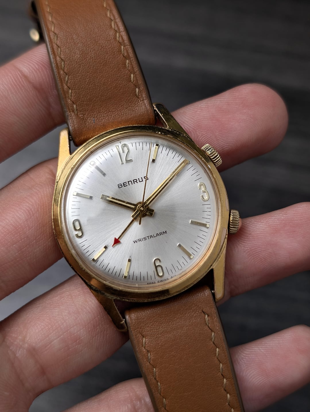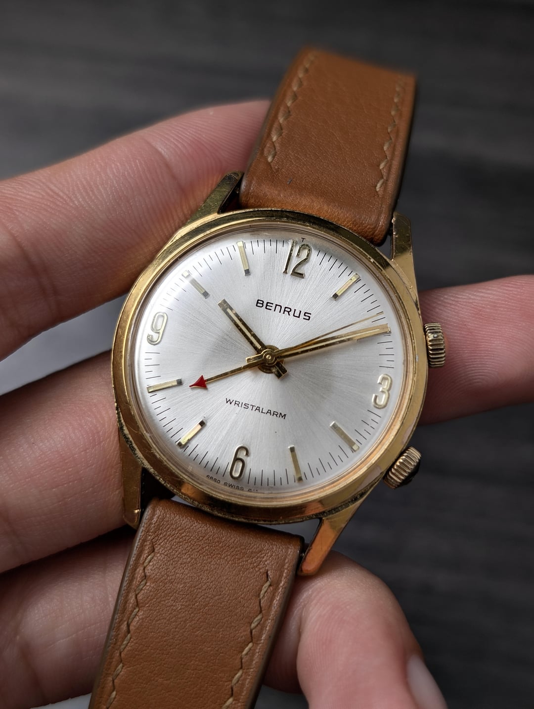 **SPECS:** Manufacturer: BENRUS Ref. number: Wrist Alarm Movement: Handwinding mechanical Case Material: 20 micron gold plated Crystal: Acrylic Band: Genuine leather strap Box/paper: No **CONDITION:** The service history is unknown, but the watch is running +-15s/day with an amplitude of 260. The case has some scratches and chips as expected from a 1960s watch. The crystal and dial is in good condition. There are some specs of dust on the dial. All are original. Case (w/out crown): 34 mm Lug to Lug: 42 mm Lug Width: 18 mm Thickness: 11 mm **PRICE:** I’m asking for 245 USD shipping included (CONUS). I accept Paypal FF or Paypal G&S + 4%, Zelle, and Venmo. Or local pickup in OC or LA (I might consider a trade if you are local). The watch will be shipped with UPS or USPS and fully insured. **Please check out my** [profile ](https://www.reddit.com/user/Friendly_Giraffe_421/submitted/)**for more interesting pieces. Thanks**!