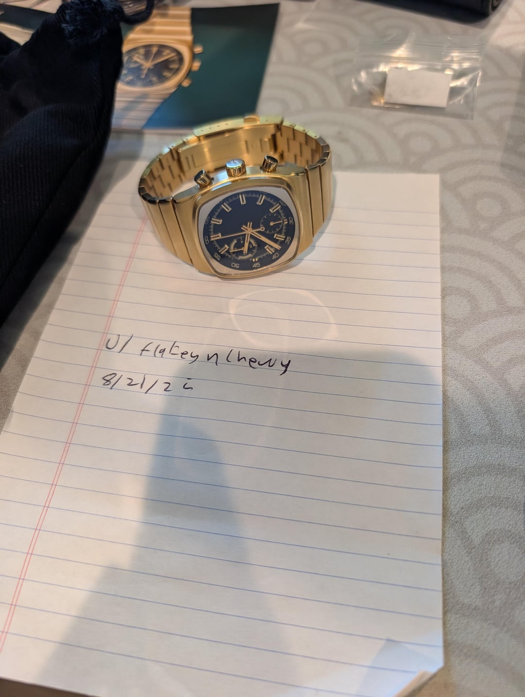 Hey All, Been a minute, making some room in the collection by selling one of my pieces that isn't getting a lot of love. I've probably worn it a dozen times total since purchase (original owner) and in my inspection I thought I could \*maybe\* see a few desk diving scratches on the clasp. Watch ships with all the original goodies as pictured, in the original box. Shipping is included. Price: $390 Details: * **Case Size:** 36mm * **Lug to Lug:** 41.5mm * **Thickness:** 11mm * **Case Color:** Gold * **Complications:** Chronograph * **Crystal:** Sapphire Timestamp: [https://imgur.com/a/Ymhtefs](https://imgur.com/a/Ymhtefs)