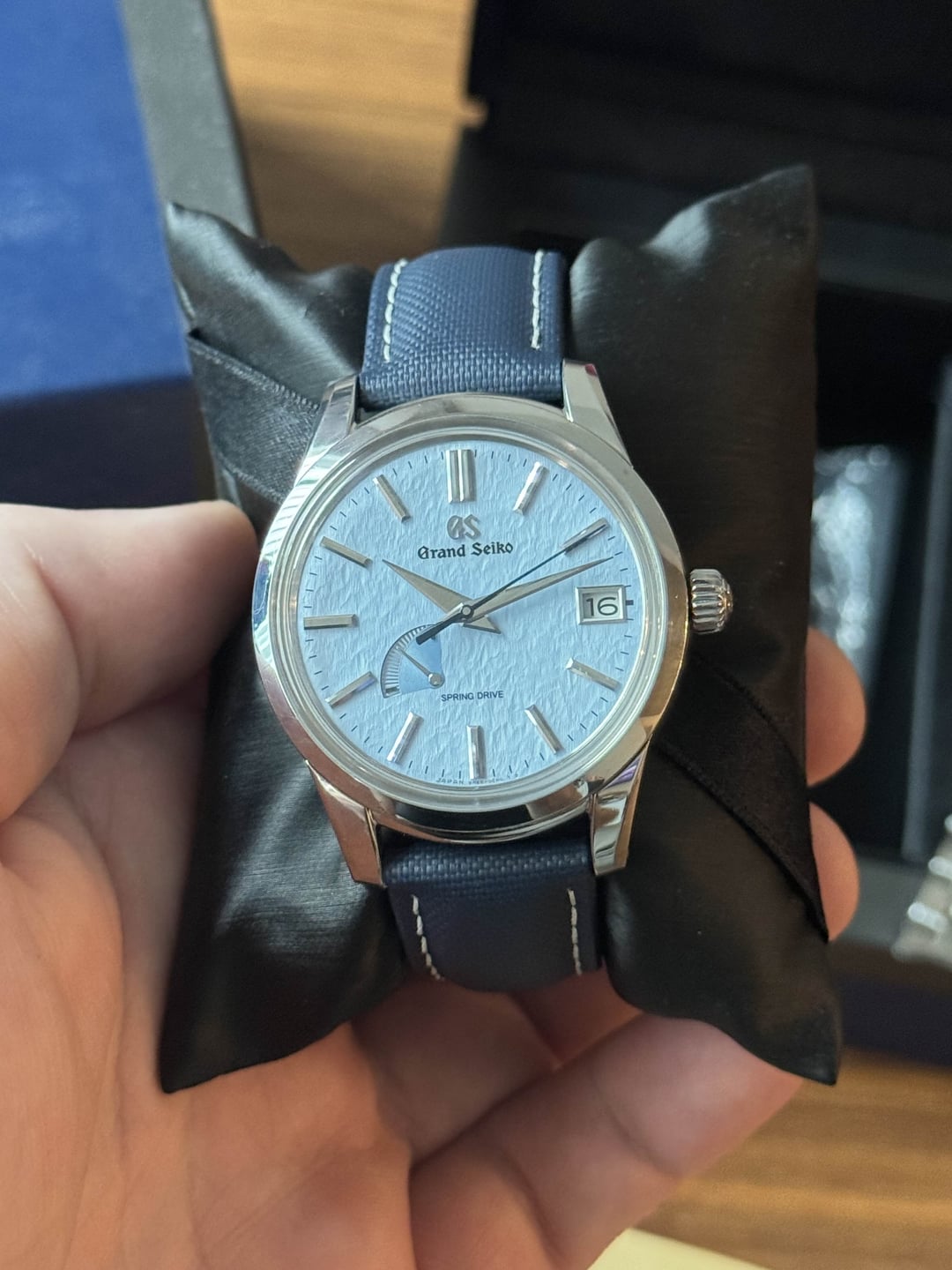 Up for sale is my Grand Seiko SBGA407, better known as the “Skyflake.” This reference is one of Grand Seiko’s most admired, featuring the iconic textured light-blue “flake” dial paired with the smooth Spring Drive movement. The 40.2mm stainless steel case with Zaratsu polishing strikes the perfect balance between elegance and presence. Details: Reference: SBGA407 Movement: 9R65 Spring Drive (72h power reserve, ±1s/day accuracy) Case: 40.2mm diameter, \~12.8mm thick, 19mm lug width Crystal: Sapphire (with GS logo applied at 8 o’clock) Water Resistance: 100m Bracelet: OEM Grand Seiko stainless steel bracelet (rarely seen with the Skyflake) Straps: OEM crocodile strap with signed deployant clasp + navy Artem sailcloth strap with deployant clasp Condition: I wore this watch. Some hairlines present on case, bracelet, and clasp consistent with normal use — nothing deep. Crystal is flawless. Please see pictures for the best representation. If you'd like more photos or a facetime call, let me know! Set: Comes with inner and outer box only. No papers. Price: $3500 shipped. Payment via Paypal F&F. Ships insured within CONUS. Timestamp & Photos: [https://imgur.com/a/otw8xrn](https://imgur.com/a/otw8xrn) The Skyflake is stunning in any light, shifting from icy blue to silvery white. This example is especially versatile — it comes on the uncommon OEM bracelet, the classic GS crocodile strap, and a premium navy Artem sailcloth strap with deployant. Only letting it go to fund another piece.