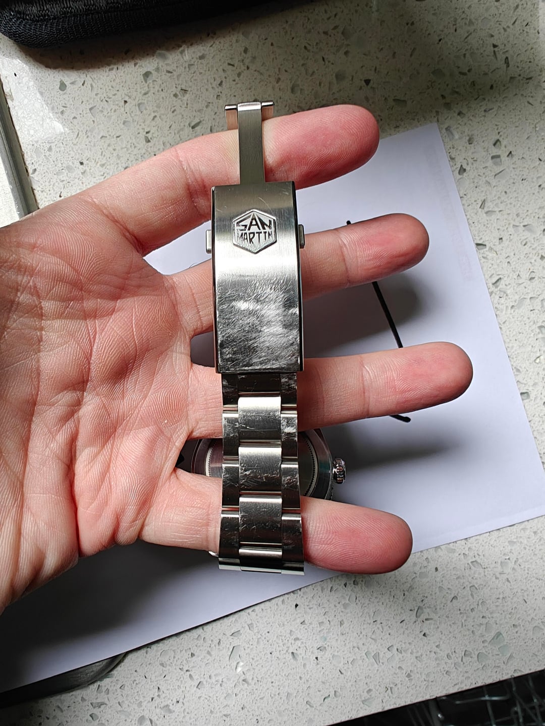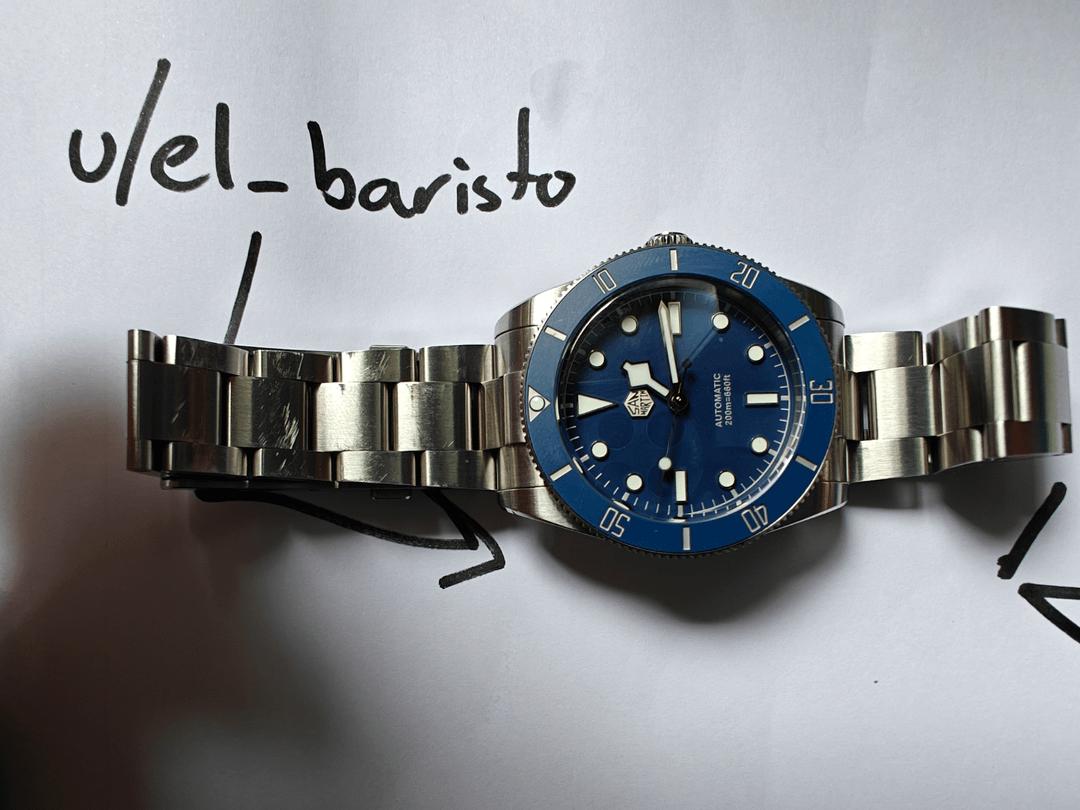 Hi all! Up for sale is a lovely San Martin Tudor black bay homage in blue. Ceramic bezel, bwg9 lume, nhovement sapphire domed crystal, it's a spec monster. Well loved by the previous owner but keeping good time. Here's the rub- the previous owner used blue (semi permanent) loc Tite on the screws, so if your wrist is in the 7.5 inch range like mine, it's already perfectly sized with a beautiful toolless micro adjust. Included will be the watch, bracelet, extra links, and San Martin leather case. Considering the bracelet is a pain (but not impossible) to resize and the overall condition of the watch and scratches on the bracelet, I'm willing to part with this guy for $120 shipped to the CONUS OBO. Feel free to see my other listings and put together a package deal.