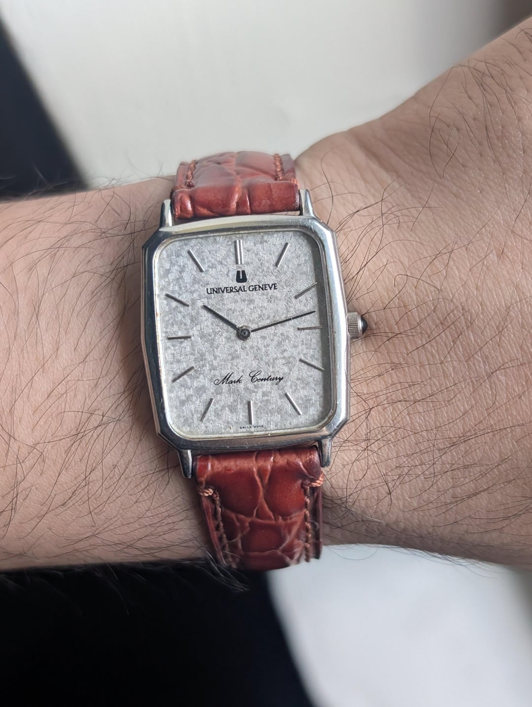 Greetings watchexchange! Up for sale is a beautiful vintage UG Mark Century with a frosted dial. The watch is an elegant quartz tank dress watch in beautiful condition as pictured, and has an onyx crown. The watch runs well, and comes on a 16mm aftermarket leather strap. [Timestamp ](https://drive.google.com/file/d/1GdCye4MX5xRkkK9idsWuKhwhGp4HtDkx/view?usp=drivesdk) The watch is priced to sell at $249 paid via Zelle or Wise and shipped via UPS. Please allow 3 to 5 business days of your payment for the watch to be shipped out, and note that customs if incurred are buyer responsibility. Be sure to reach out to me if you have any questions or require additional photographs or information, I entertain requests for custom timestamps. Thanks for looking!