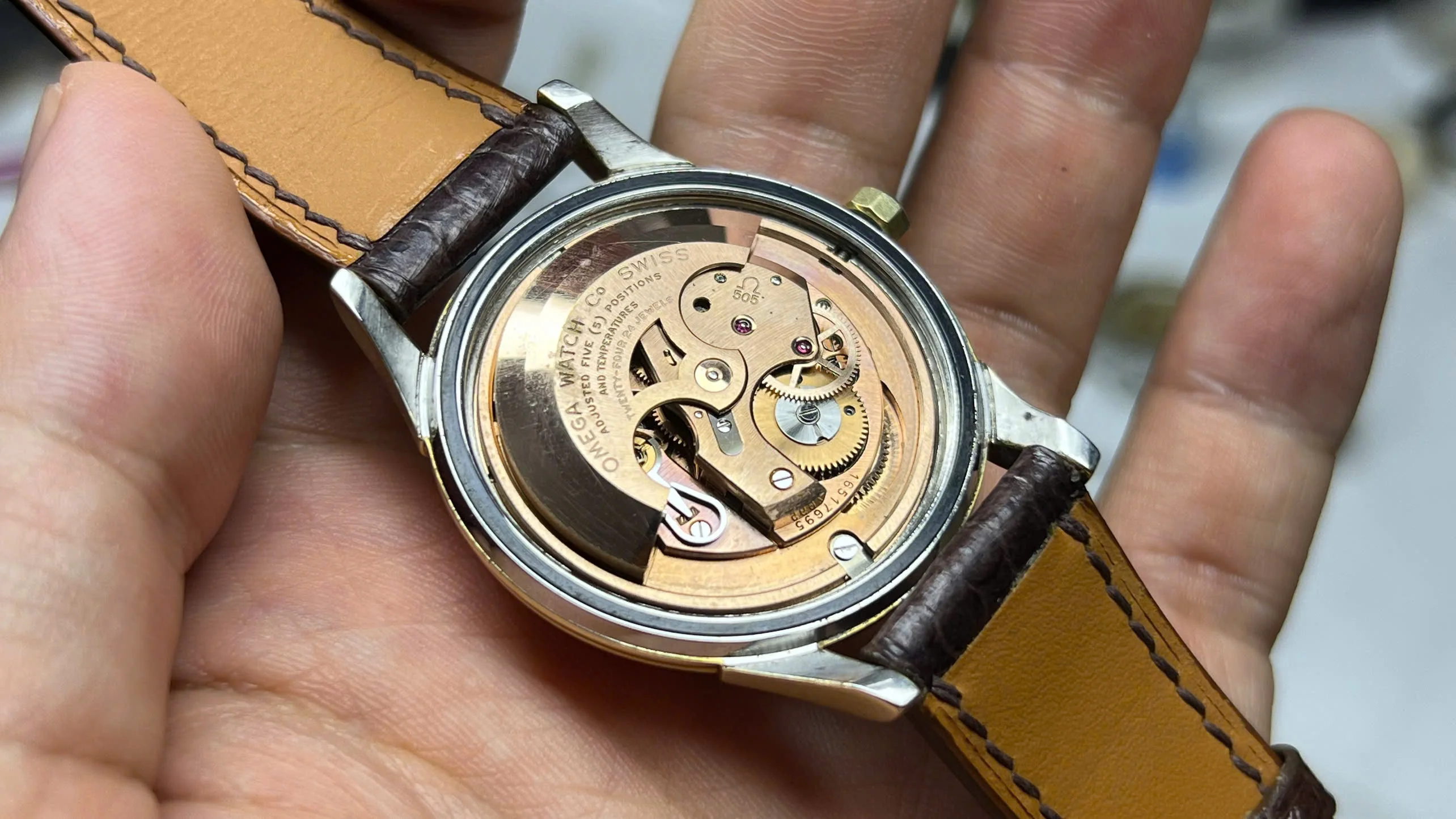 The watch is powered by Omega’s chronometer-rated Caliber 505, freshly serviced in August 2025 and running well. The movement’s serial number (16.51m) corresponds correctly with the production year and reference.