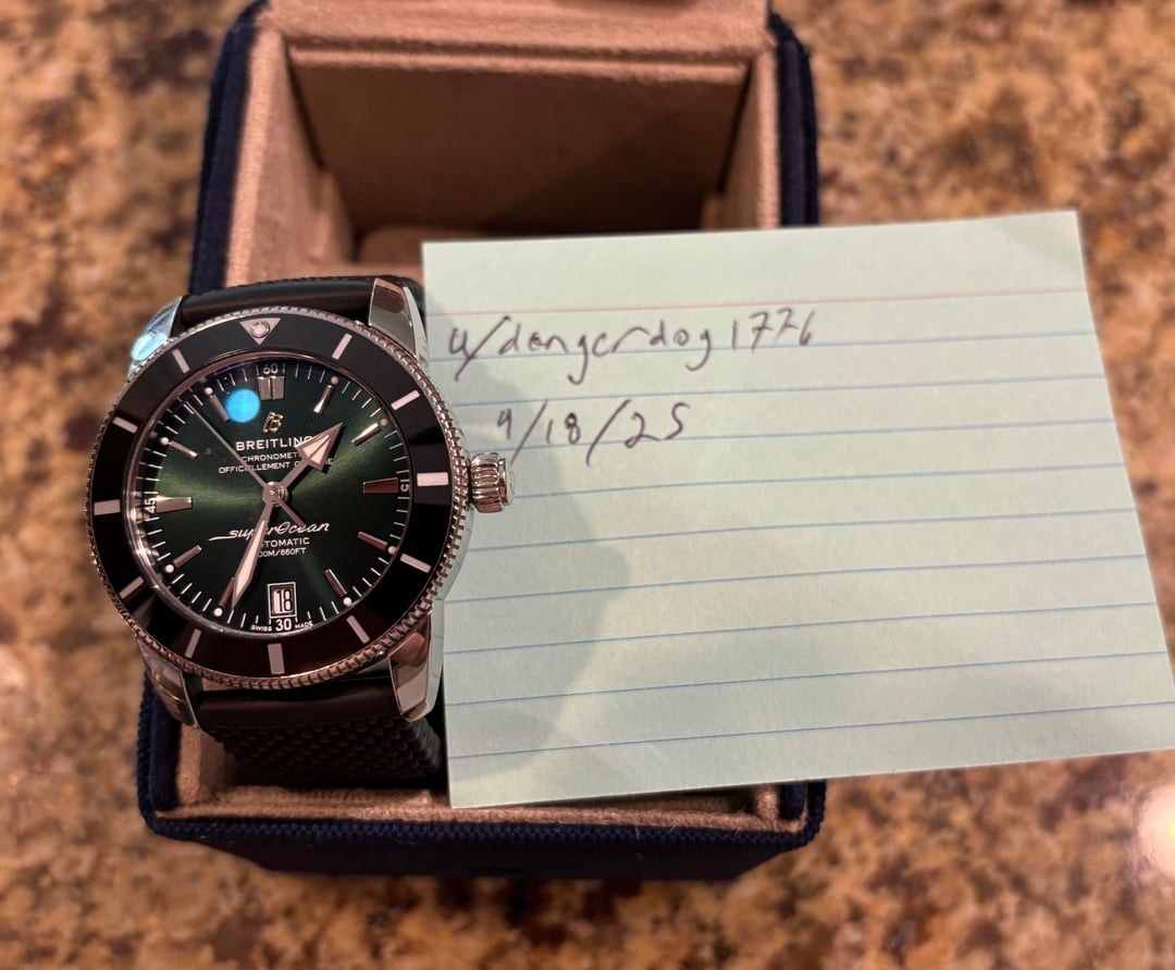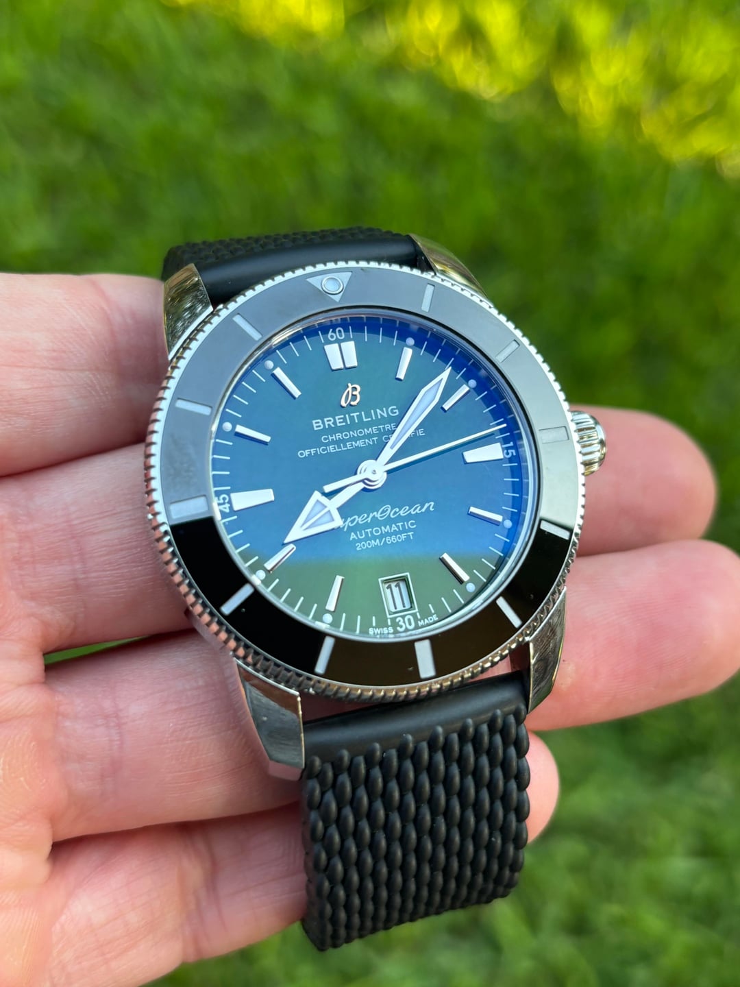 Up for sale is the Breitling Superocean Heritage B20 Automatic 42 with a rubber strap and a green dial. The watch is in good condition with minor wear and hairlines on the case and the most prominent mark being on the clasp (pictured). The watch runs great and is easily adjustable via the clasp mechanism. This comes as a complete set with box and papers and under warranty until 2028, asking price is $3500 CONUS shipping only.