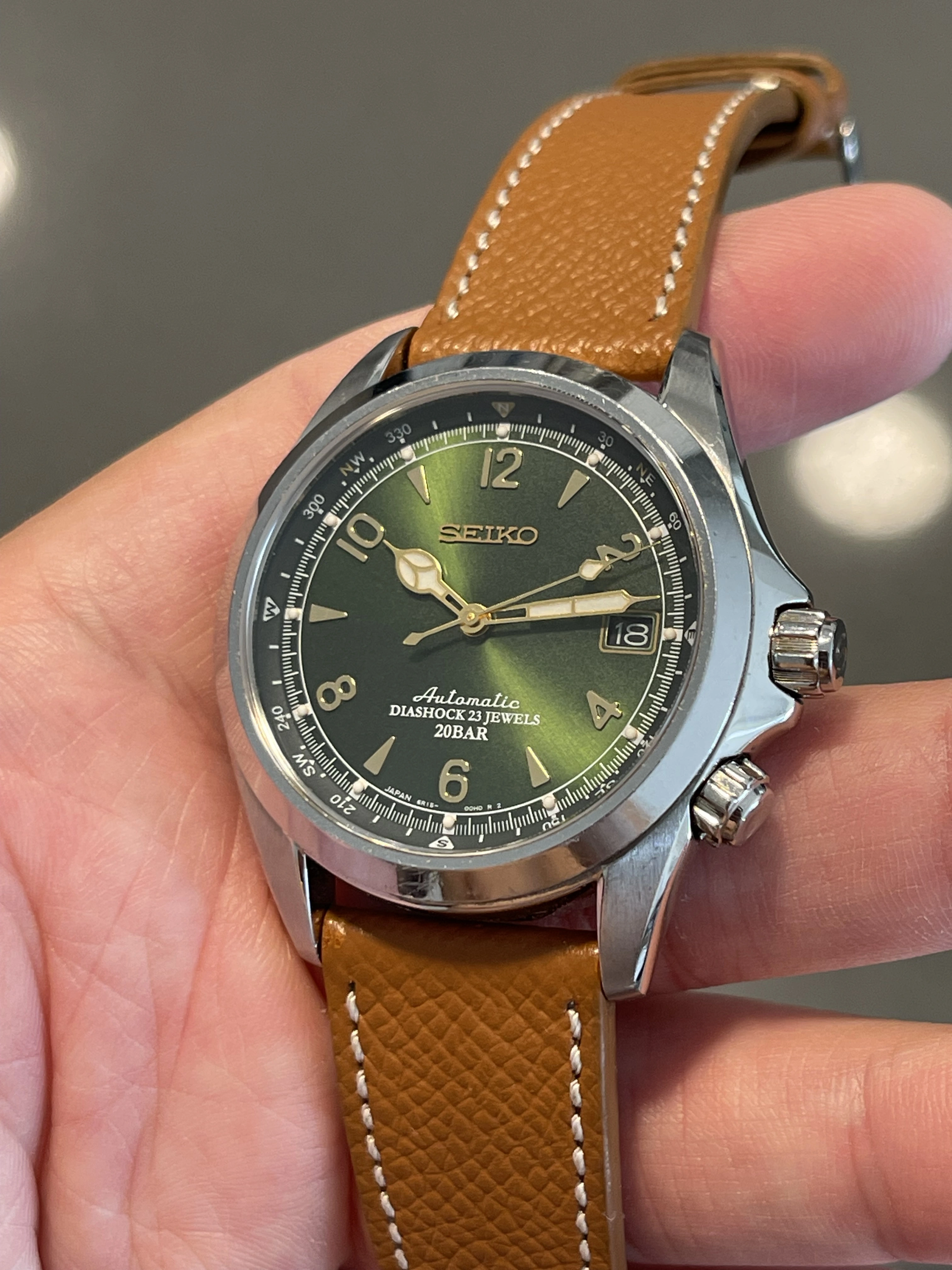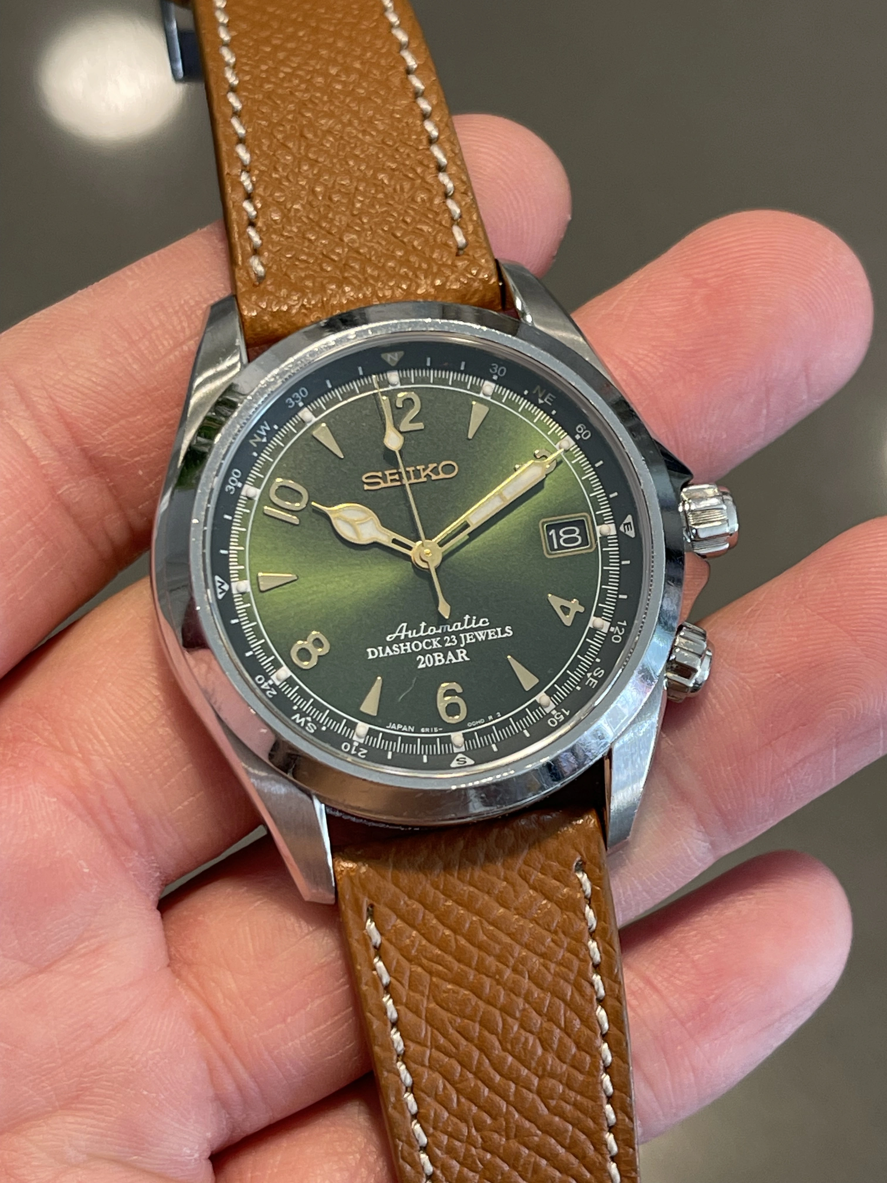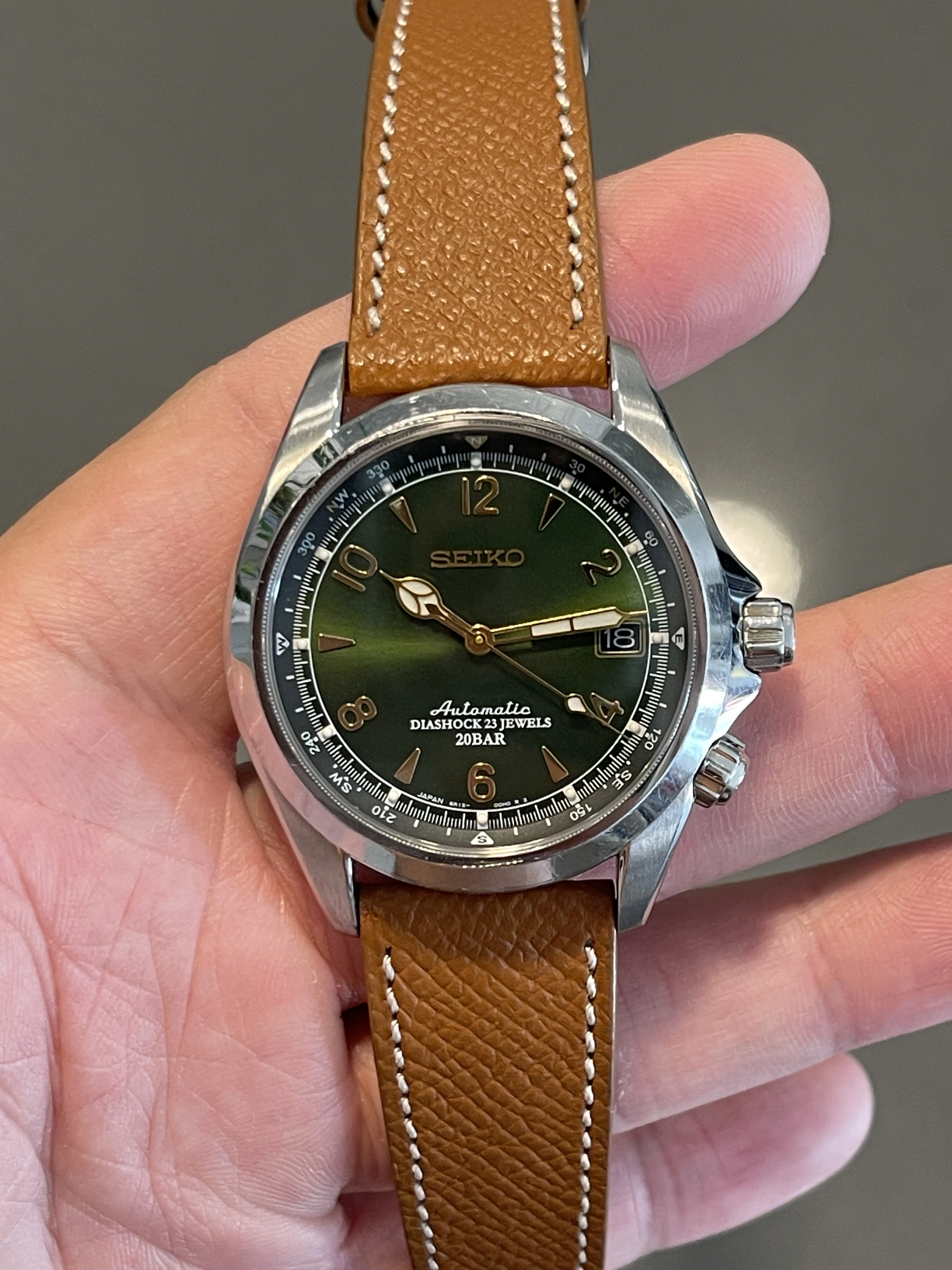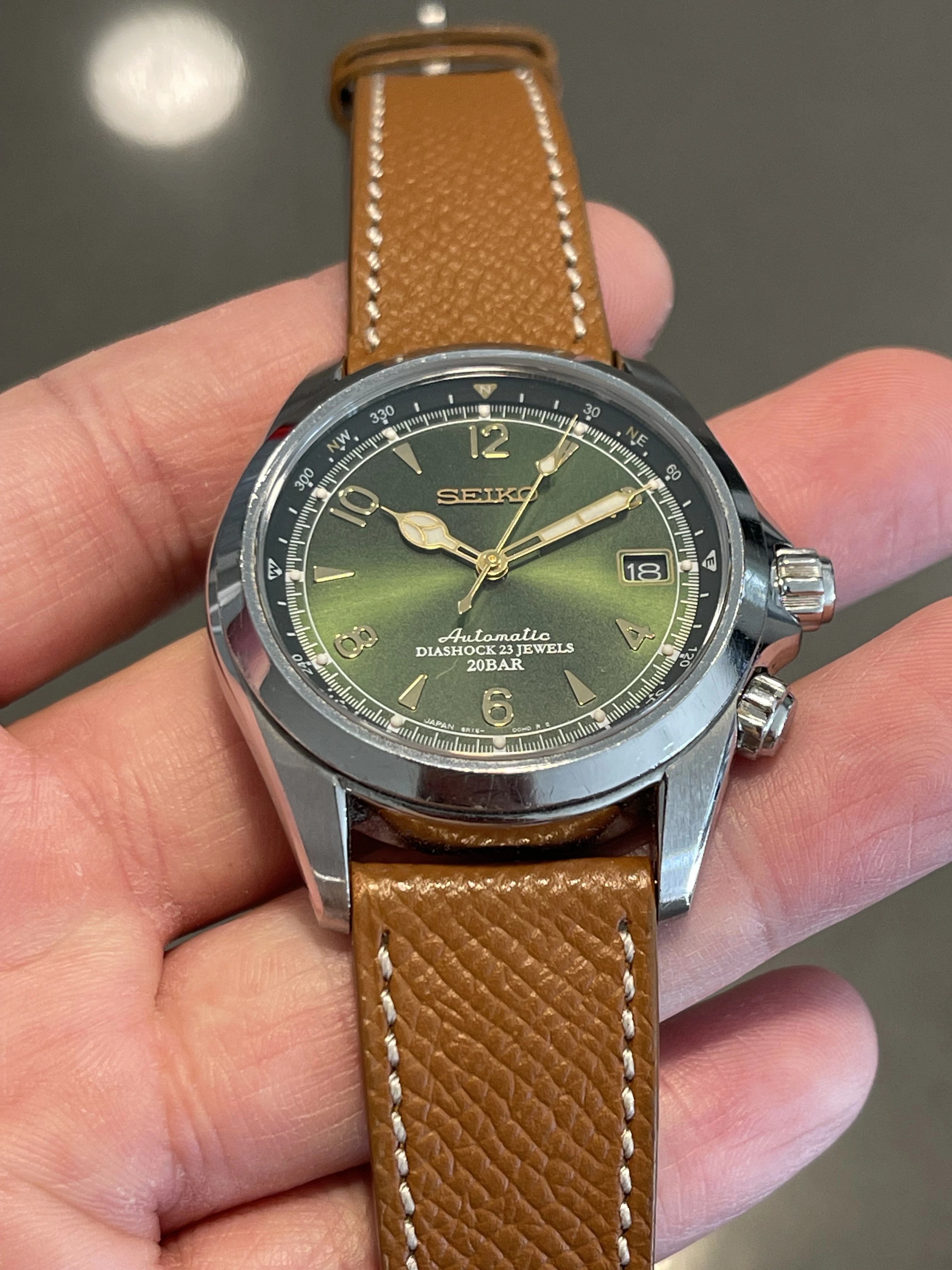 Iconic reference before Seiko introduced the current Alpinist collection. Complete overhaul in October 2024 (warranty/service card included in sale). Passed water resistance test and running strong with all original factory parts. I opted out of refinishing to keep the case unpolished with original bevels. Comes on a honey brown calf strap from Molequin. Green NATO included.