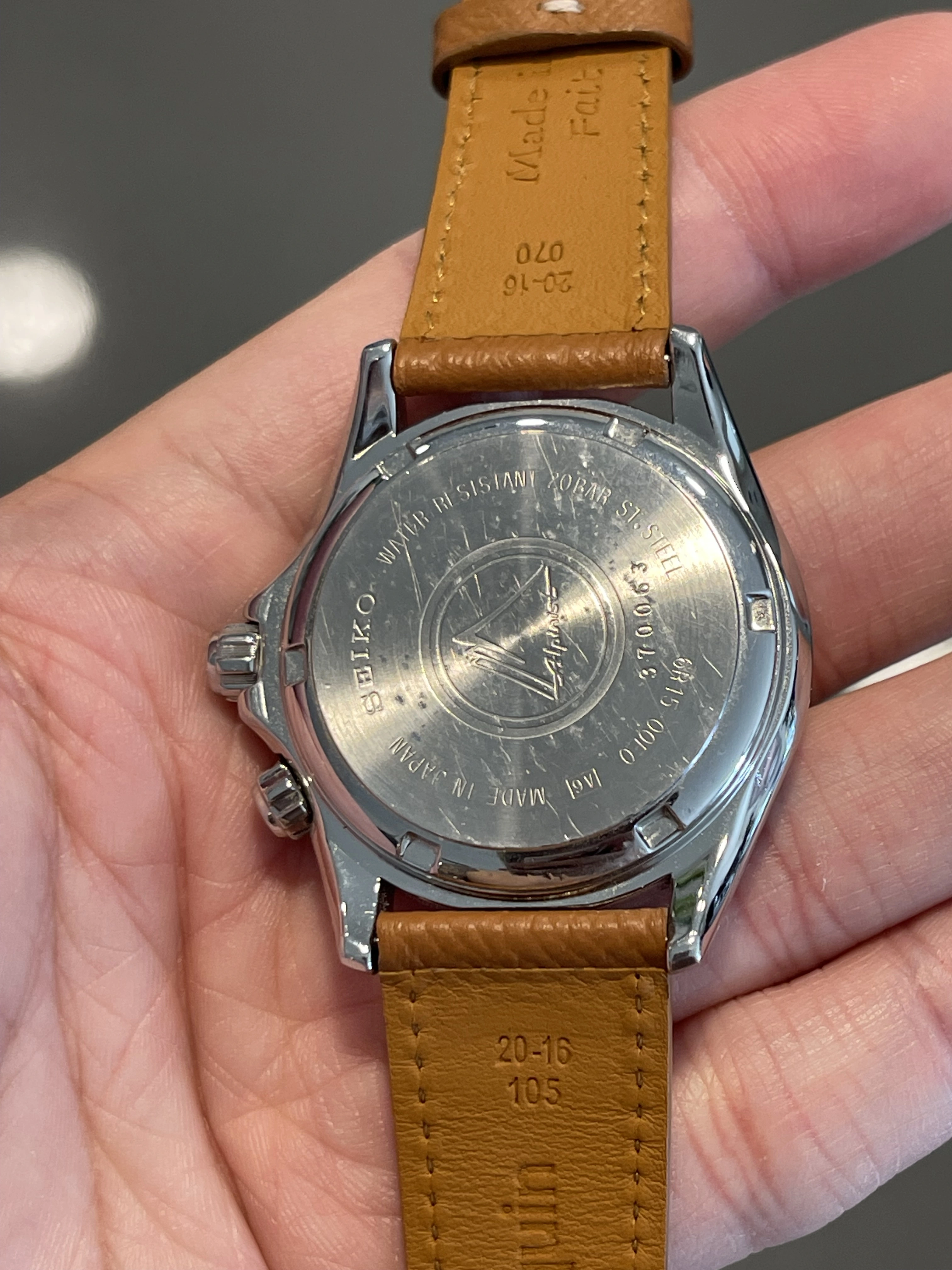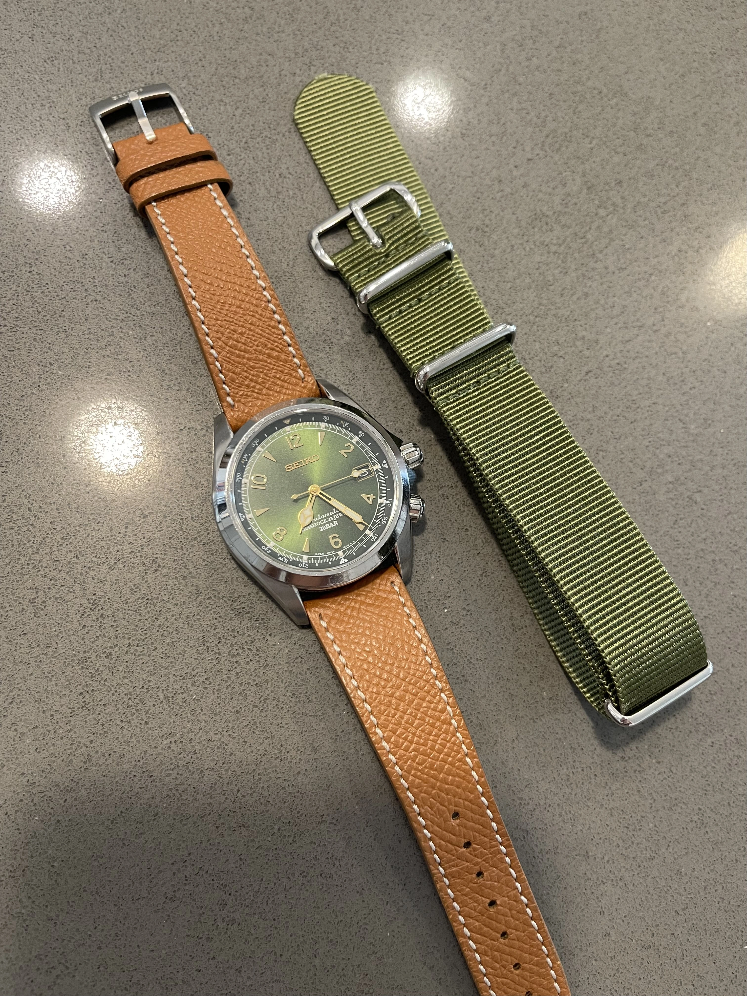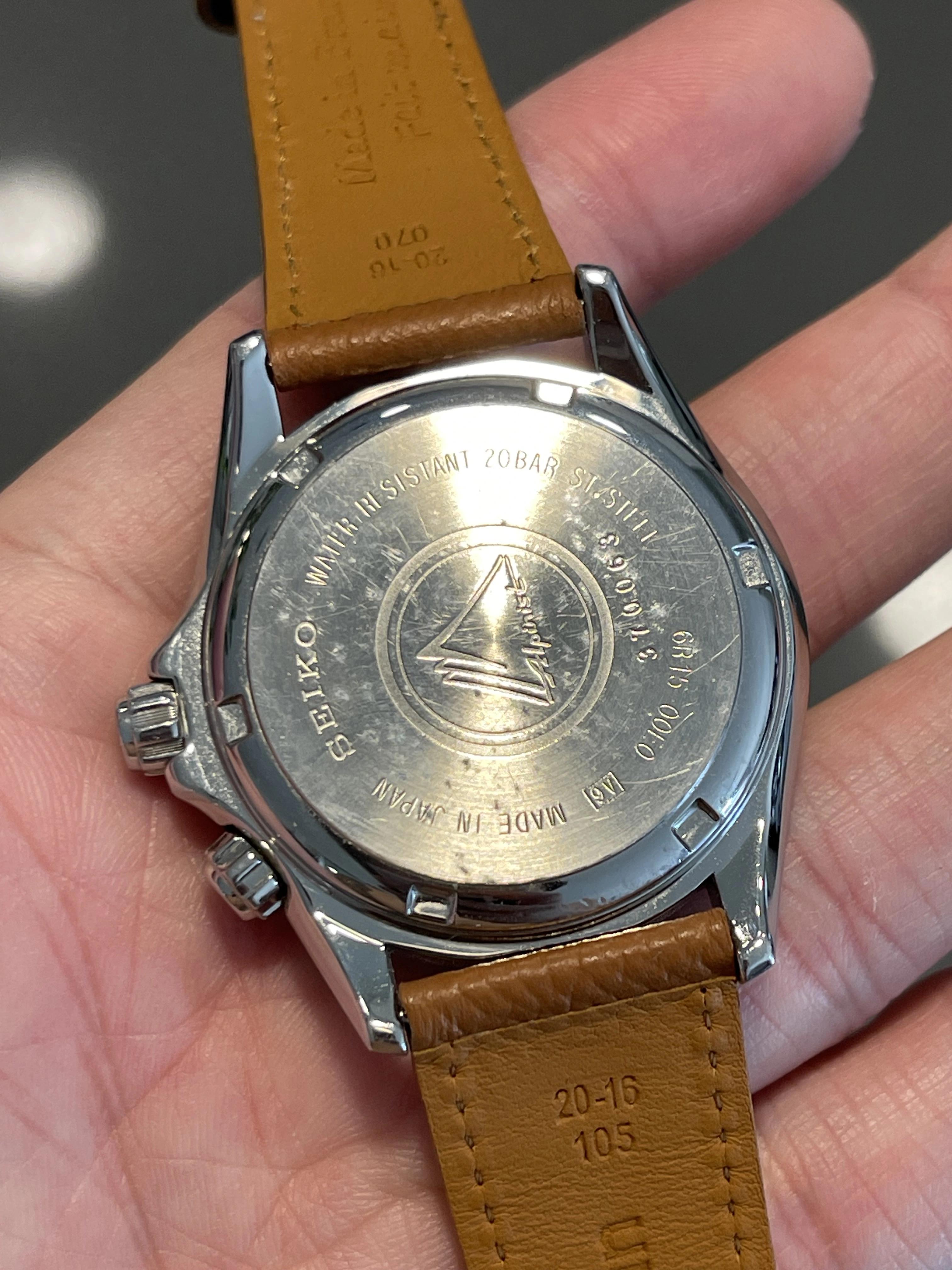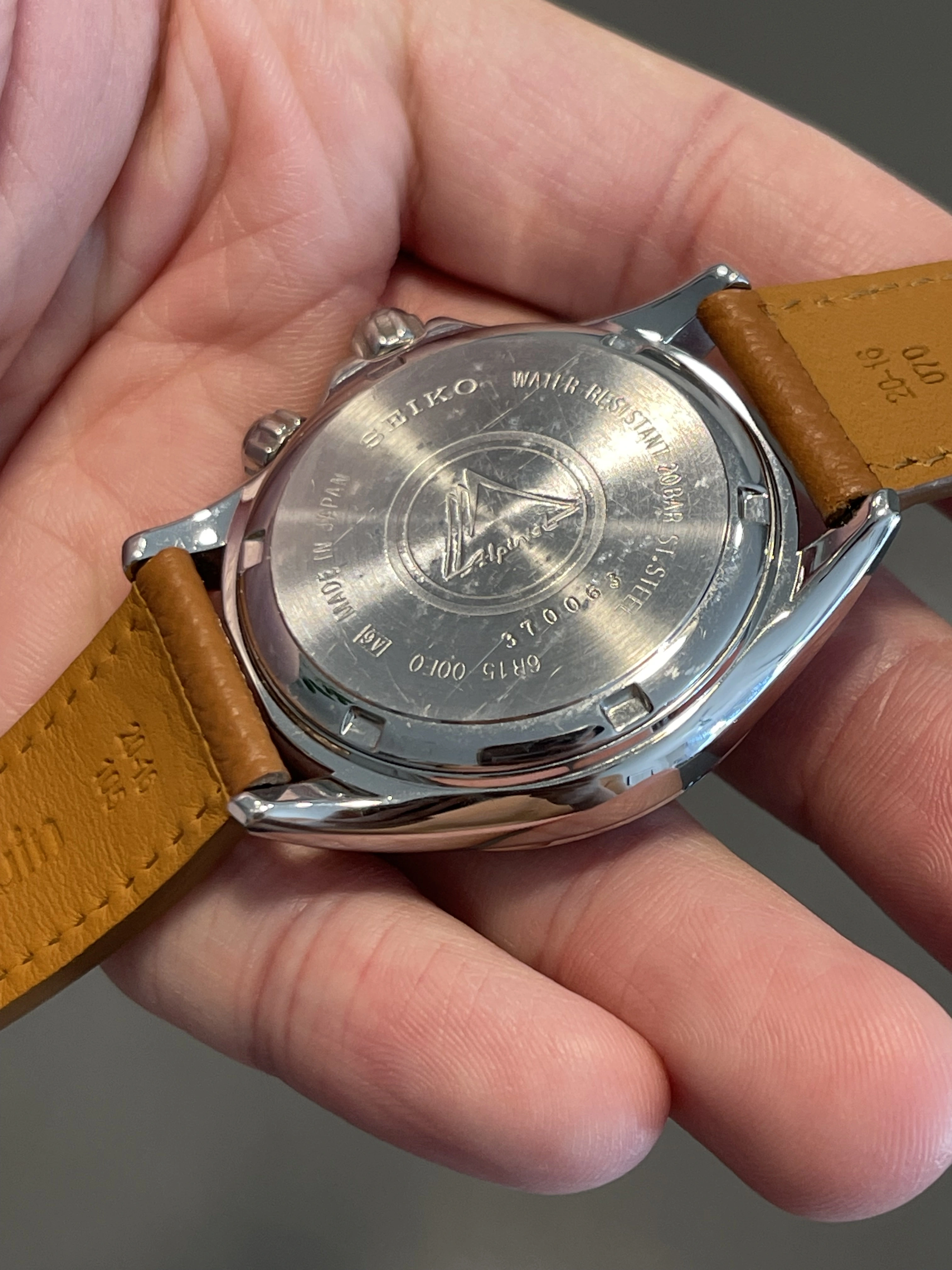 Iconic reference before Seiko introduced the current Alpinist collection. Complete overhaul in October 2024 (warranty/service card included in sale). Passed water resistance test and running strong with all original factory parts. I opted out of refinishing to keep the case unpolished with original bevels. Comes on a honey brown calf strap from Molequin. Green NATO included.