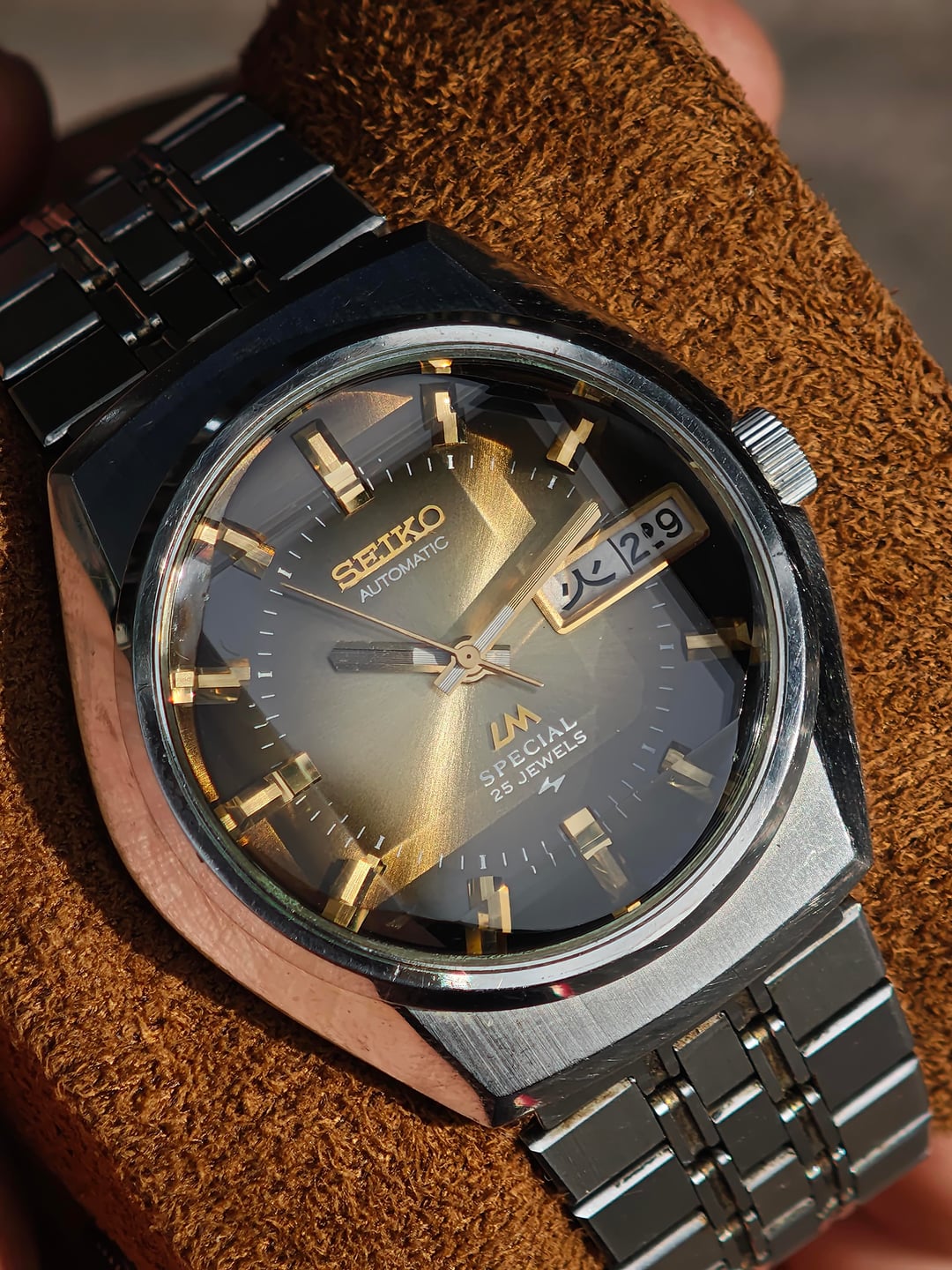 Up for sale is a Seiko Lord Matic Special 5216-7050R from the mid-1970s. Condition: Excellent vintage condition, all original Movement: Cal. 5216 automatic, 25 jewels, hi-beat 28,800 bph, hacking + hand-wind, bilingual day/date Dial: Stunning sunburst gradient brown/gold with faceted hardlex crystal, plays beautifully with the light Case: Sharp stainless steel 70s angular design, approx. 36–37mm Bracelet: Original Seiko bracelet included This LM Special sits above the regular Lord Matic line, featuring one of Seiko’s finest mid-high grade movements of the era. A perfect mix of Japanese watchmaking history and 70s design. 💲 Price: $450 shipped (includes tracked worldwide shipping) 💳 Payment: PayPal F&F or G&S (+4.6%)
