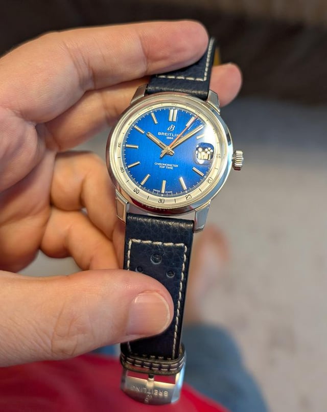 **Breitling Top Time B31 Blue** Model AB3113A71C1X1 **Breitling Warranty** \- Does Not Expire Until **April 2033** Size - 38mm Water resistance - 100m Power Reserve - 78 hours OEM Leather Strap Lug width - 20mm Sapphire Crystal with excellent AR Watch still has original protective plastic along the sides of the watch (that's also what those small plastic tabs are on the back of the lugs) Only marks on the watch that I can see are on the back of the watch from a strap change **Price**: $4650 by Zelle, wire, or PayPal F&F. No trades please.