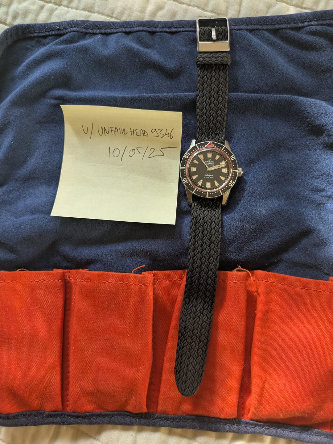 Hi everyone, new to selling watches but not new to the hobby. Intro I have a c.1960 Enicar Sherpa Diver Ultrasonic 600 for sale. It's the 36mm case variant, serial 39XXXX. The ANXS lettering on the back indicates the following A= Automatic, N=Sherpa case, 100% water resistant to 20 atm 200 m water depth, X=Rotating bezel and S=Sweep second. This is the early, and much more rare, two external bezels and single signed crown version. Scalloped beyonet style caseback with "Seapearl" marking and "clover" shaped early caseback Enicar logo. Condition The watch is in very good worn condition. The dial text is crisp and exhibits great luster, the radium lume markers have an even patina and show no lume loss. The hands show some moderate lume loss but otherwise in good condition. The two bidirectional friction fitted bezels spin freely and show minor use marks but no dents or gouges. The 17 jewels automatic Enicar AR-1034 movement with a signed rotor is presented in brass (early pre rhodium plating example). The watch has just received a full service which included mainspring replacement. The watch 3hz movement is running at +4 sec per day with healthy amplitude and beat error. Service paperwork will be included in the sale. The case retains all of its original facets and appears to never have been polished. No major gouges or nicks are present but please study the photos. The acrilic crystal presents as original with wear marks consistent with age. I elected not to have the crystal polished in case the new owner wanted to retain its original nature. That said, there are no deep scratches so it could be polished up. The watch will come on an afternoon steel bracelet (Chinese made, nothing special but comfortable fits 7.25" wrist) likely dating to the 80'/90' as well as a brand new Holben Watch Straps two piece perlon. Original crosshatch crown with the Saturn logo. Price is $2250 inclusive of insured USPS Ground shipping anywhere in the continental US. Can ship abroad but the buyer will need to cover the additional cost of shipping. Payment method is Venmo only. I appreciate this is my first transaction here so happy to answer any questions to make sure the buyer is comfortable with the legitimacy of the transaction! Grail watch availability forces sale.