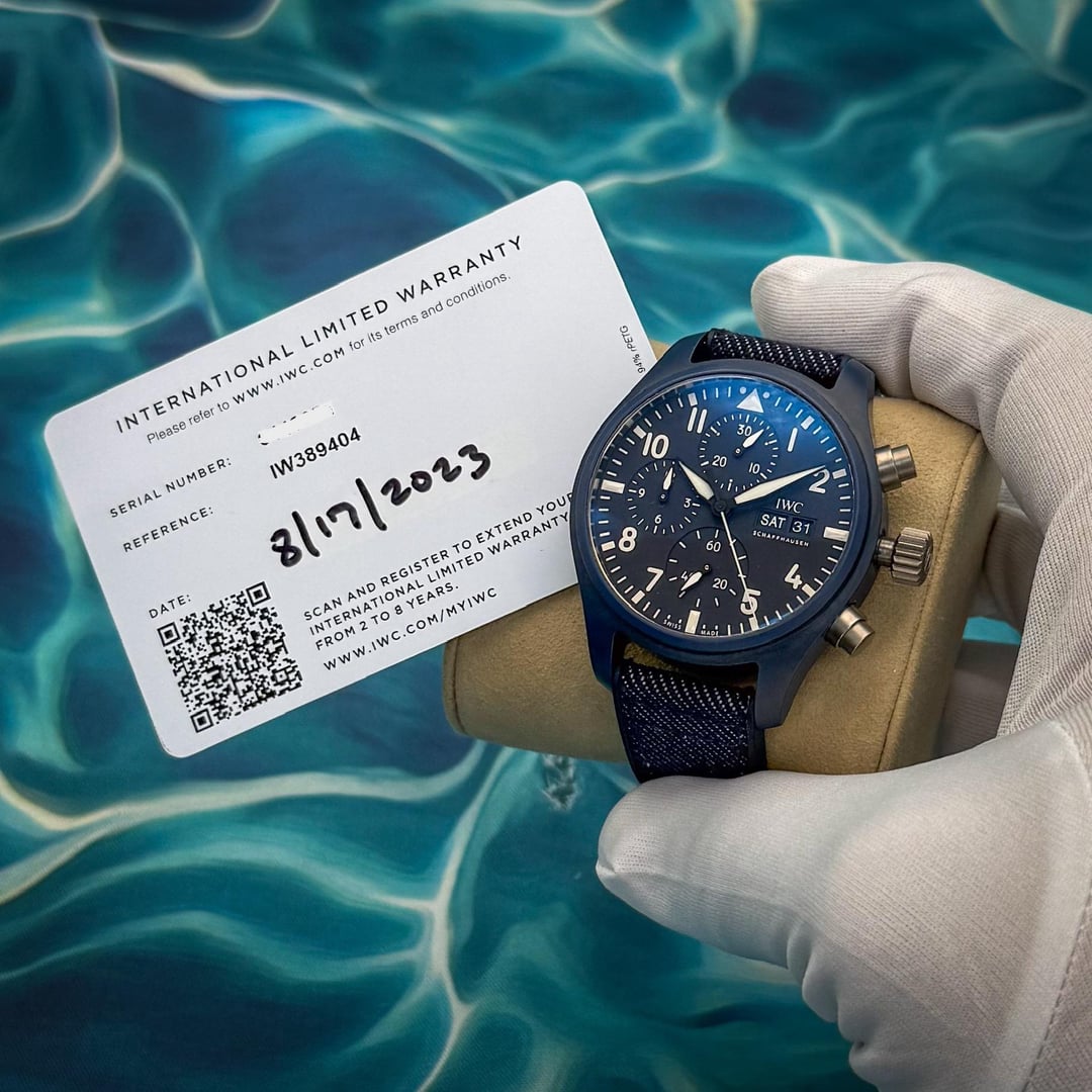 A short video of this watch: [https://youtu.be/CZu3naF6hmY](https://youtu.be/CZu3naF6hmY) The Pilot's Watch Chronograph TOP GUN Oceana Ref: IW389404 simply enraptures with a bold blue ceramic case in a 41mm case and a monochromatic design. CONDITION: The watch is in very good pre-owned condition with little to no signs of wear on the case and strap. Crystal is super clean. Please refer to photos as they’re an accurate depiction of the condition of this timepiece. Comes with: * Watch * Triple boxed * Warranty Card (8/17/2023) * Instruction manual * Branded polish cloth * Hang tag **PRICE: $7,498** (free shipping at asking in ConUS) Each of our watches are thoroughly inspected to ensure they’re up to industry standards, then carefully packaged with bubble wrap, and shipped fully insured via FedEx Priority Overnight to your nearest FedEx shipping hub. We have dozens of references on multiple platforms, so deal with absolute confidence. Timepieces are an incredible accoutrement to our lifestyles, so we strive to accurately display all of our watches’ exact condition in our photos/videos and take pride in being very customer service oriented. Our goal is to have 100% positive and smooth transactions, so please feel free to reach out if you have any questions, and thanks so much for checking out our listing!