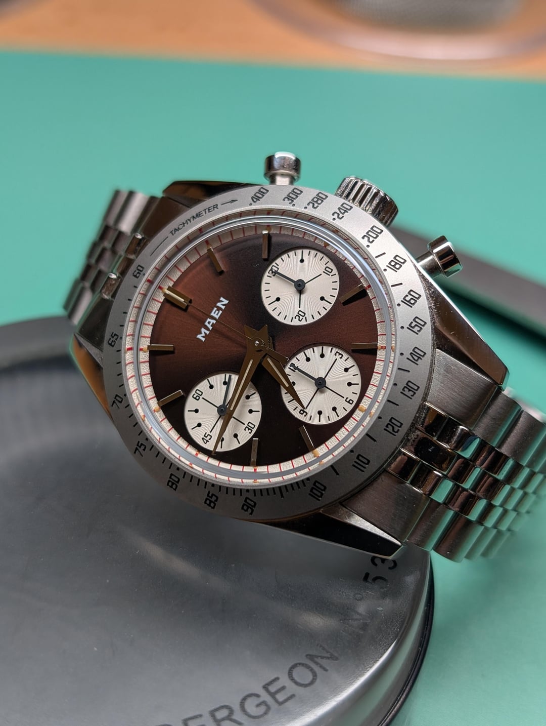 For sale today is my Maen Skymaster 38 Watchfinder edition. This is a collaboration between Maen and Andrew Morgan at Watchfinder. The watch features a unique rich brown dial with Paul Newman Daytona inspired subdials. This piece is numbered #78/80. The watch was only worn sparingly since purchase and is in excellent condition with only minor signs of wear. The top grade sellita sw510 is keeping good time with strong amplitude. Timing results are included. The watch also passed a quick water resistance check. The watch will include its original packaging and an extra maen tropic style strap. I'm asking $1899 shipped CONUS for this piece. International shipping at buyer's expense. PayPal G&S is available at my discretion. Thanks for reading!