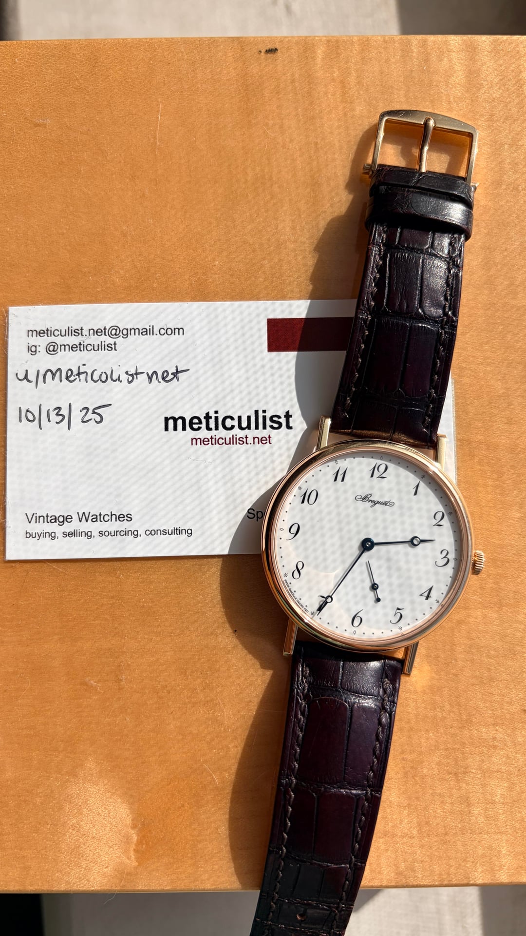 The Breguet Classique 7147 with Grand feu enamel dial is, quite possibly, one of the most objectively beautiful modern watches, and almost certainly so from Montres Breguet modern production. It’s almost wild how classically, distinctly, and traditionally “Breguet” this watch is with the distinct Classique case shape, Breguet Pomme hands (deep blued of course), hand painted fleur de lys hour markers and whimsical minute track, and, of course, Breguet Arabic numerals; it’s a sort of classism meets romanticism and whimsy that attracts so many to the storied brand (that’s often missing those characteristics in modern production).Only its 40 mm diameter and ultra-thin, offset rotor automatic movement with ant-magnetic silicon balance spring remind you this is the Classique for the modern era. As much as I love guilloche, and Breguet guilloche dials in particular, the “Emaille Grand Feu” has a depth, richness, and idyllic, head-in-the-clouds feeling to it that I can really only describe as romantic, it gives you the warm and fuzzies for sure. As per usual, Breguet provides a masterclass in negative space; in what should feel like a sparse, overly white dial, is a perfect backdrop to the rich blued hands and impressive, subtly stepped subsidiary seconds dial, showcasing the dial as a single piece with the fine transition. Case: The 40 x 47.7 x 6.5 mm 18K rose gold case is in excellent condition throughout exhibiting only very minor surface swirls as pictured. The case is unpolished with all hallmarks crisply intact. Dial: The “Grand Feu” enamel dial is a single piece with rich enamel finishing the entirety, including the subtle transition to the slightly sunken running second’s hand. The Arabic Breguet numerals and hour and minute markers are hand applied in subtly raised black enamel adding further contrast and richness. The dial and Breguet hands are free from any imperfections. Movement: The Caliber 502.3 SD is a hand decorated, ultra-thin, off-center rotor automatic winding movement with a 45-hour power reserve and thickness of just [2.4mm.It](http://2.4mm.it/) is winding, setting, and running smoothly at approximately +1 s/d, averaged across 6 positions. Strap: The watch is presented on a factory short length brown alligator strap with matching rose gold pin buckle. An additional greenish-taupe standard-length strap is also included, in very good condition. Includes: Outer cardboard box, inner wooden box, all booklets, manuals, and guarantee that is undated due to online sale when new. Price: $14,500 USD including insured FedEx shipping from Phoenix, AZ to a FedEx office location or commercial address within the continental US, international shipping available at cost based on location. Payment by ACH or wire, no trades please. I have all positive references here, forums, C24, and Instagram (@)meticulist Thanks mods for the space.