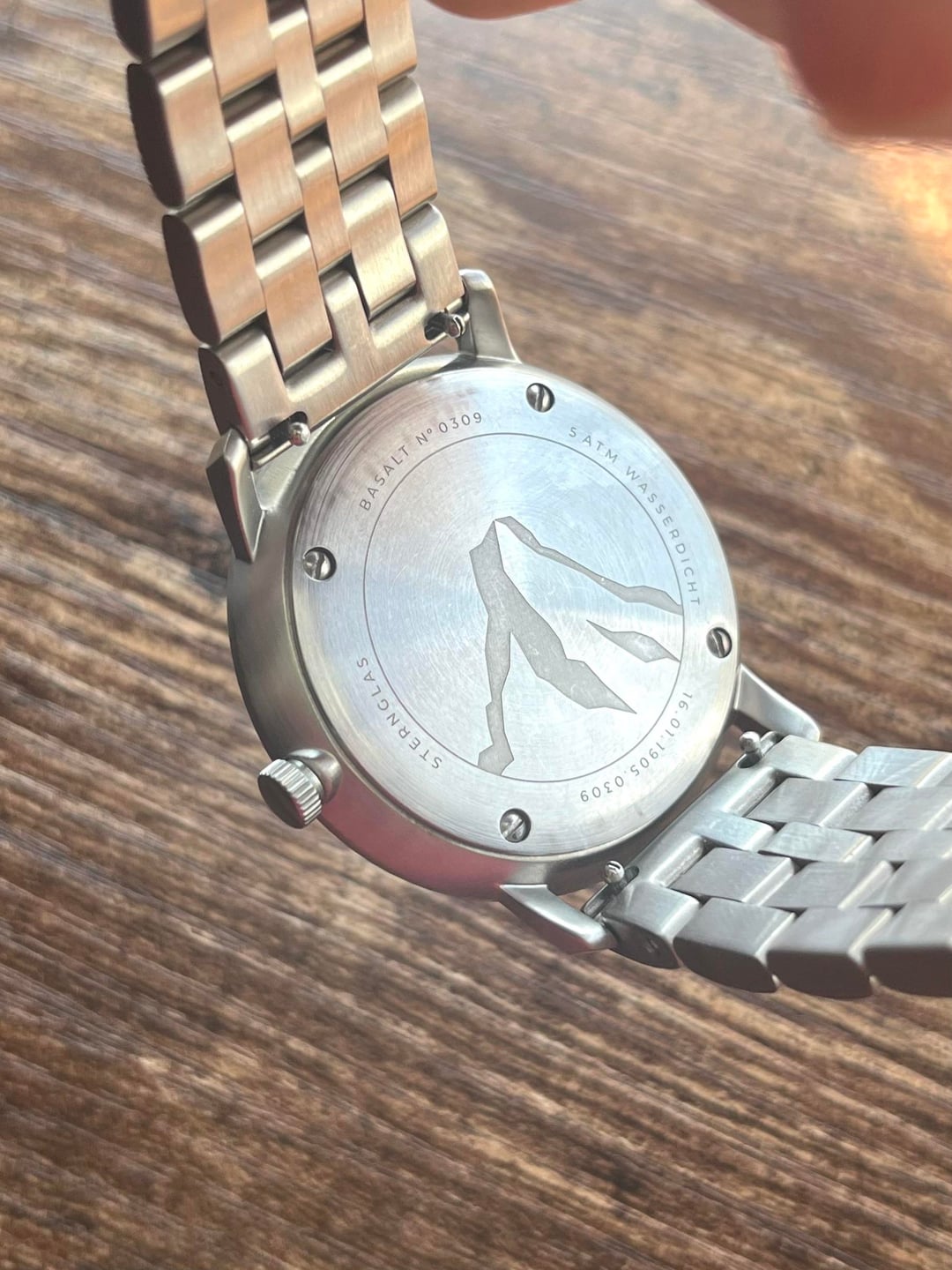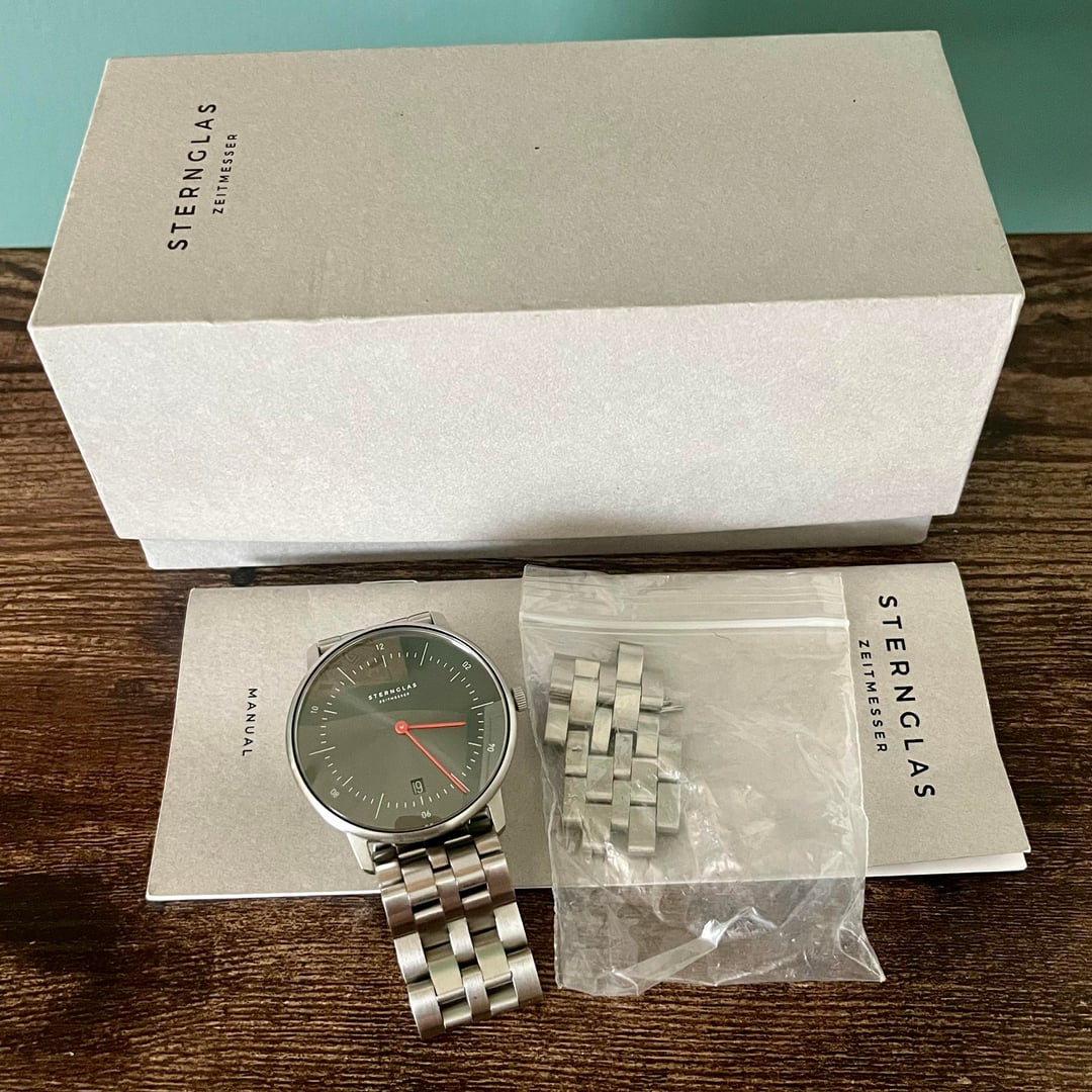 Up for sale is a special 2019 edition of the Sternglas Naos model called the “Basalt.” This quartz two hander has a stunning sunburst anthracite dial with contrasting red/orange hands. This model also differs from the standard Naos because of it has a brushed case and 5-link bracelet (with QR) with a butterfly clasp. Watch is in excellent shape and sure doesn’t look like it’s 6 years old. Only signs of wear are on the case back from a NATO strap. Includes all original accessories including the paperwork, inner and outer boxes, and bracelet with full links. __[Video](https://imgur.com/a/CS7VUcU)__ __[Info](https://www.sternglas.com/pages/naos-basalt-content-landing?srsltid=AfmBOoptHConSZaAfbEHCC5_MC4MsrbntZcDuZkhS3G7UYysbuO8axw6)__ - 38mm case diameter - 41mm lug to lug - 20mm lug width - 6mm thick including domed crystal $299 shipped to CONUS via Zelle, Venmo, or PayPal. Thanks!