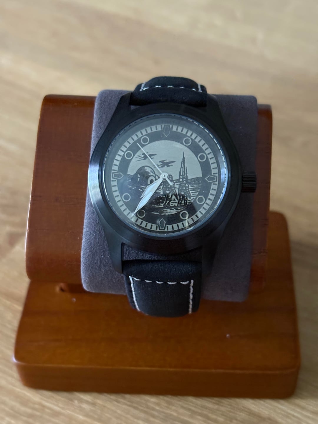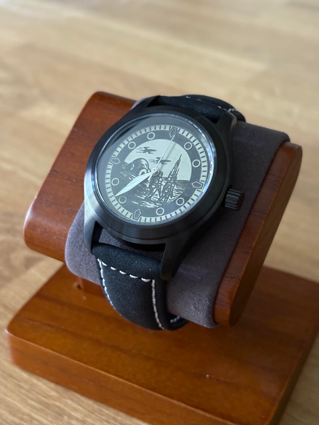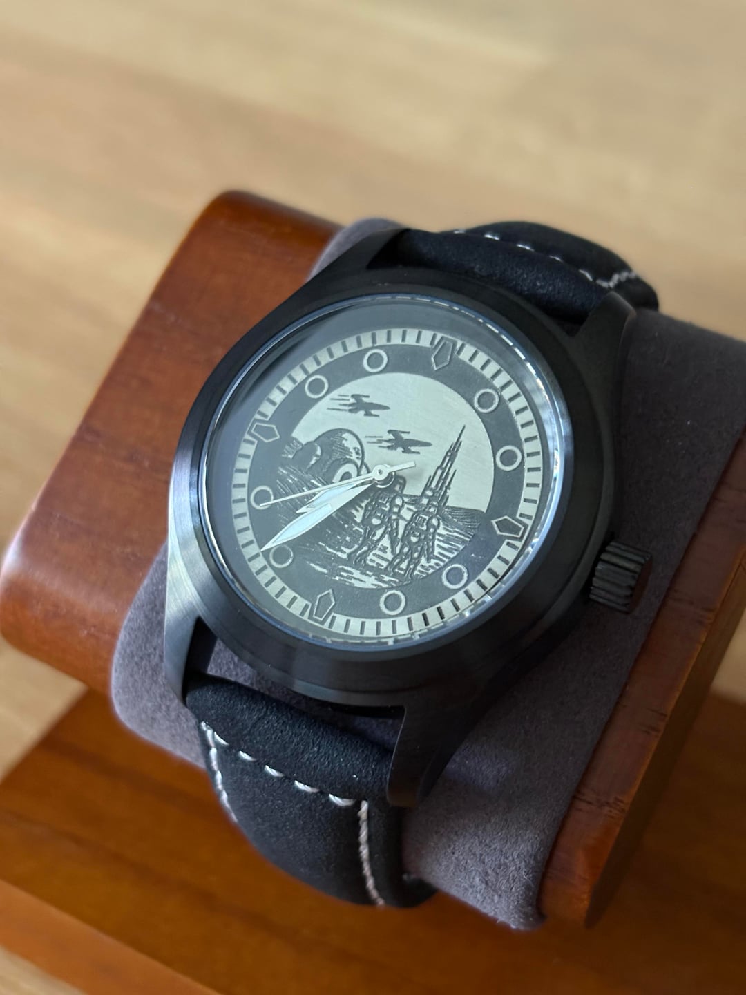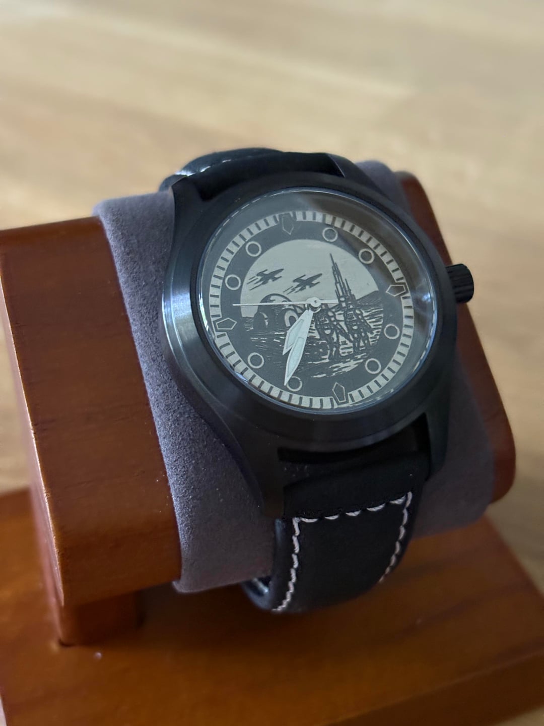 Hi WatchEx, Up for sale is a custom built Star Wars theme watch with a Star Wars scene depicting two Stormtroopers walking across a barren battlefield with a pair of X-Wing fighters flying overhead. These dials are cut from a sheet of jeweler’s brass using by laser, painted, hand-sanded and waxed. Watch will come with a watch travel pouch for safe keeping. Specs: - Movement: Genuine Seiko Quartz VH31 (sweeping seconds feature). - Diameter: 36mm - Glass: Sapphire Crystal - Caseback: Exhibition Caseback with Sapphire Glass - Material: Stainless Steel Black PVD coat - Band: Black suede/leather strap Price: $140 SHIPPED within CONUS Like what you see and the watch sold? Happy to make you another or customize a different piece for you! Feel free to DM me for a commission or follow my page for more examples of my work in Instagram: https://www.instagram.com/avilawatchco?igsh=MXh5OXh2bDFjb3h3NQ%3D%3D&utm_source=qr
