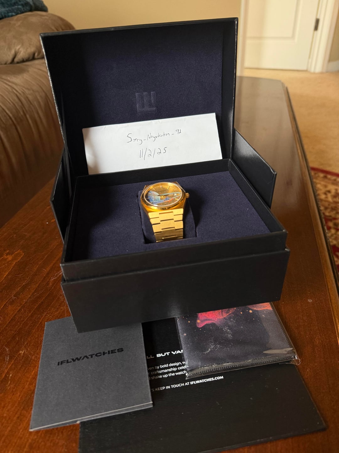 Up for sale today is this hand painted limited edition Tissot 40mm PRX Gold Surfer by IFL Watches. In unworn condition and only thing I did was size the bracelet and keep in the box. Comes with all boxes and paperwork with matching unopened cleaning cloth. Asking $950 via Zelle or PayPal Pictures and timestamp above