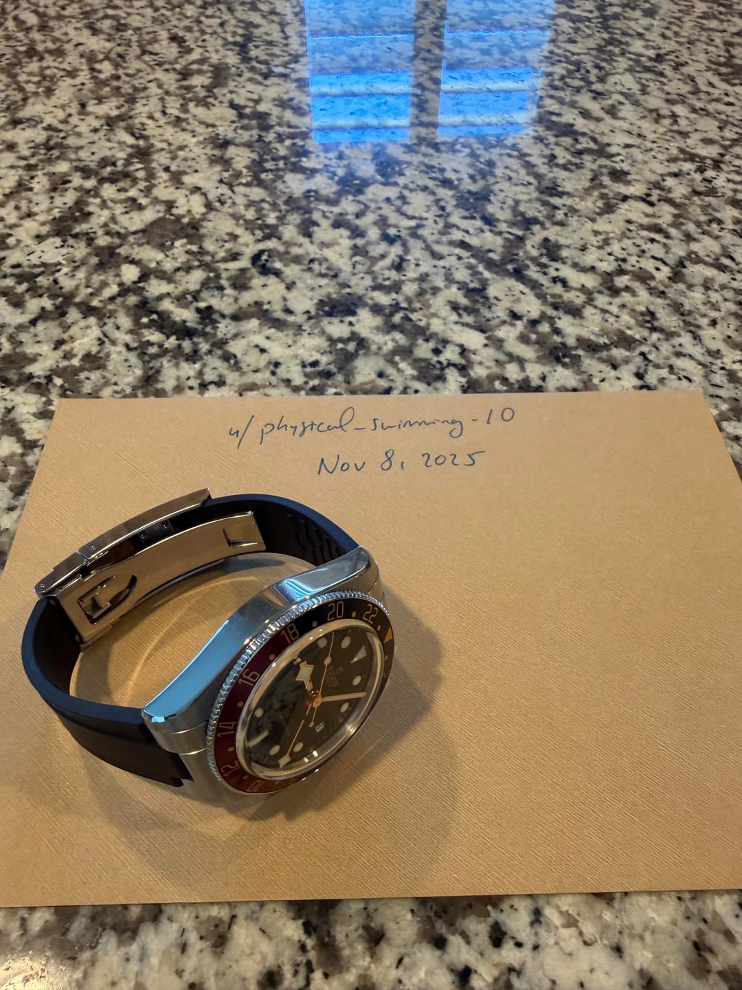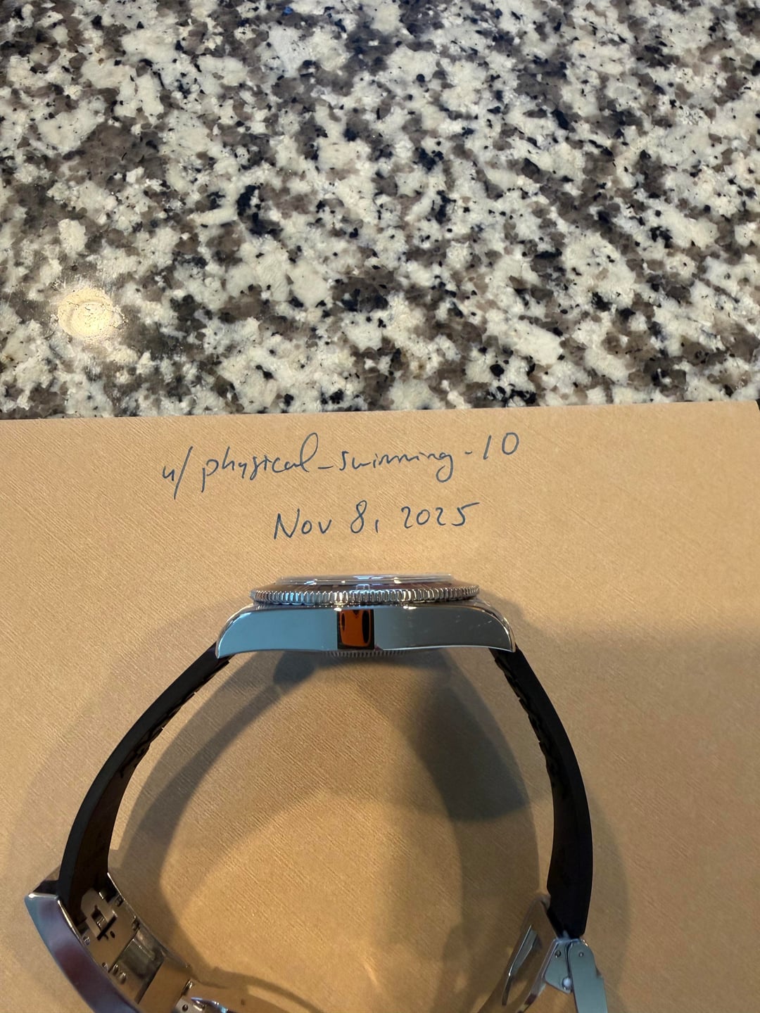Full set from AD, dated 2025. Case and bezel are mint, light swirls on clasp. Rubber strap cut to shortest length but half the clasp can be adjusted to add a bit of room, should fit 6,5" wrists. New straps from dealer are $175 if you have a large wrist.
