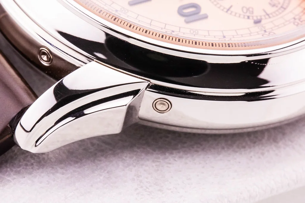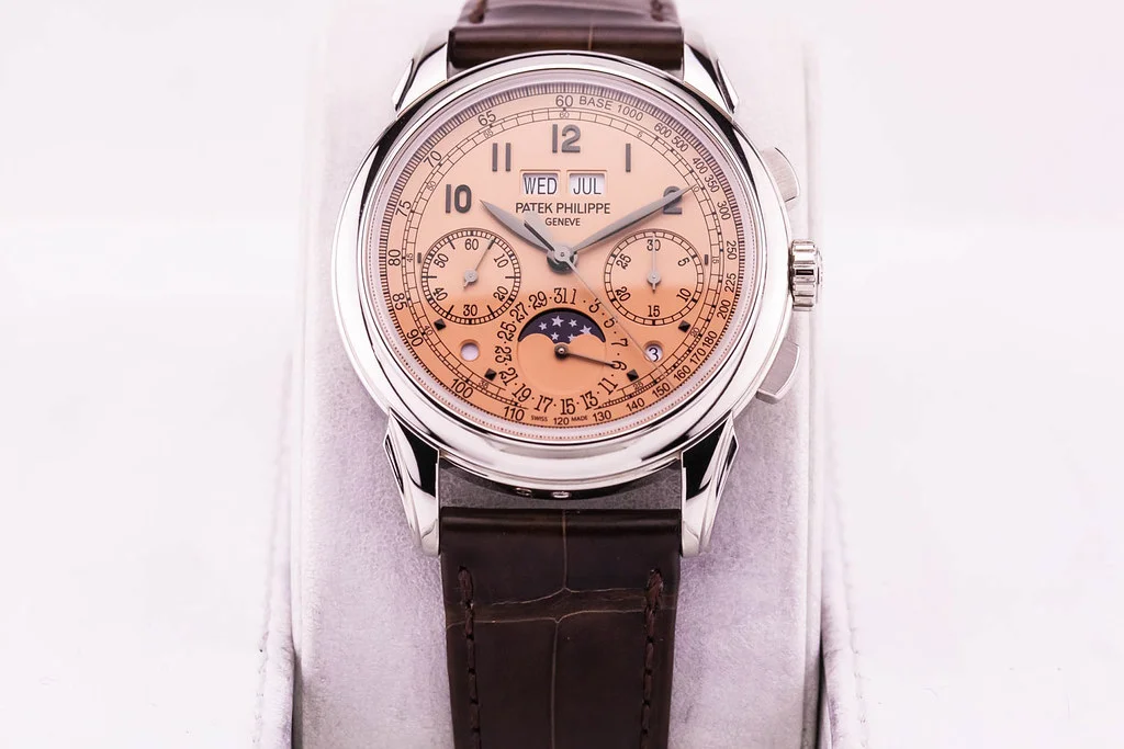 Up for sale is an excellent / near mint condition Patek Philippe Perpetual Calendar Chronograph Platinum 41mm Salmon Dial on Alligator Leather, reference # 5270P-001. It comes complete with all boxes, papers, booklets, and Patek Philippe Certificate of Origin dated August 2021.