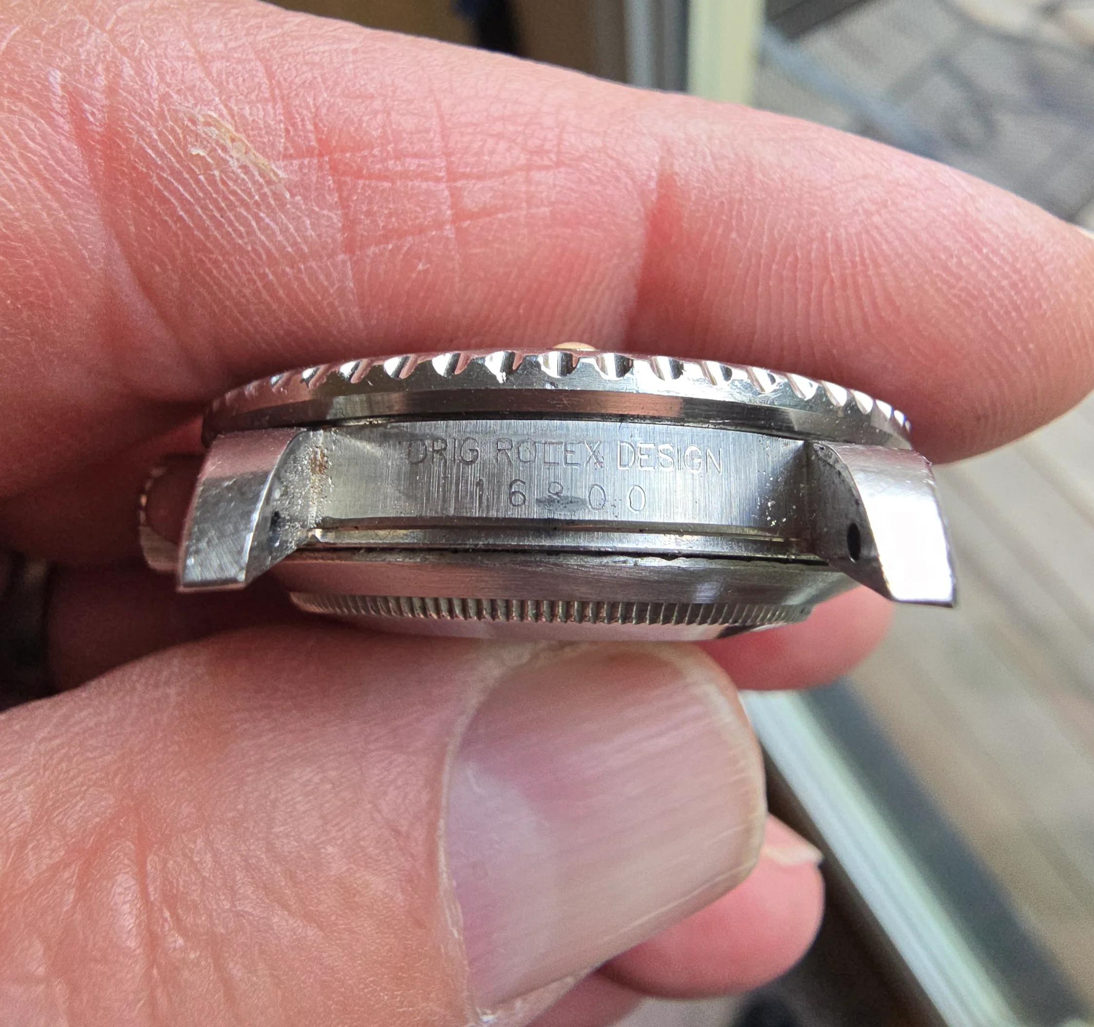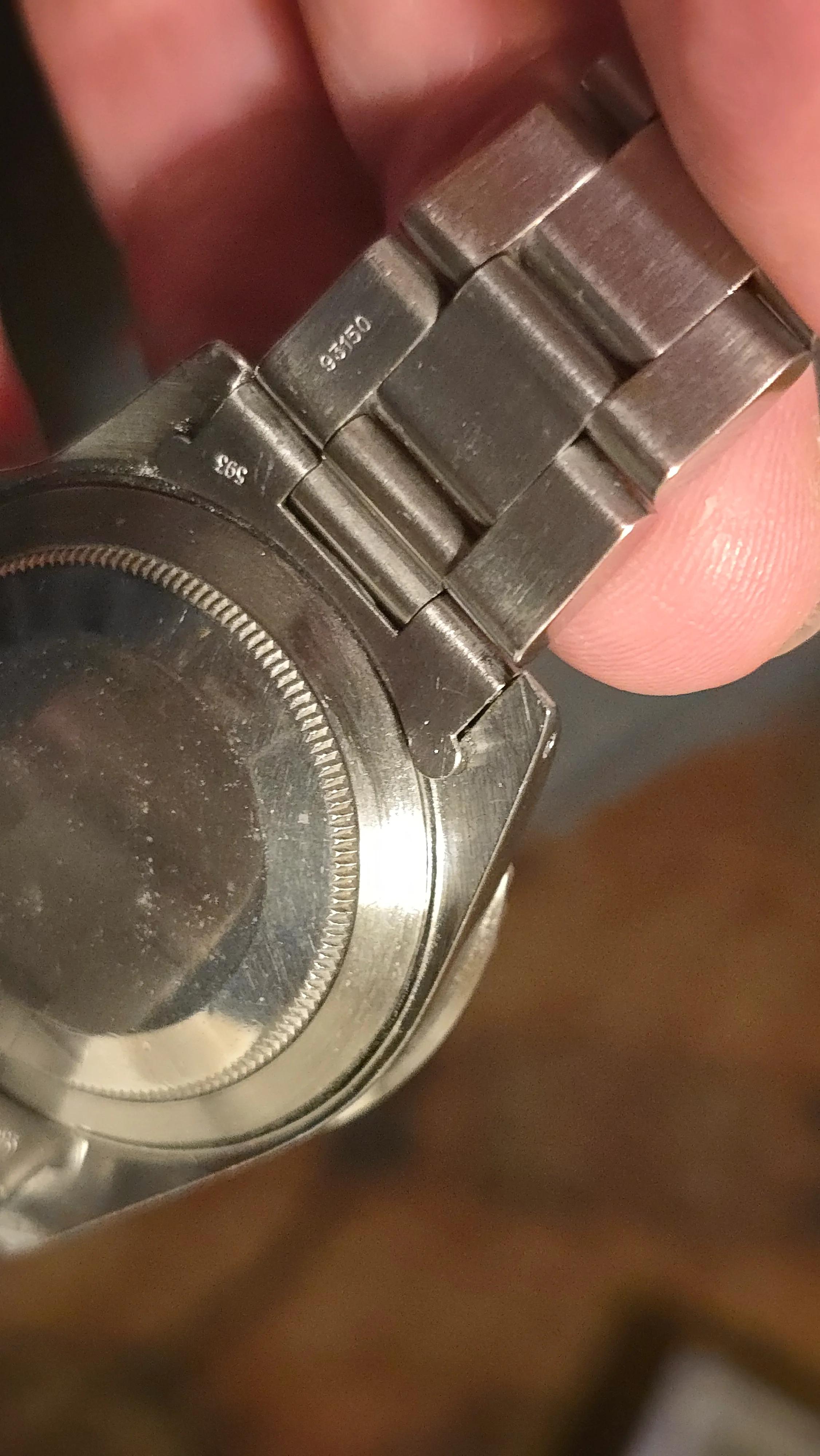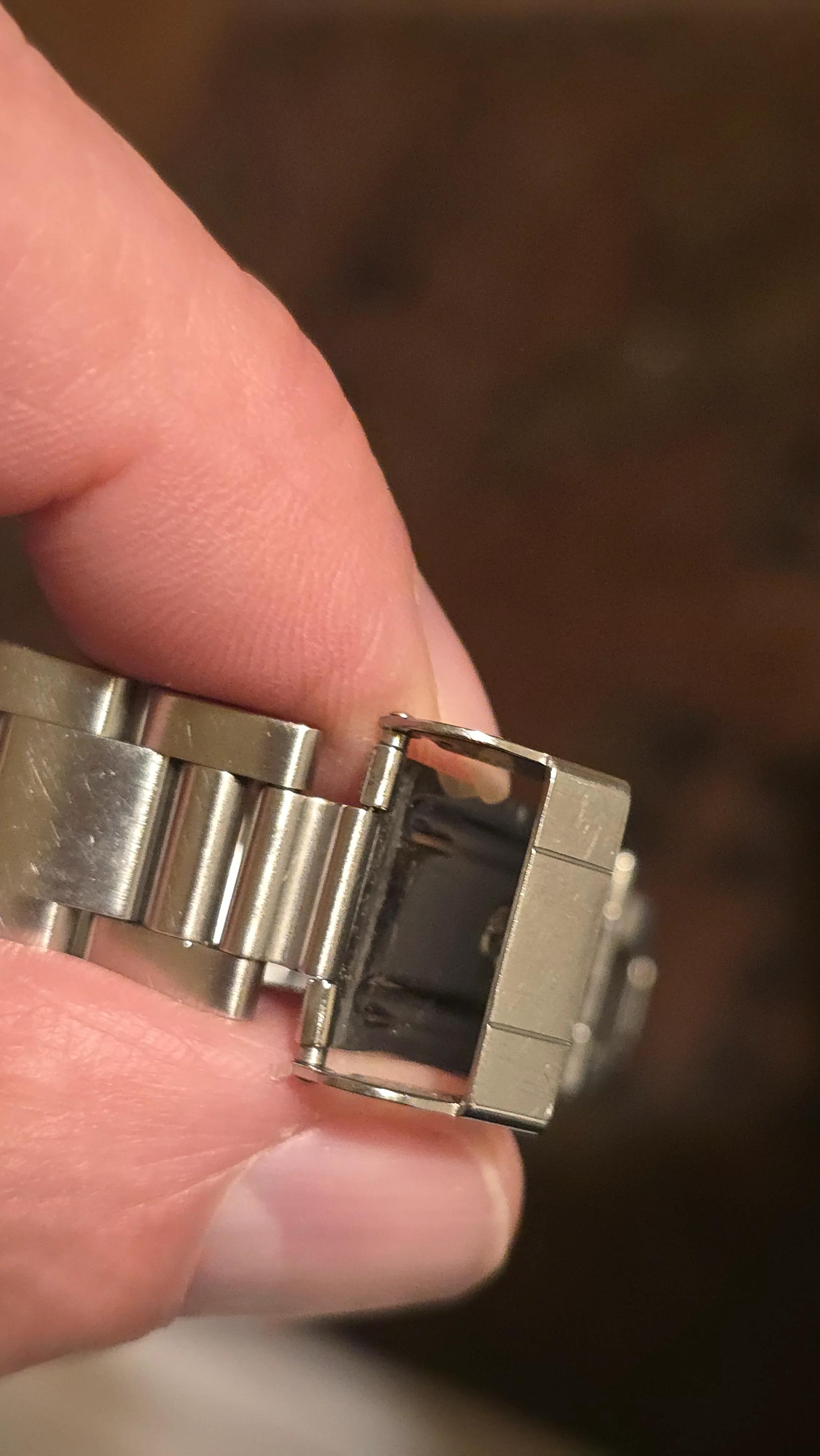 There are a lot of positives about this watch, which are clear in the photos. Here are the negatives. Note that a pin in the bracelet near the clasp is very worn. There's a photo of it. Also, the case looks worn but not polished up, which is good. But there's some pitting between the lugs. Also the rear of two lugs looks like they have polished swirls. There is also a funny brush mark on the edge of the case back in one spot (see photos). This is reflected in the price. The dealer who sold me the watch had it serviced but there is no warranty passed on. The movement photo is pre-service.