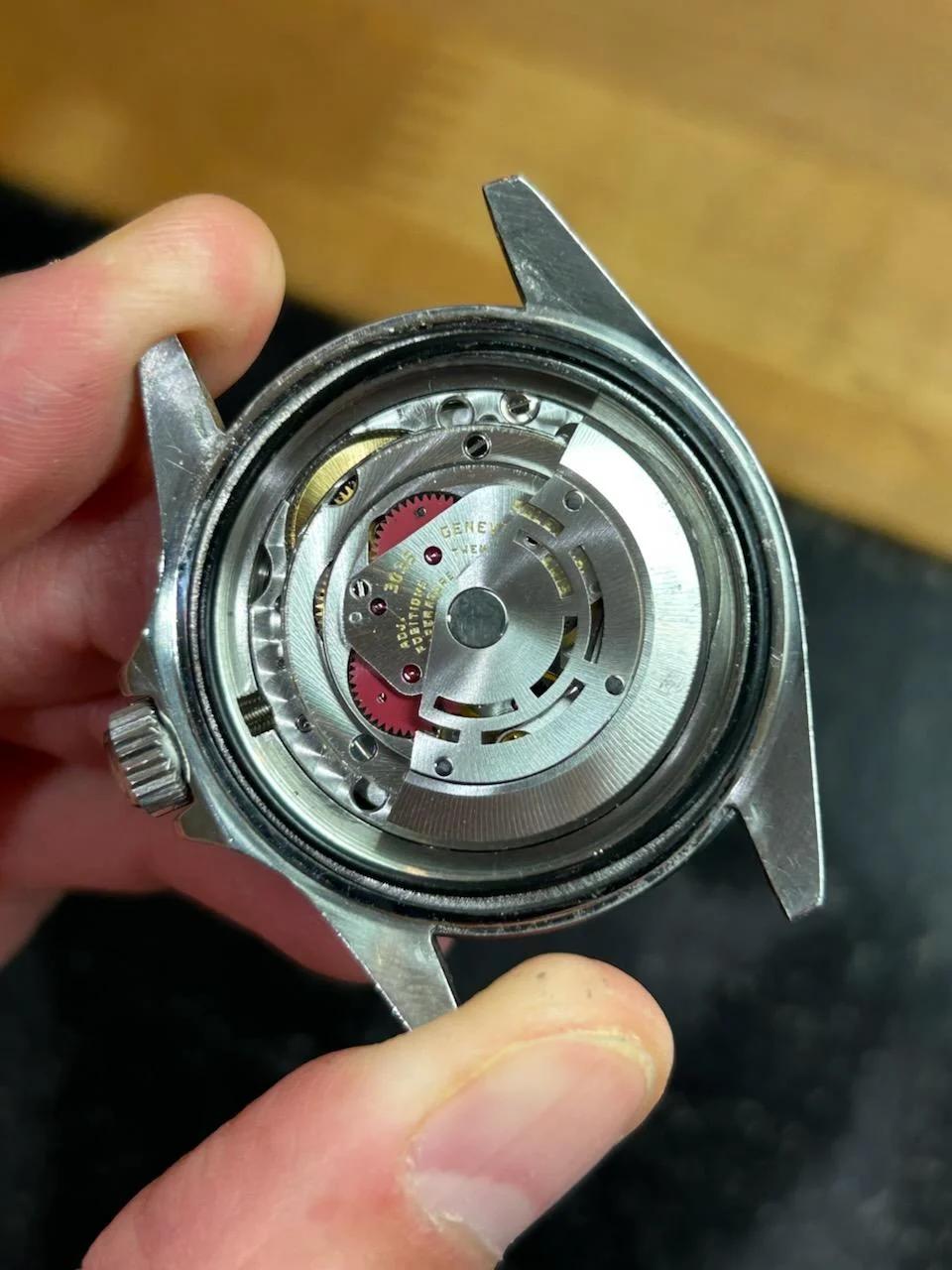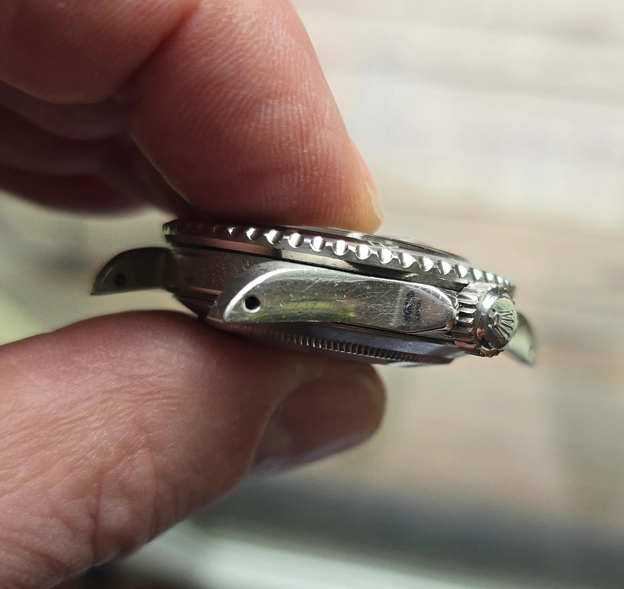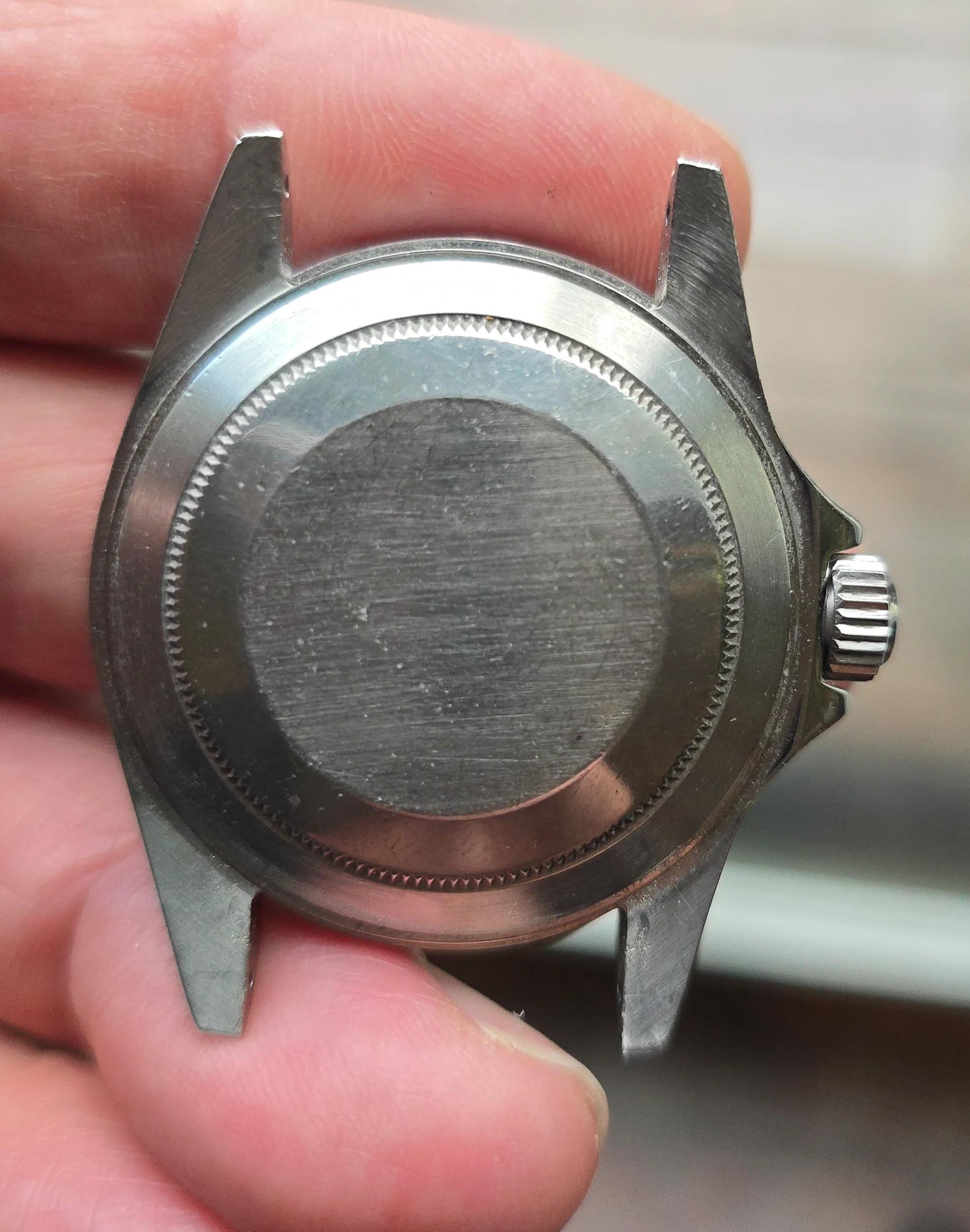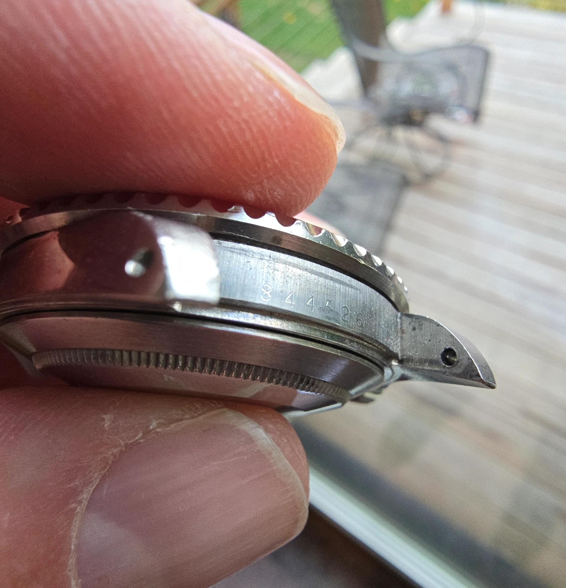 There are a lot of positives about this watch, which are clear in the photos. Here are the negatives. Note that a pin in the bracelet near the clasp is very worn. There's a photo of it. Also, the case looks worn but not polished up, which is good. But there's some pitting between the lugs. Also the rear of two lugs looks like they have polished swirls. There is also a funny brush mark on the edge of the case back in one spot (see photos). This is reflected in the price. The dealer who sold me the watch had it serviced but there is no warranty passed on. The movement photo is pre-service.